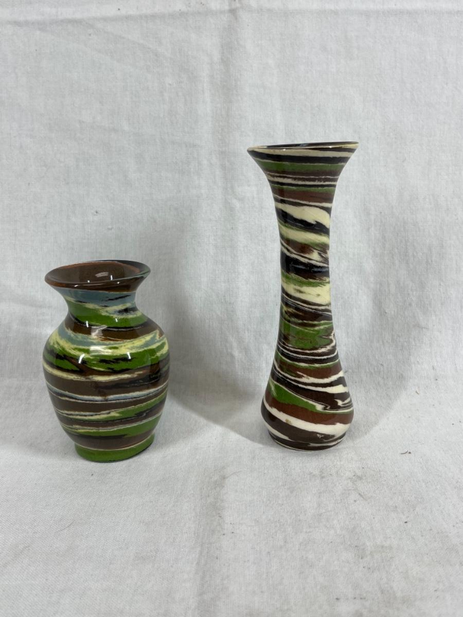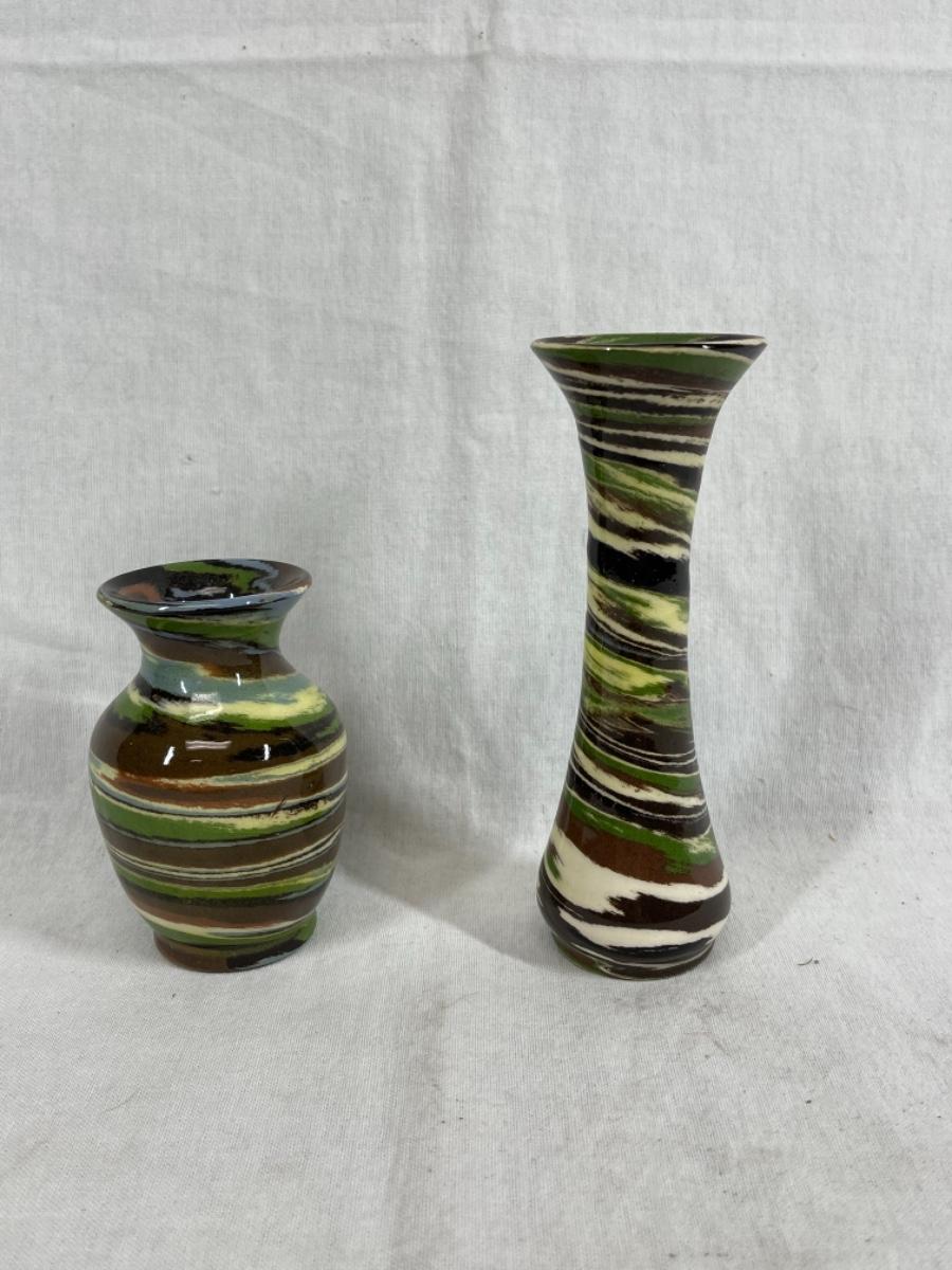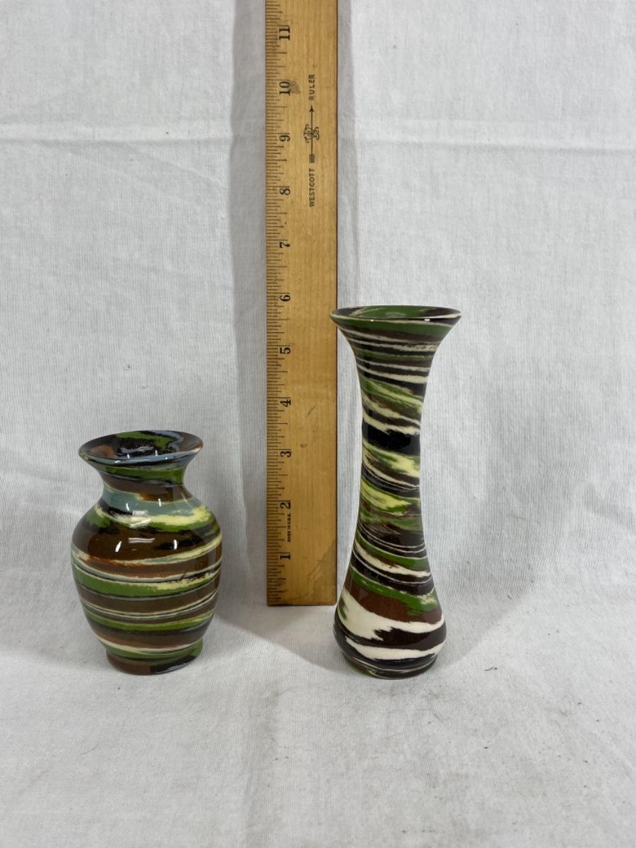 Pair of matching green/brown swirl glass bud vases. Good condition. Stamped on the bottom.
