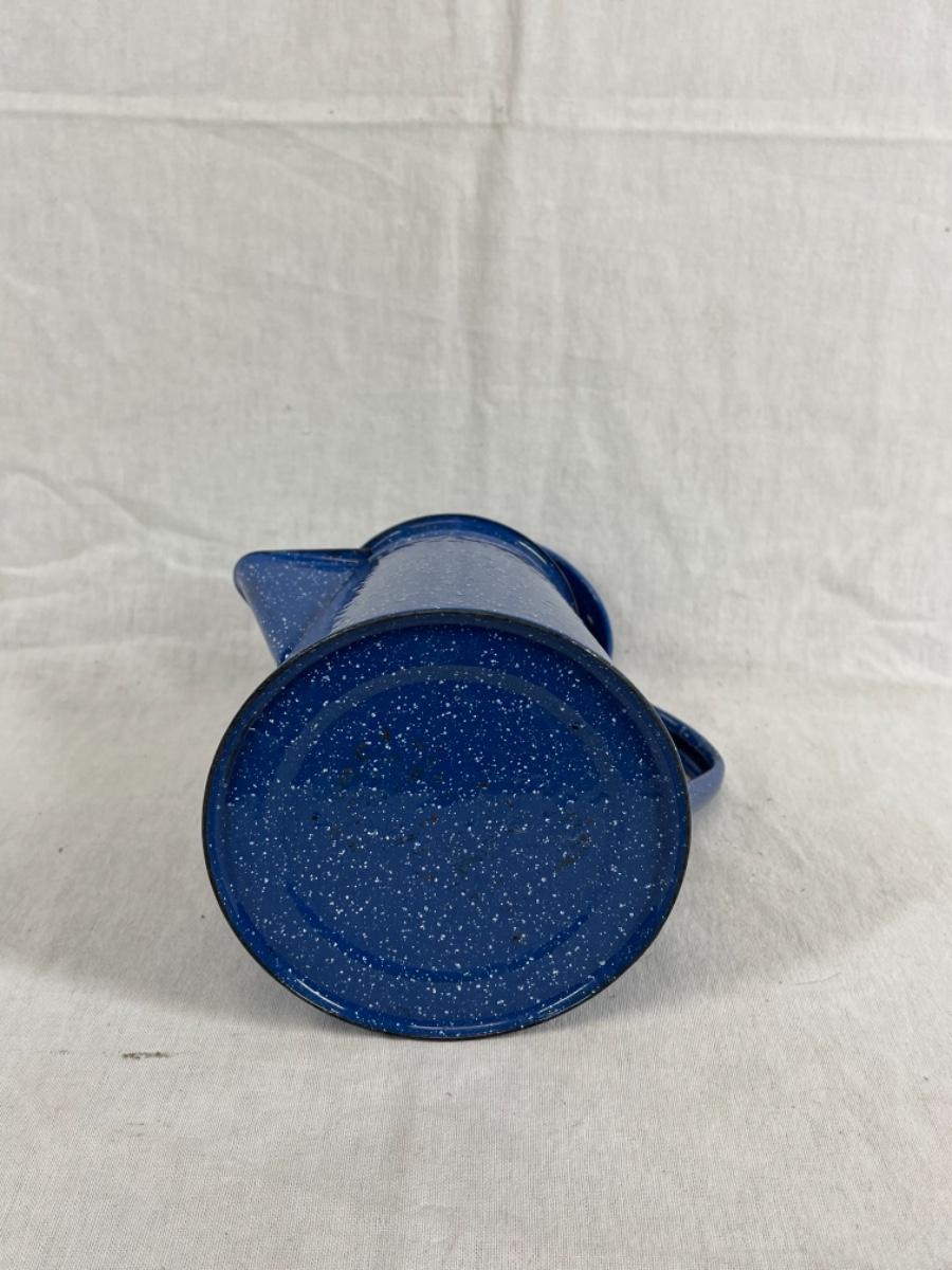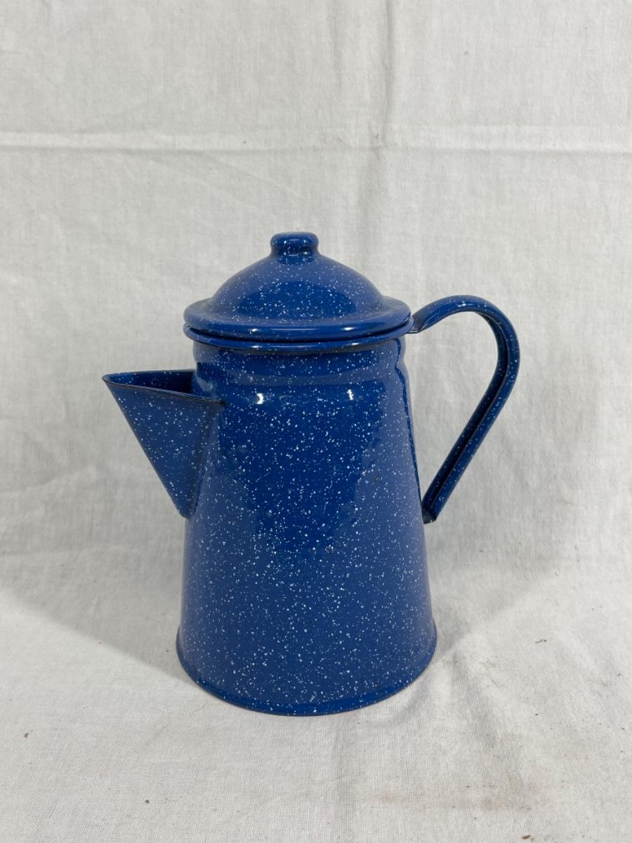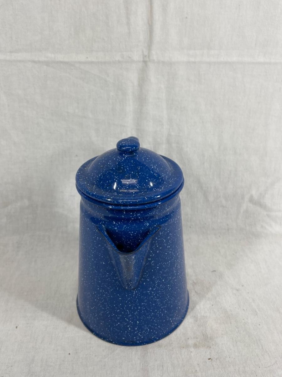 Blue with white speckle enamelware tea pot. Good condition, about 8" size.