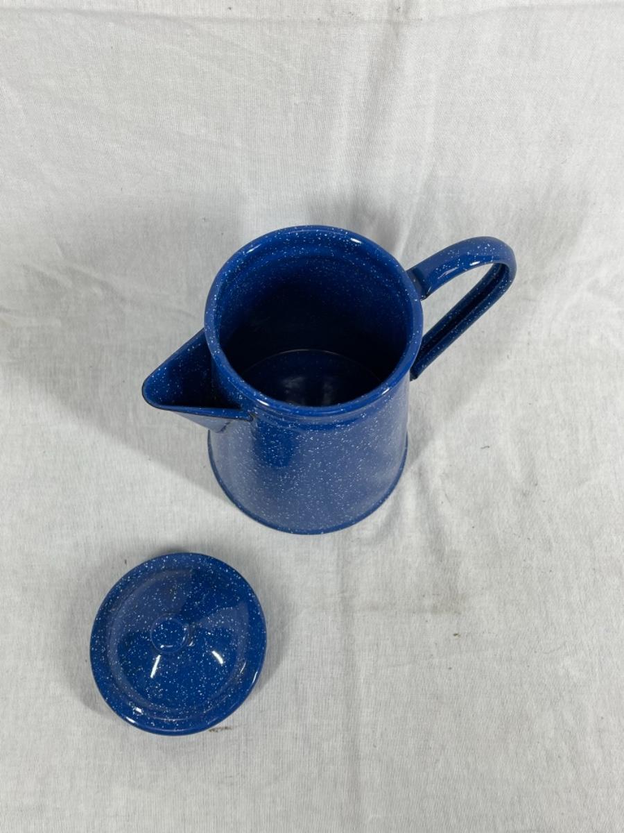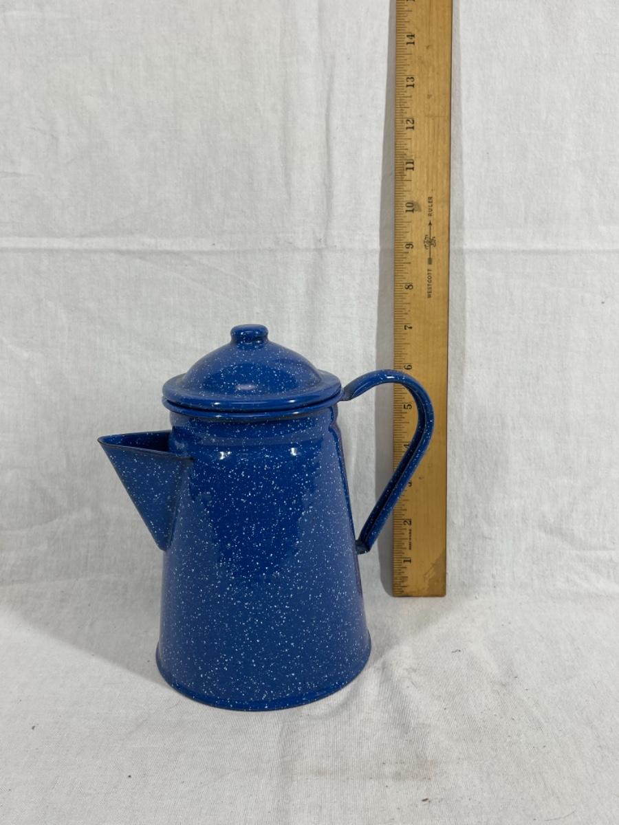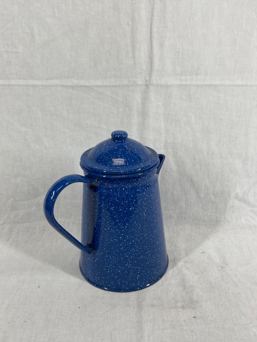 Blue with white speckle enamelware tea pot. Good condition, about 8" size.