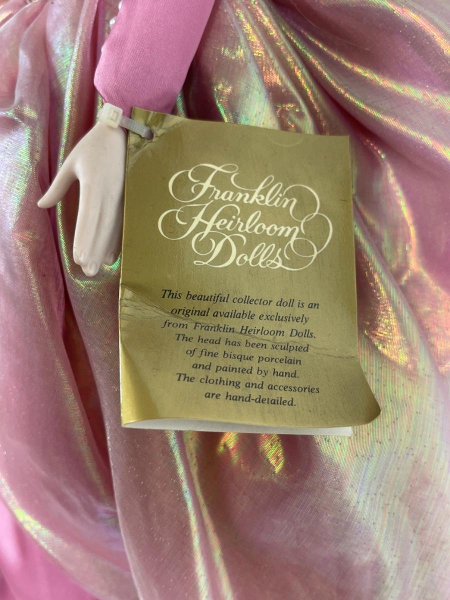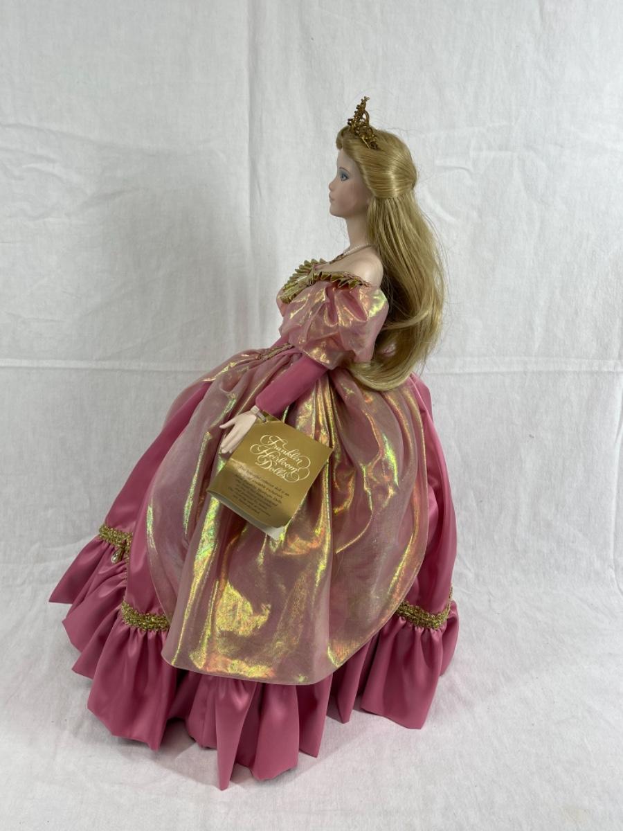 18" princess doll from Franklin Heirloom Dolls. Pink ball gown dress. Comes with stand. Good displayed condition.