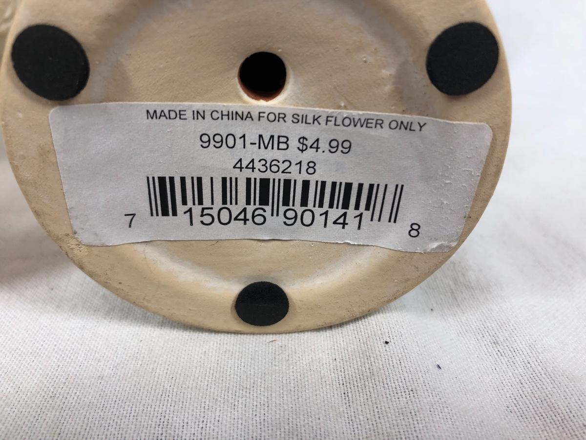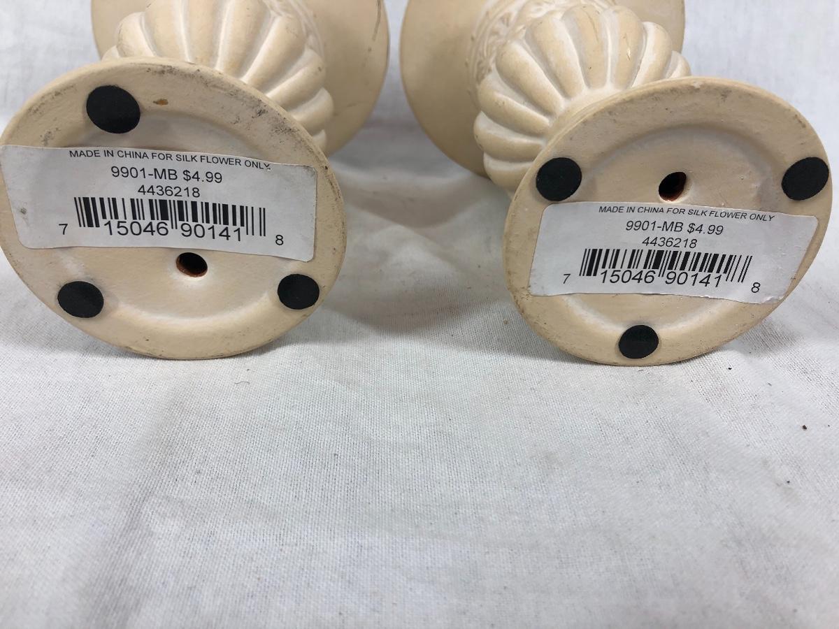 Matching pair of urn style planter pots. Ceramic, smooth finish inside with a weathered look outside. In good condition. Have barcode stickers still attached on the bottom. About 7" tall.