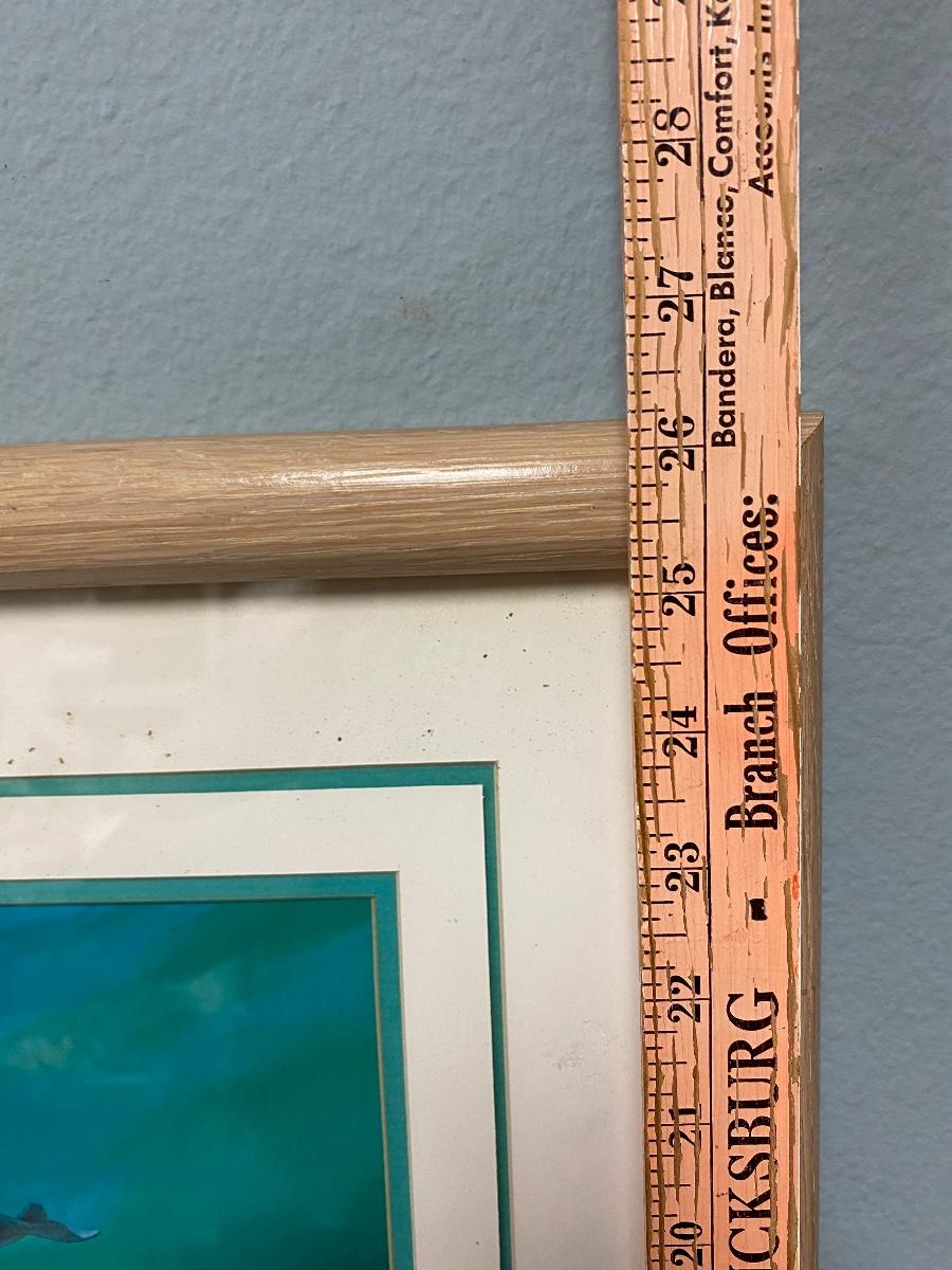 Large framed Wyland art lithograph. Original done in 1983. This print is signed twice at lower left. Features humpback whale and a dolphin. Measures about 33"x27". In good displayed condition.