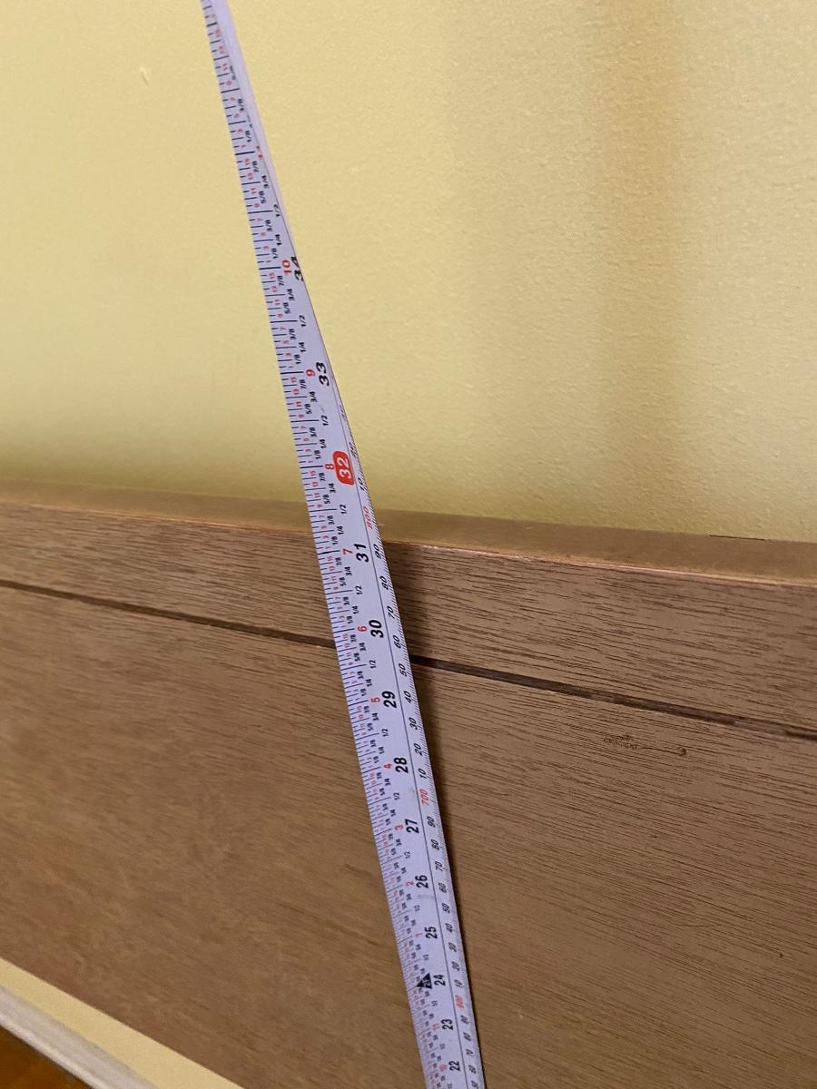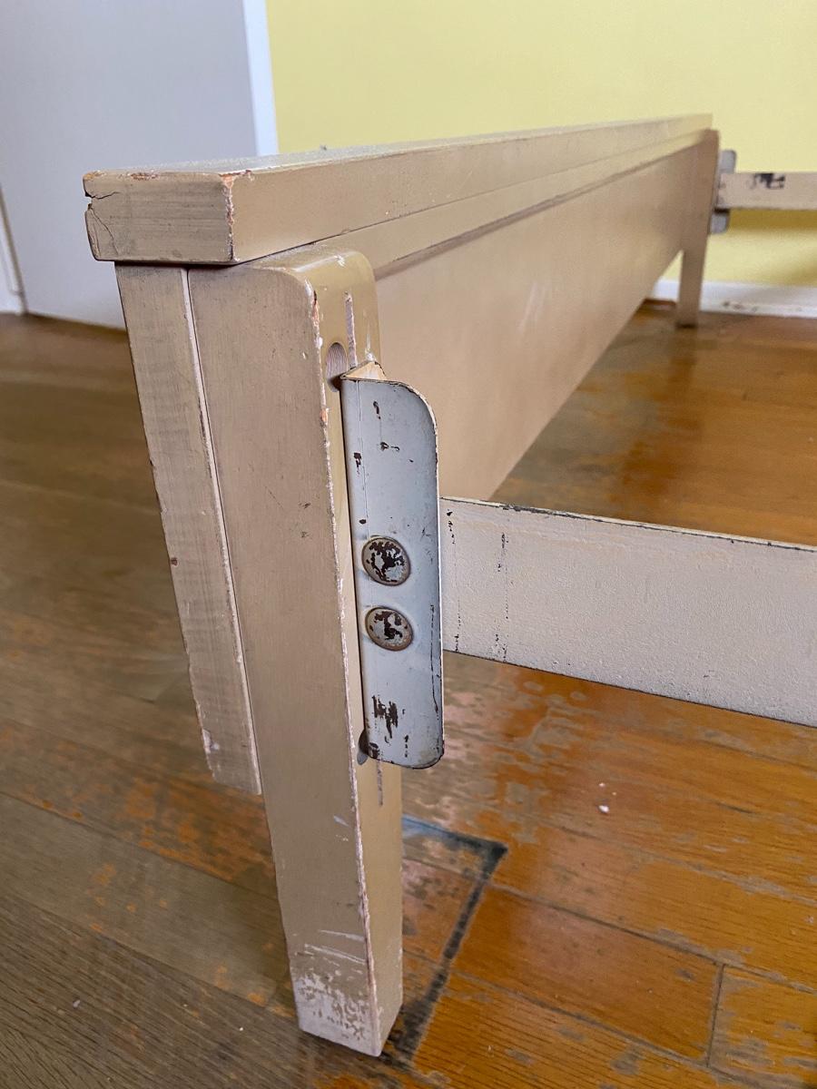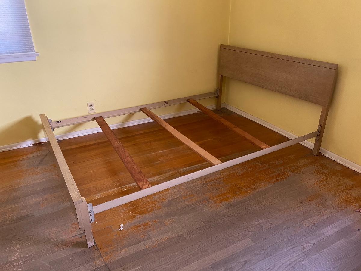 Vintage wood and metal bedframe. Looks like a full size bed. Headboard and footboard are wood with metal frame rails. Light finish, could be repainted and repurposed.