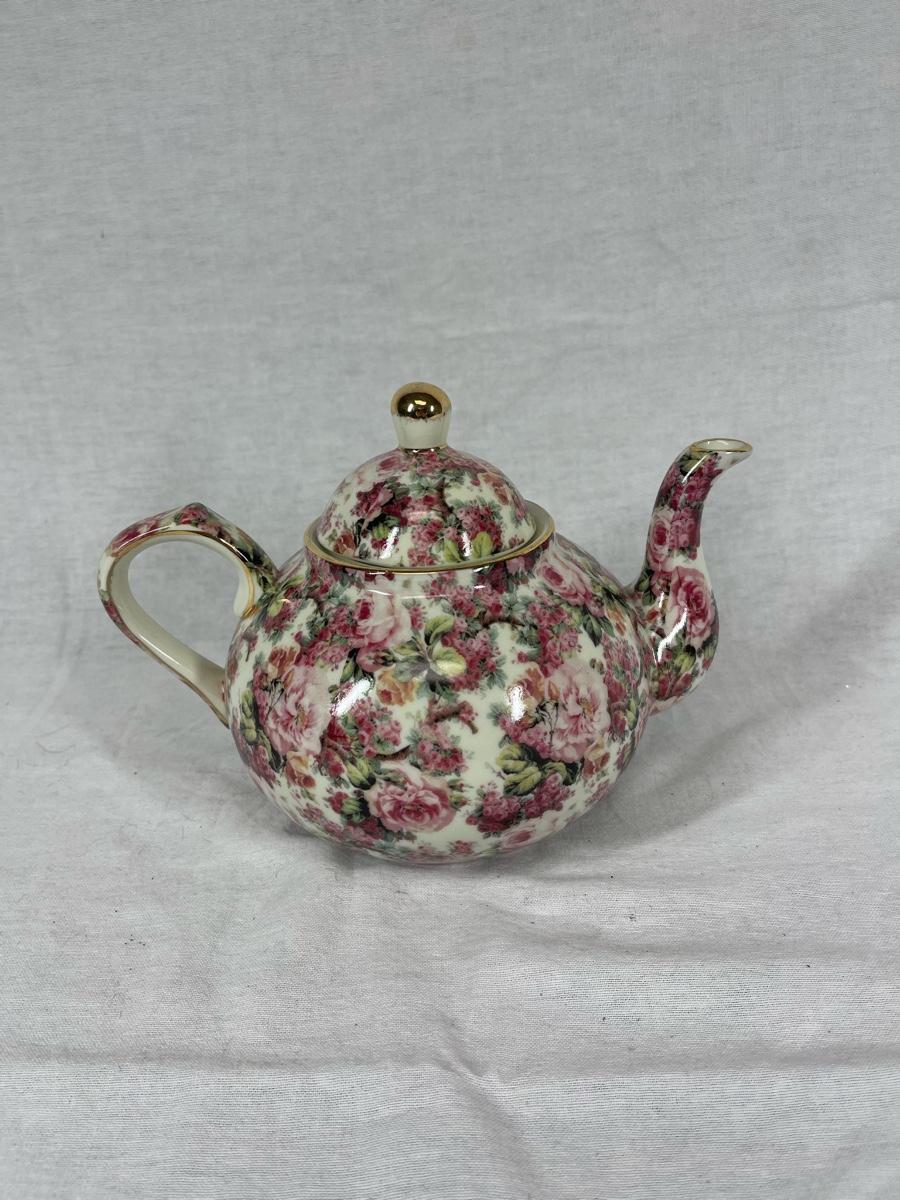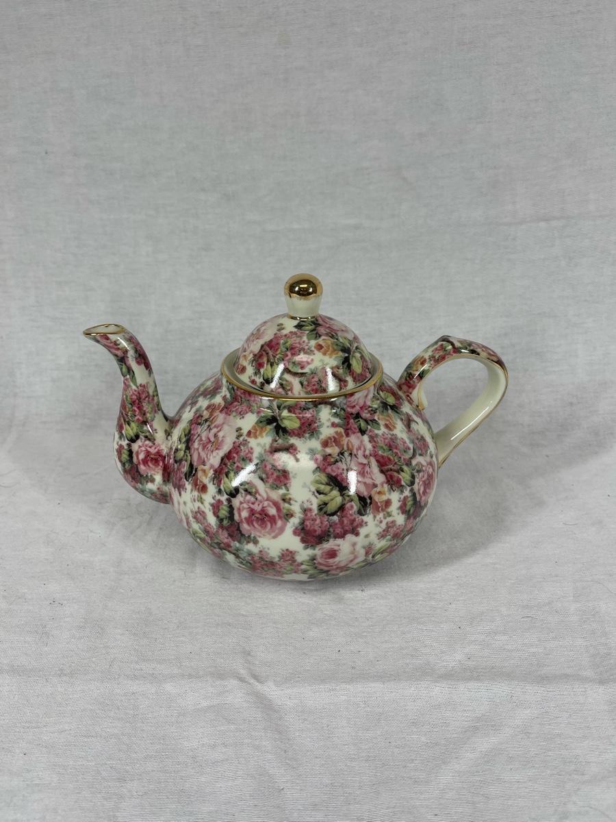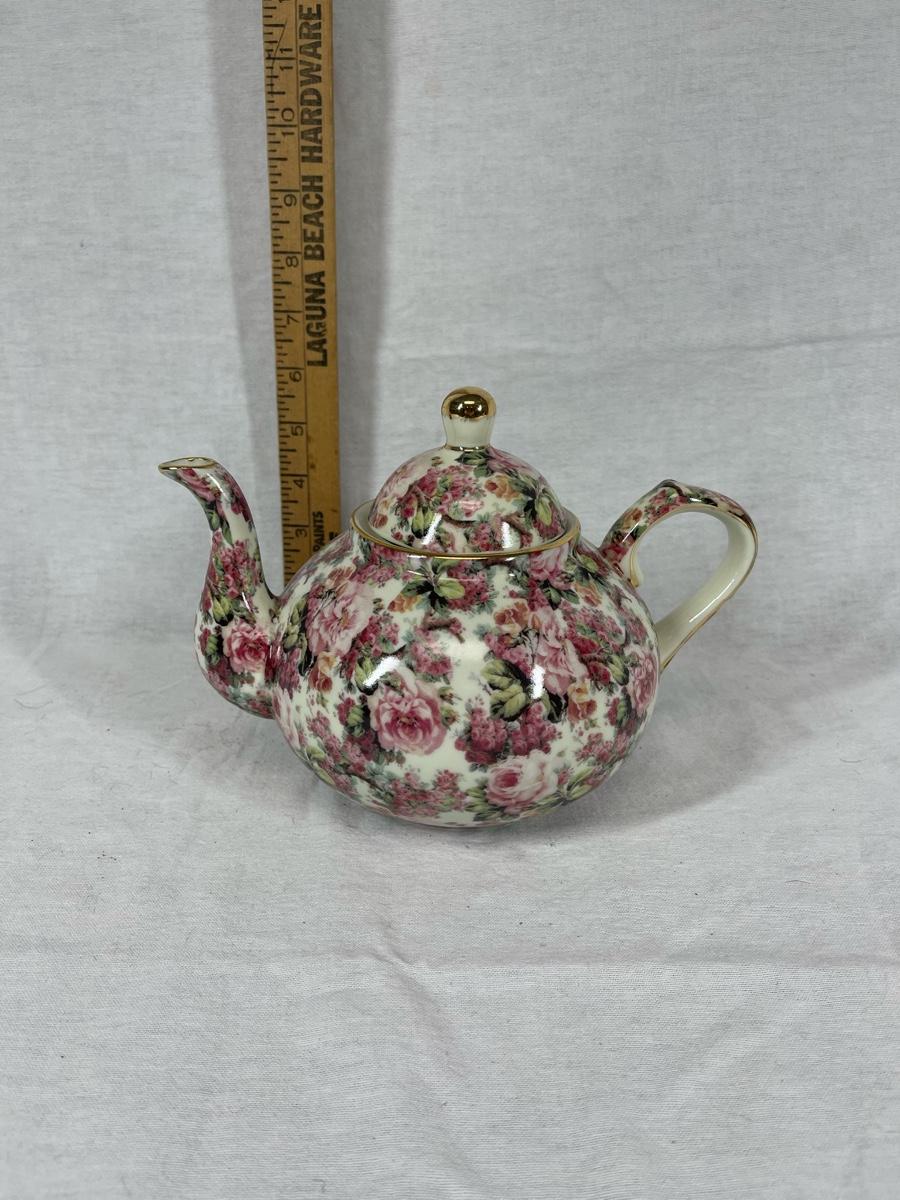 Small 6" rose chintz pattern tea pot. Dusty rose pattern all over. In good condition. Unmarked.