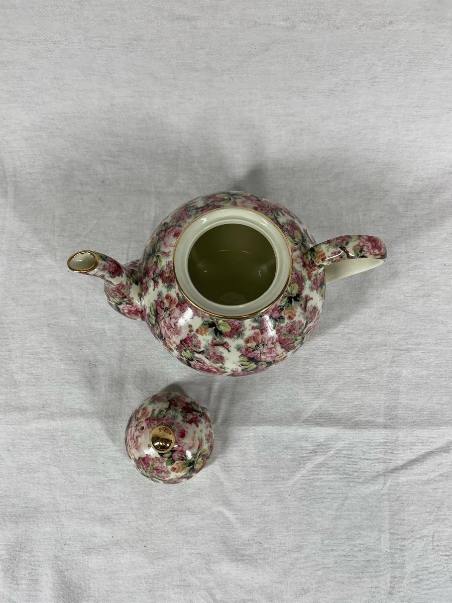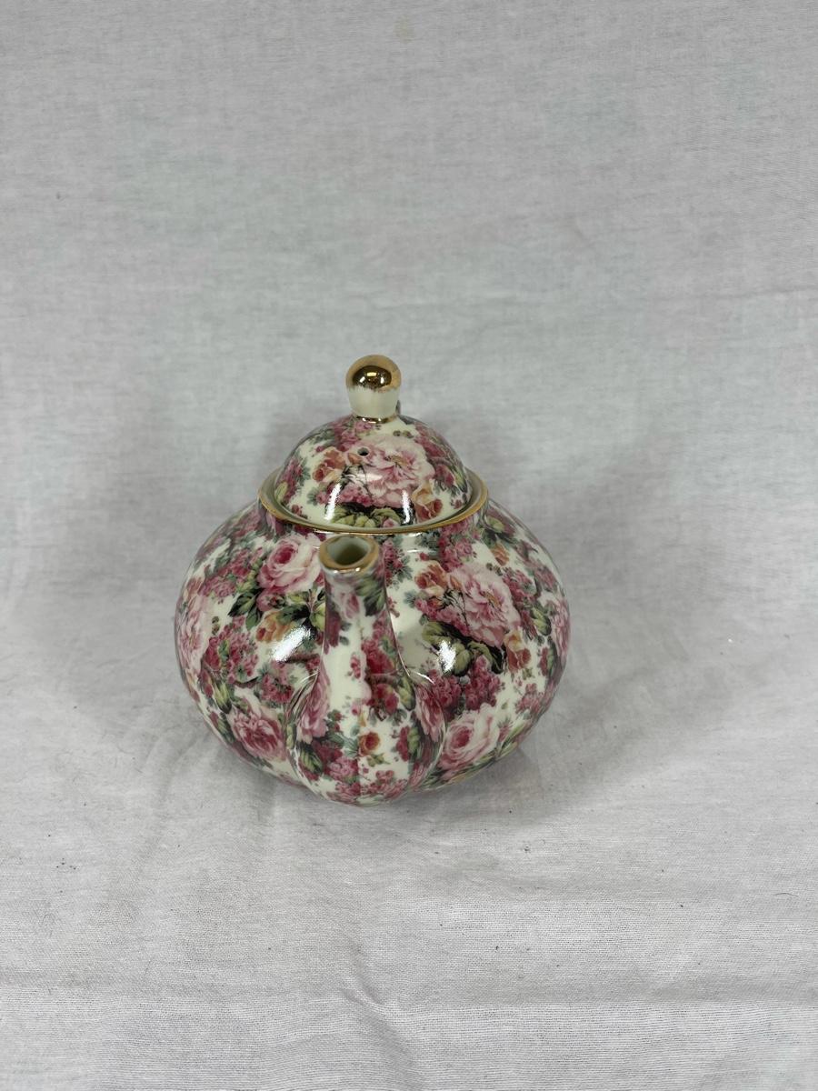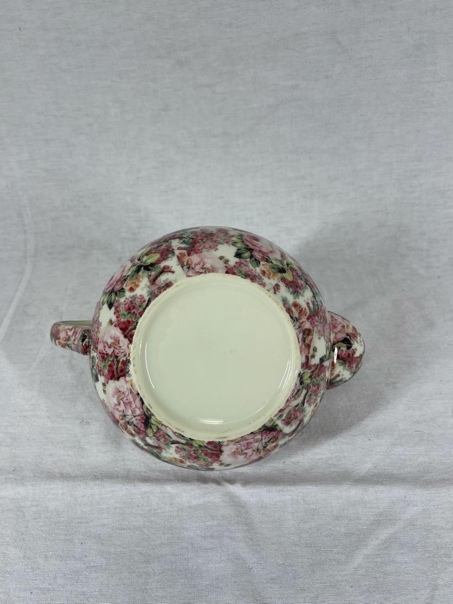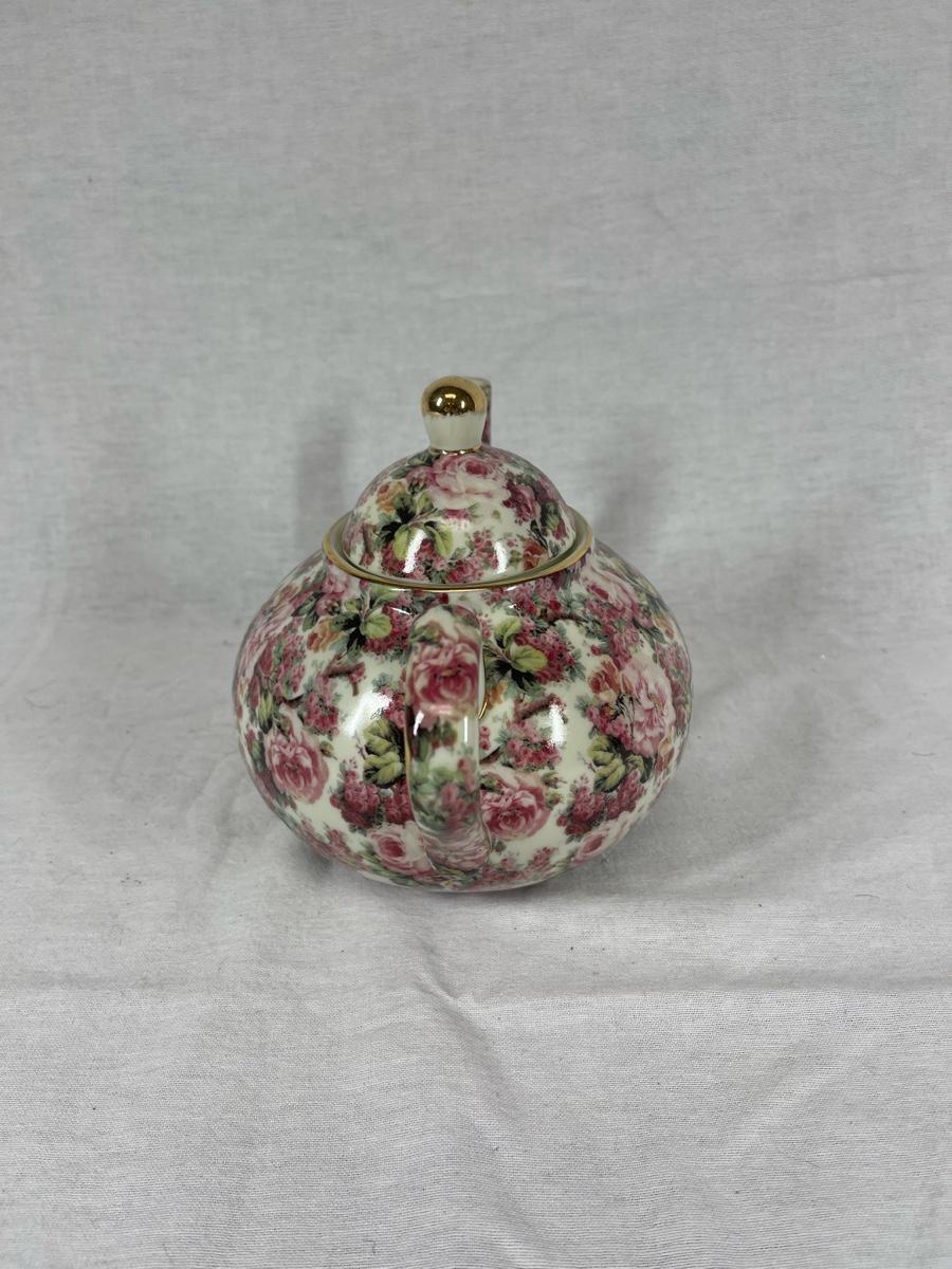 Small 6" rose chintz pattern tea pot. Dusty rose pattern all over. In good condition. Unmarked.