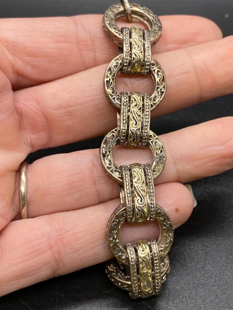 Vintage ASJ sterling silver bracelet. Goldtone vermeil scroll design to the links. About 7.5" size. Weighs 37.1g