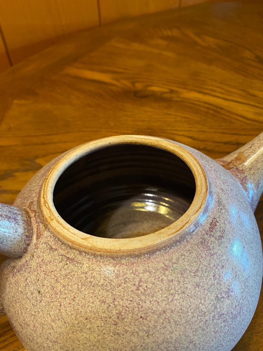 Vintage mid century pottery tea pot. White and maroon speckled finish, oversized handle. In good vintage condition, no chips only dust. Signed on the bottom.