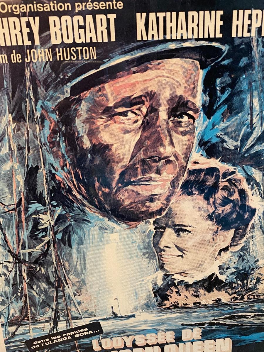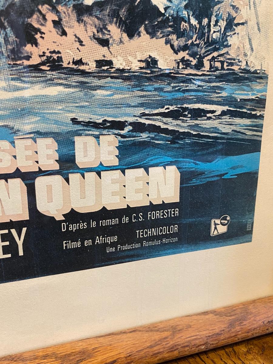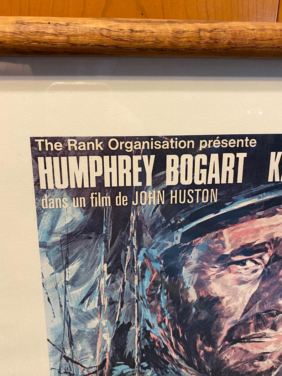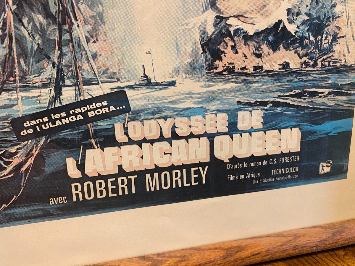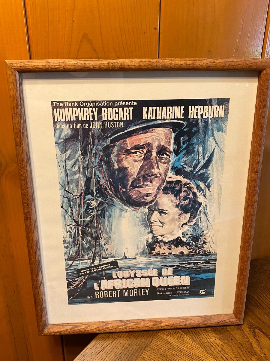 Vintage French version of 1951 movie The African Queen with Humphrey Bogart and Katherine Hepburn. Small size, frame measures about 17"x22". In good condition.