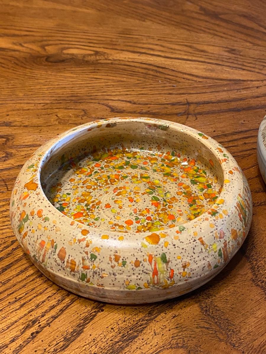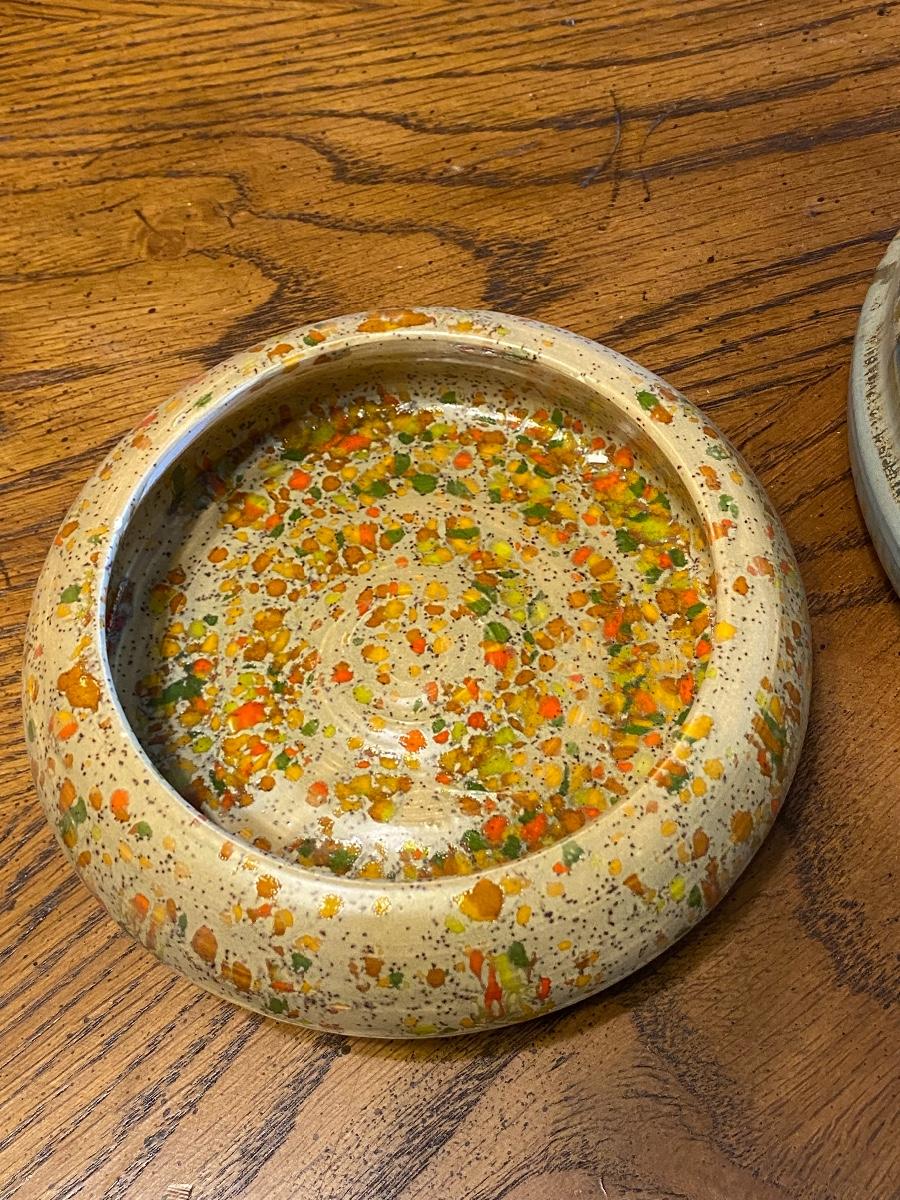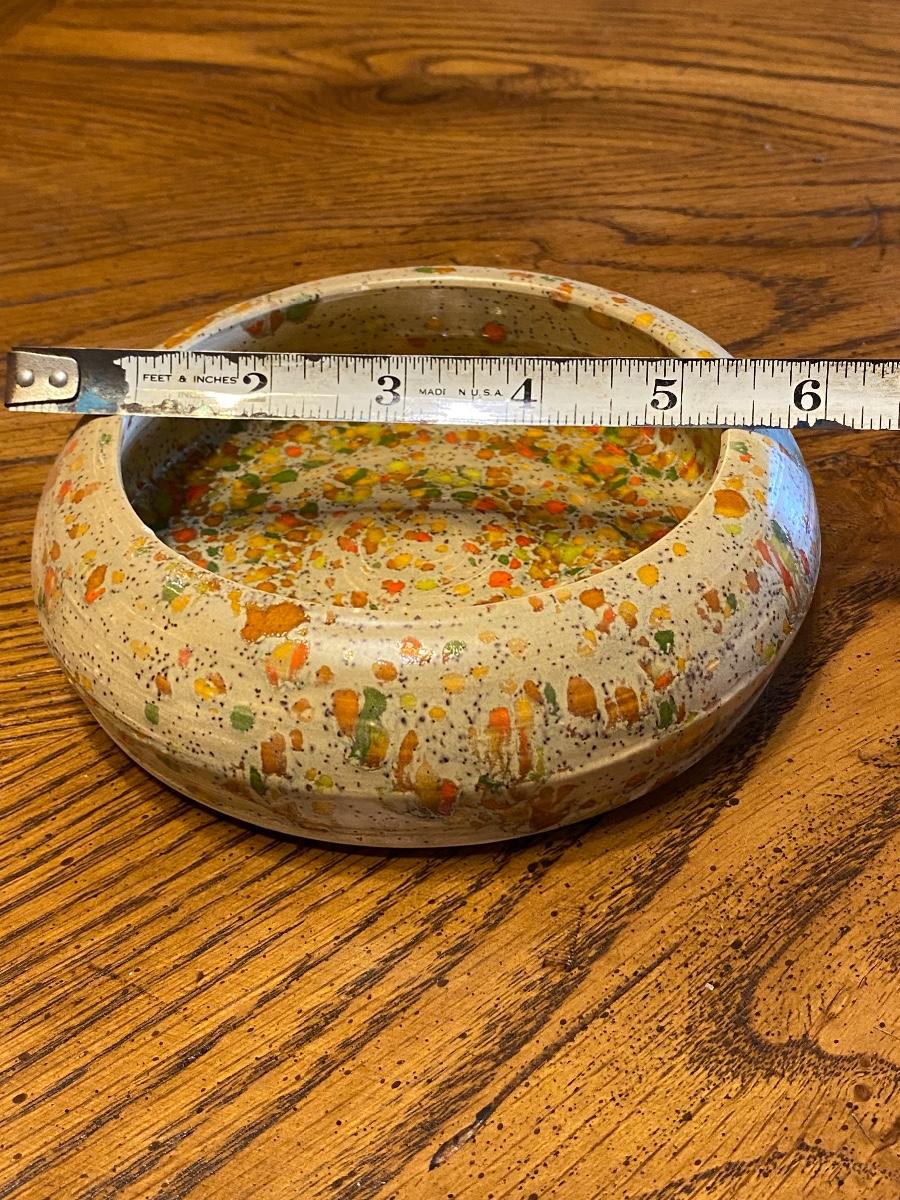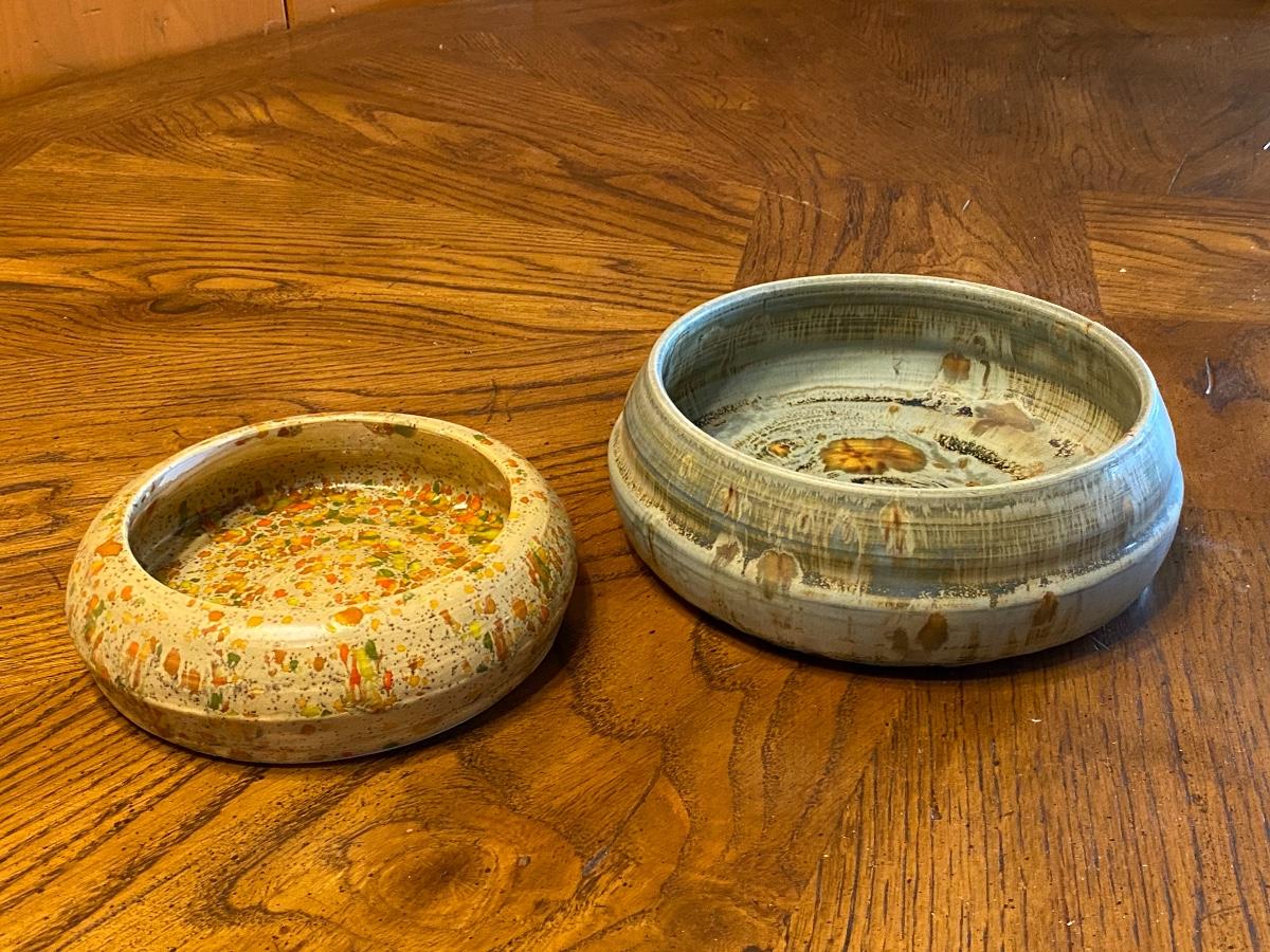 Pair of vintage pottery trinket dish bowls. Smaller one is a multi color speckle on white, about 6" size, signed Sue '72. The other is a blue dripware kind of speckle finish, about 7" size, signed Sunshine Sept 20 '72 with a duck in center. Both are in good condition, No chips or cracks.