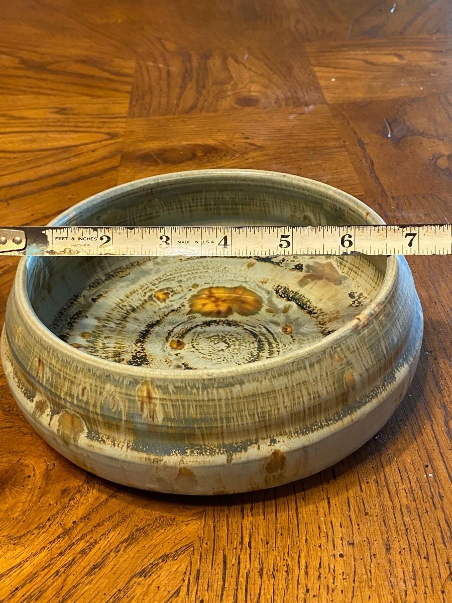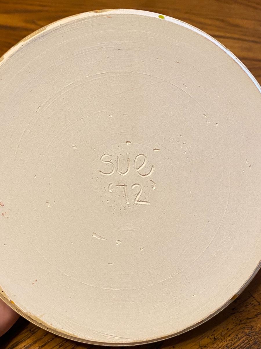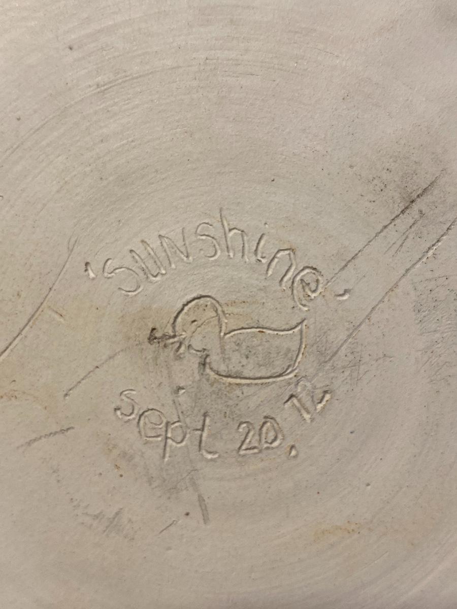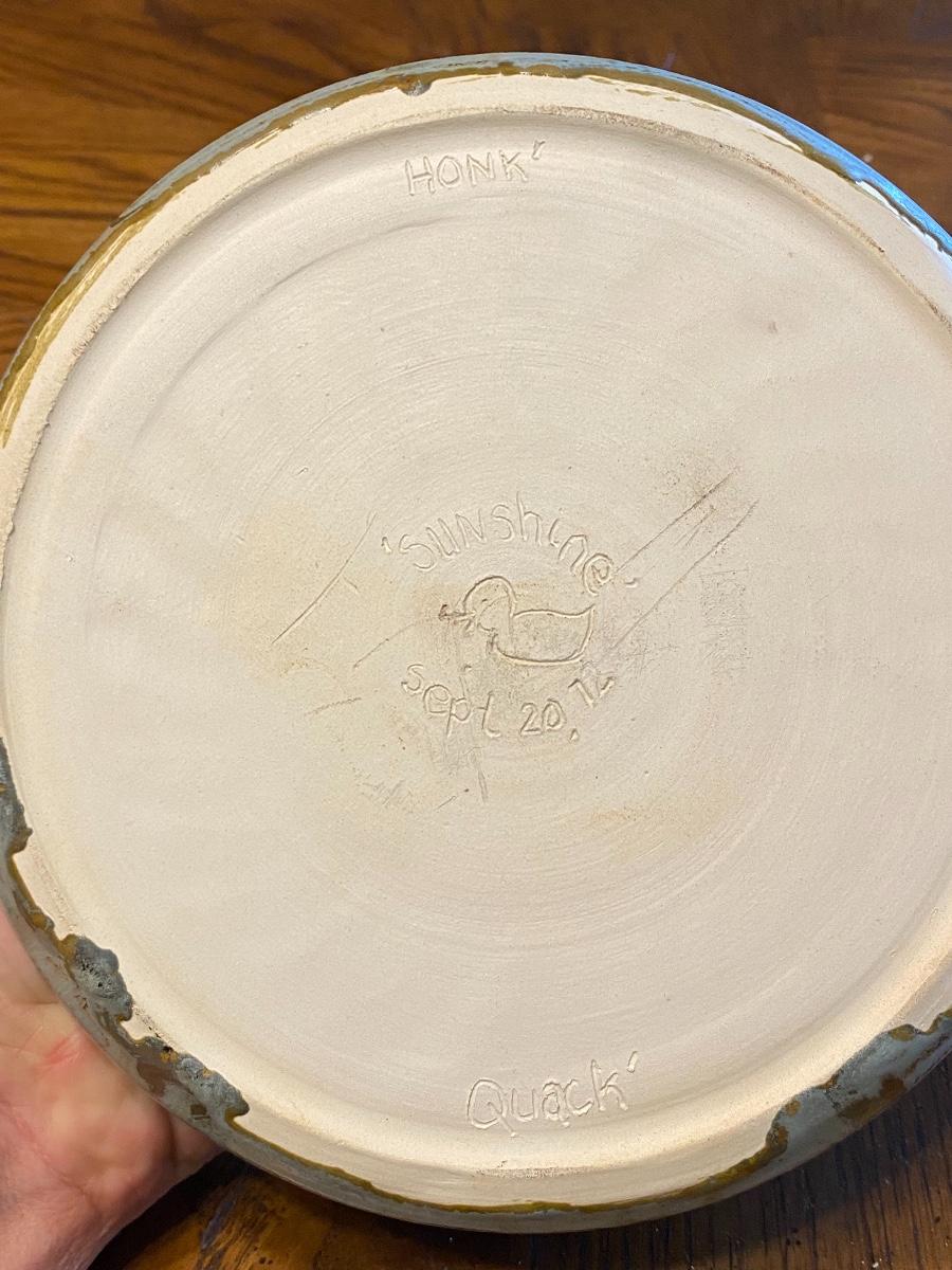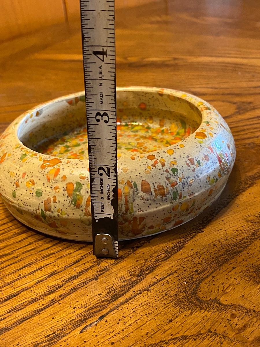 Pair of vintage pottery trinket dish bowls. Smaller one is a multi color speckle on white, about 6" size, signed Sue '72. The other is a blue dripware kind of speckle finish, about 7" size, signed Sunshine Sept 20 '72 with a duck in center. Both are in good condition, No chips or cracks.