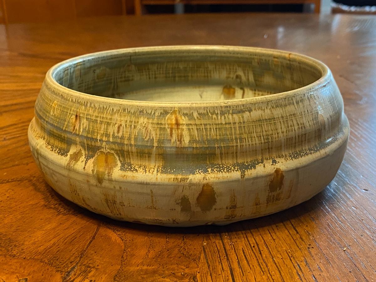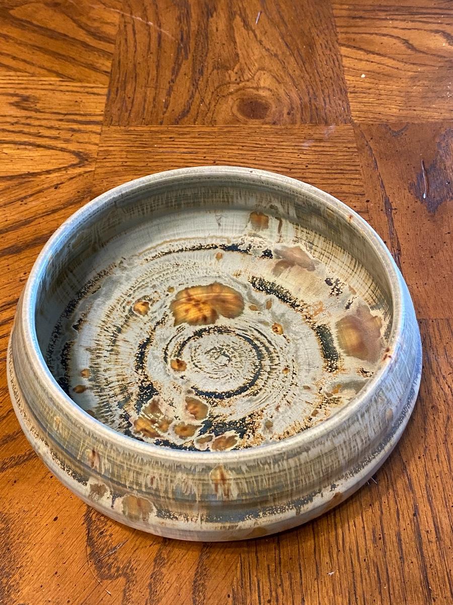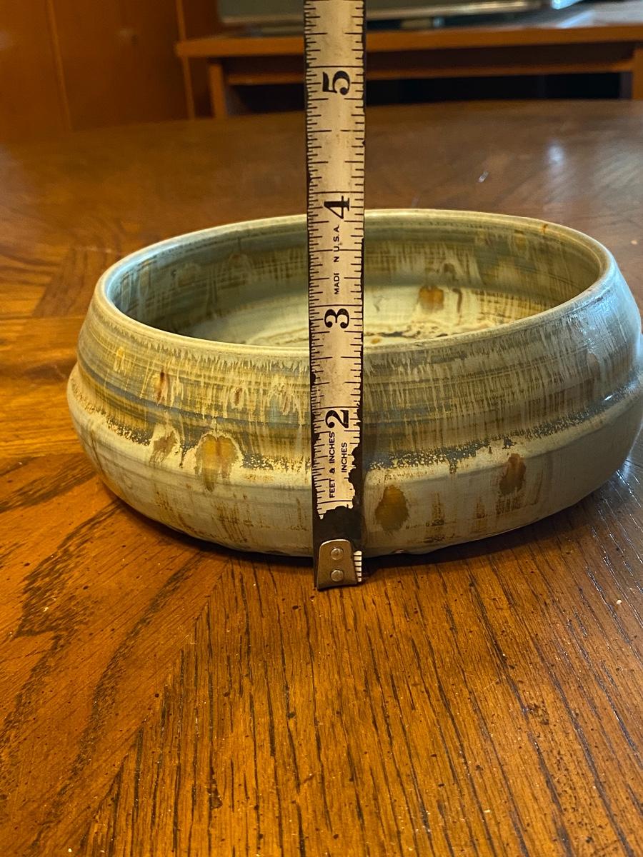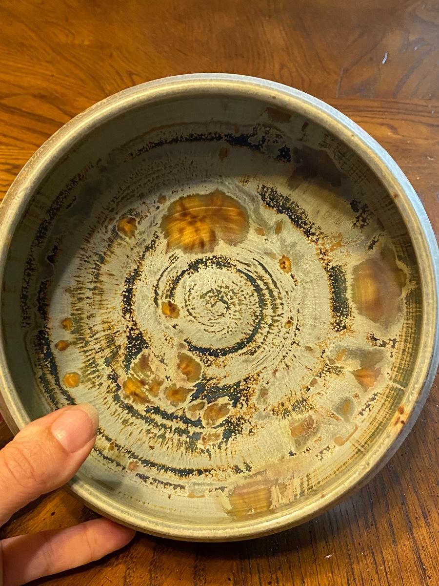 Pair of vintage pottery trinket dish bowls. Smaller one is a multi color speckle on white, about 6" size, signed Sue '72. The other is a blue dripware kind of speckle finish, about 7" size, signed Sunshine Sept 20 '72 with a duck in center. Both are in good condition, No chips or cracks.
