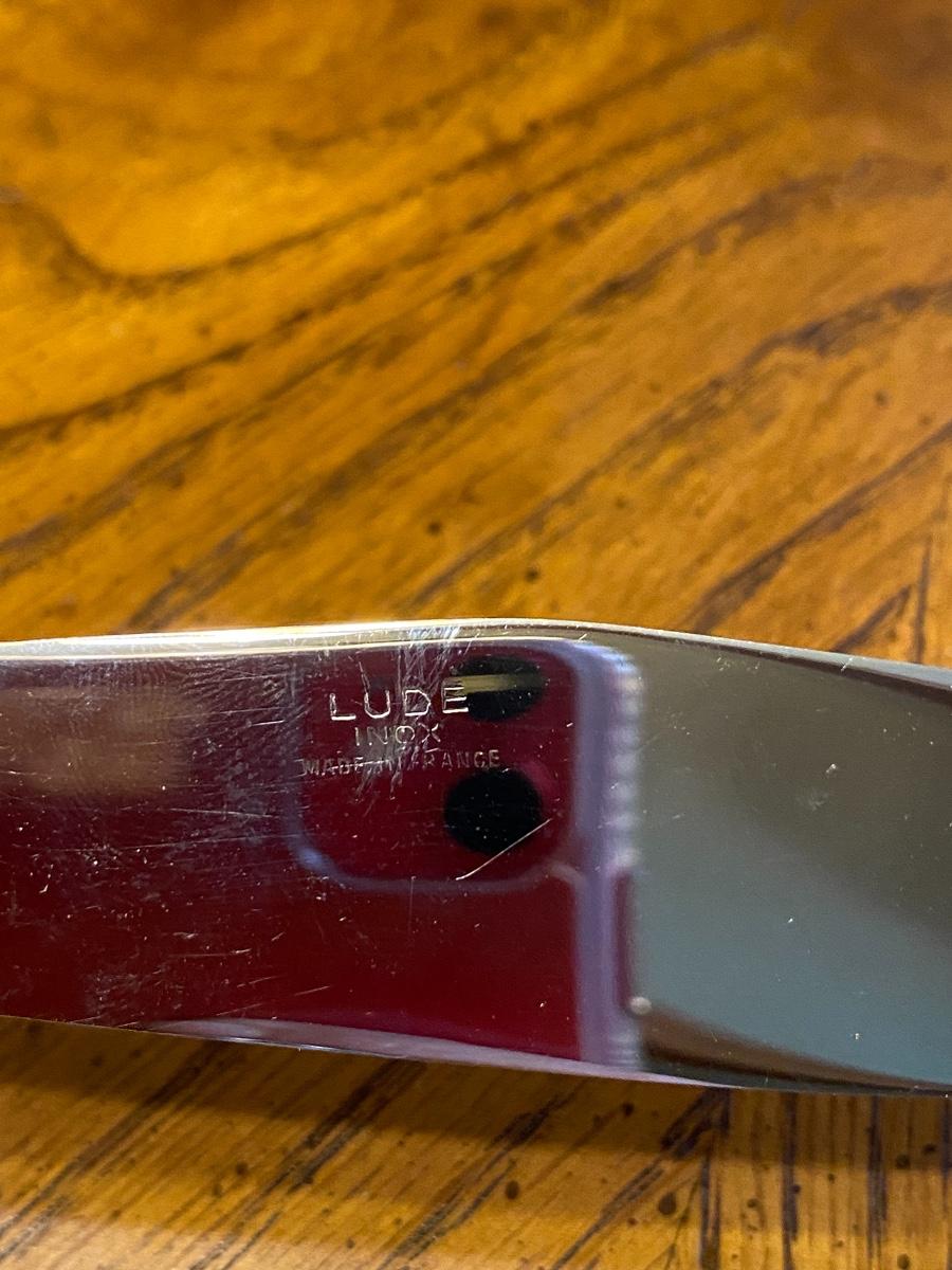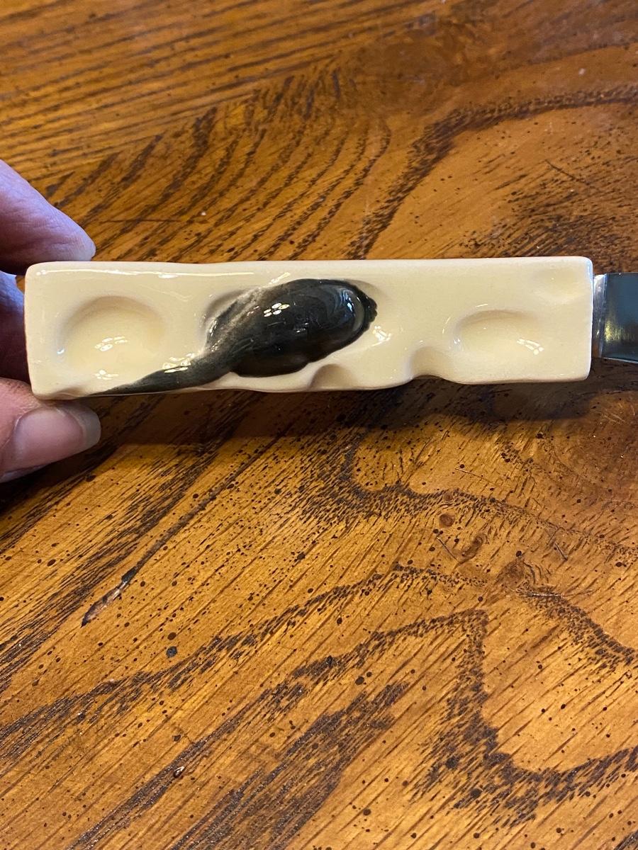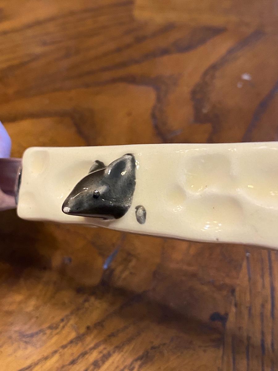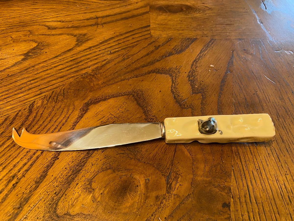 Vintage long cheese knife. Ceramic handle is a mouse inside a block of cheese. looks like a very small chip in the mouse's nose. About 10" length. Made by Lude
