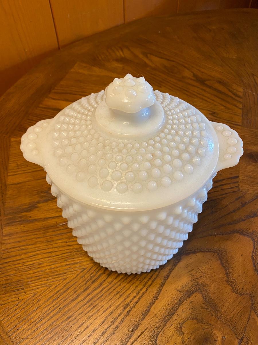 Vintage hobnail milk glass ice bucket. Lidded with side handles. No marks on bottom noticed. Good condition, no damage just dust. Stands about 9" at top of lid.