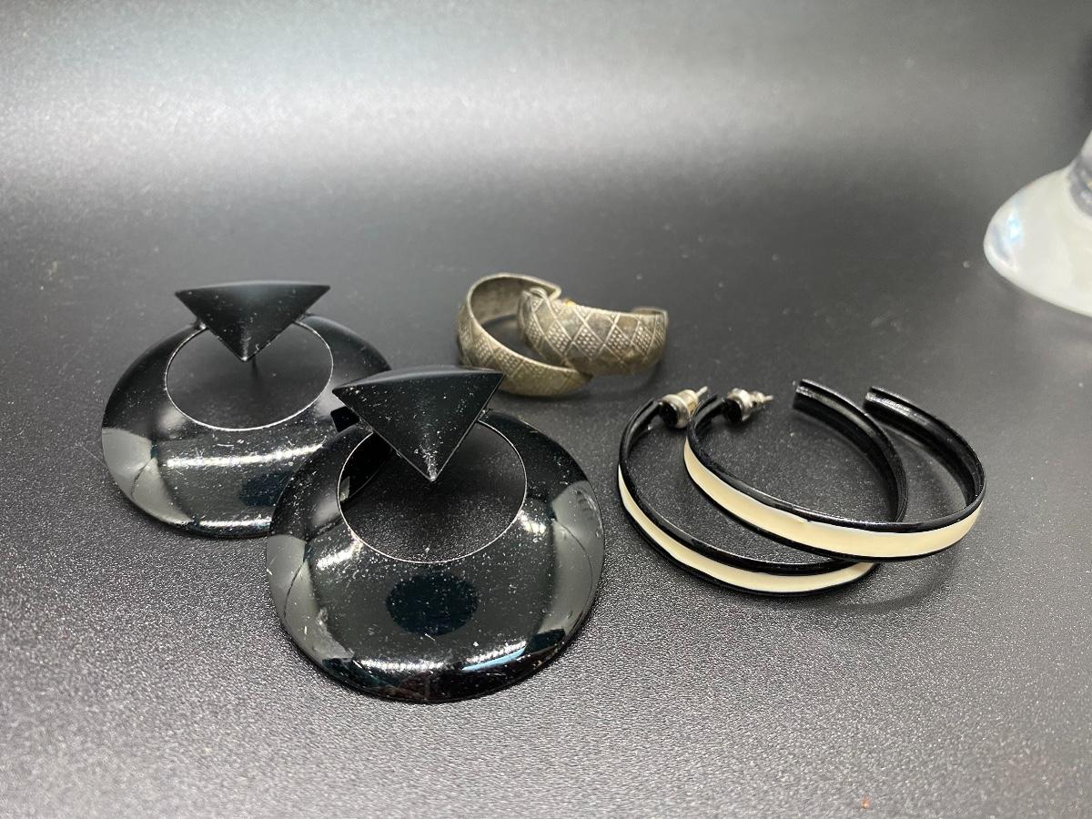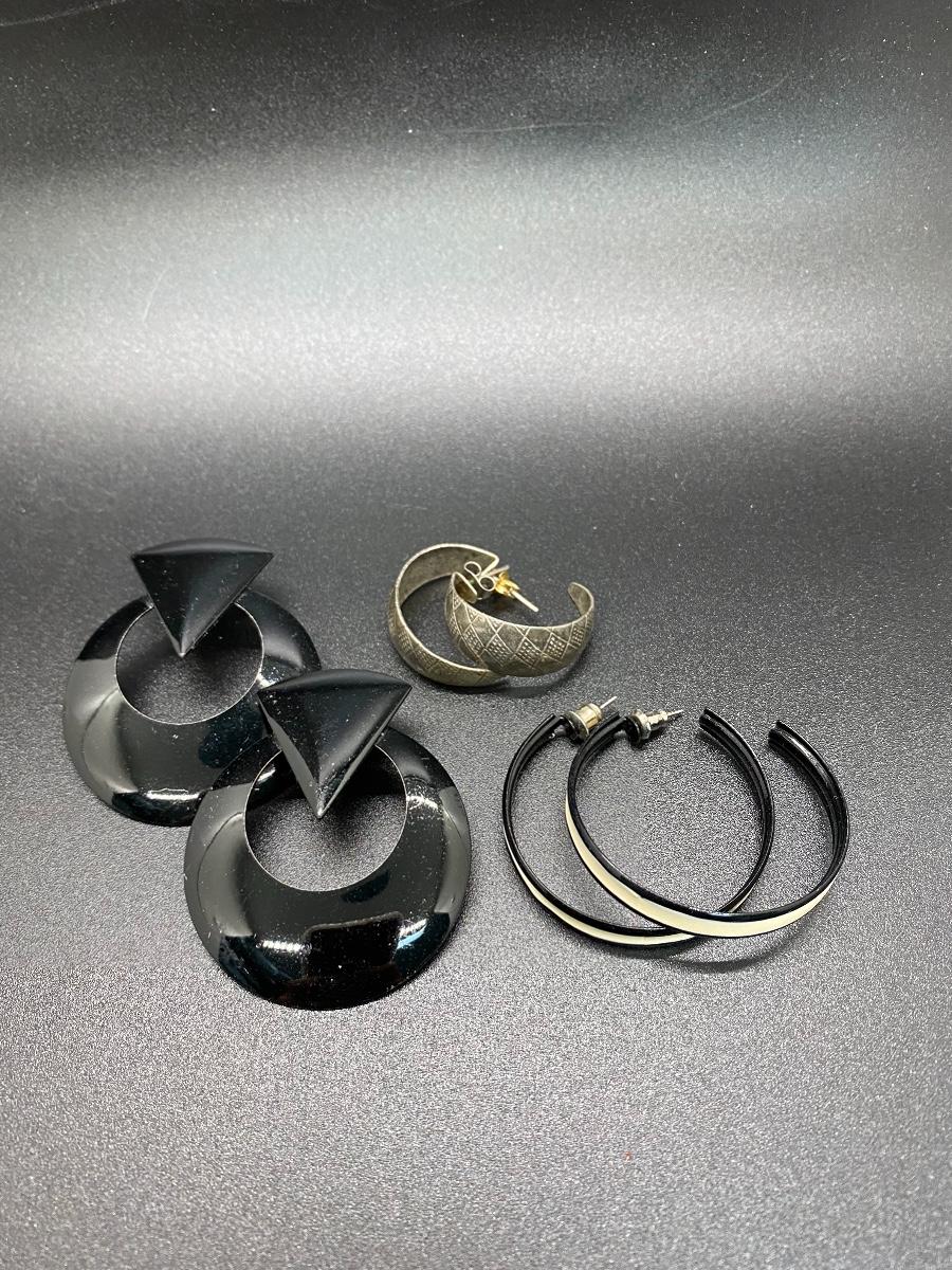 Set of 3 retro 1980s earrings. For pierced ears. Black enamel over metal, black and white enamel hoops, and silver tone hoops. Used good condition.