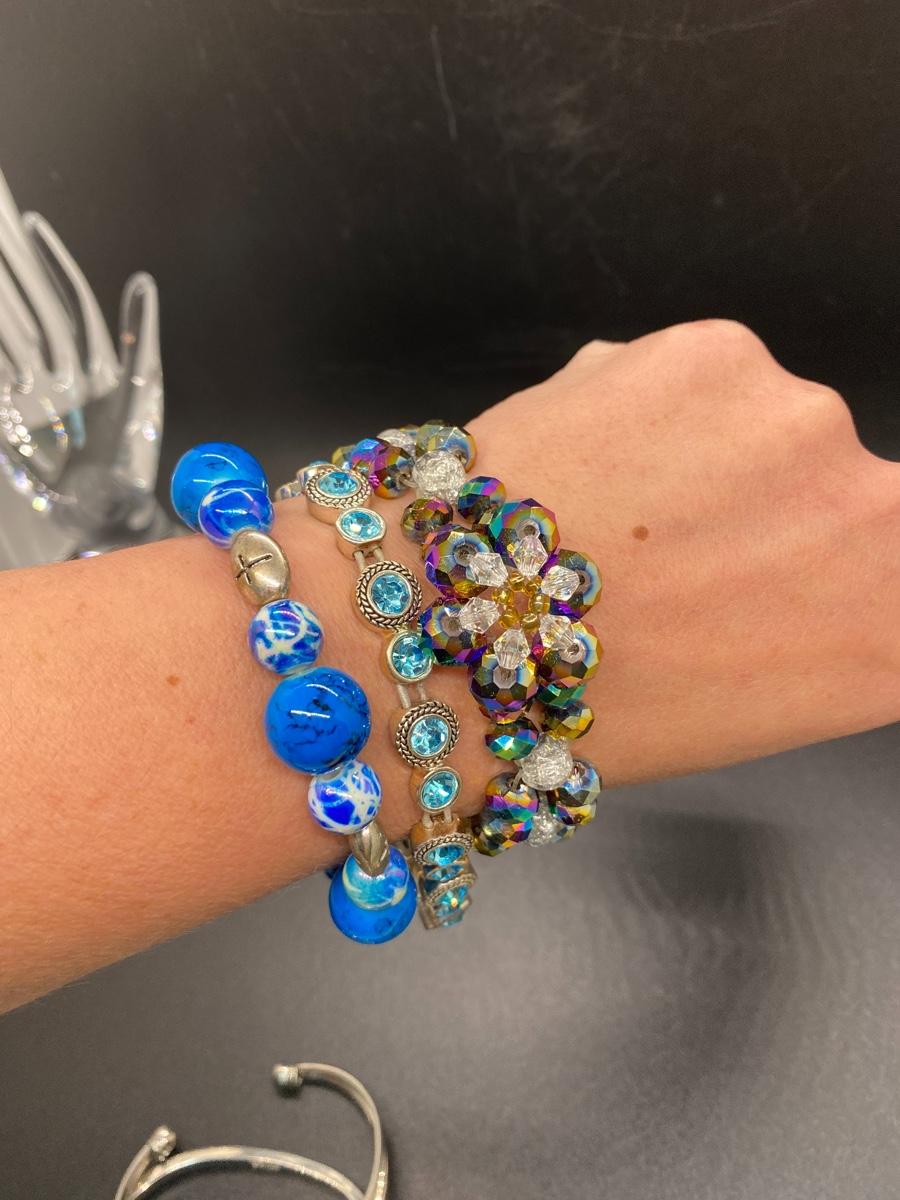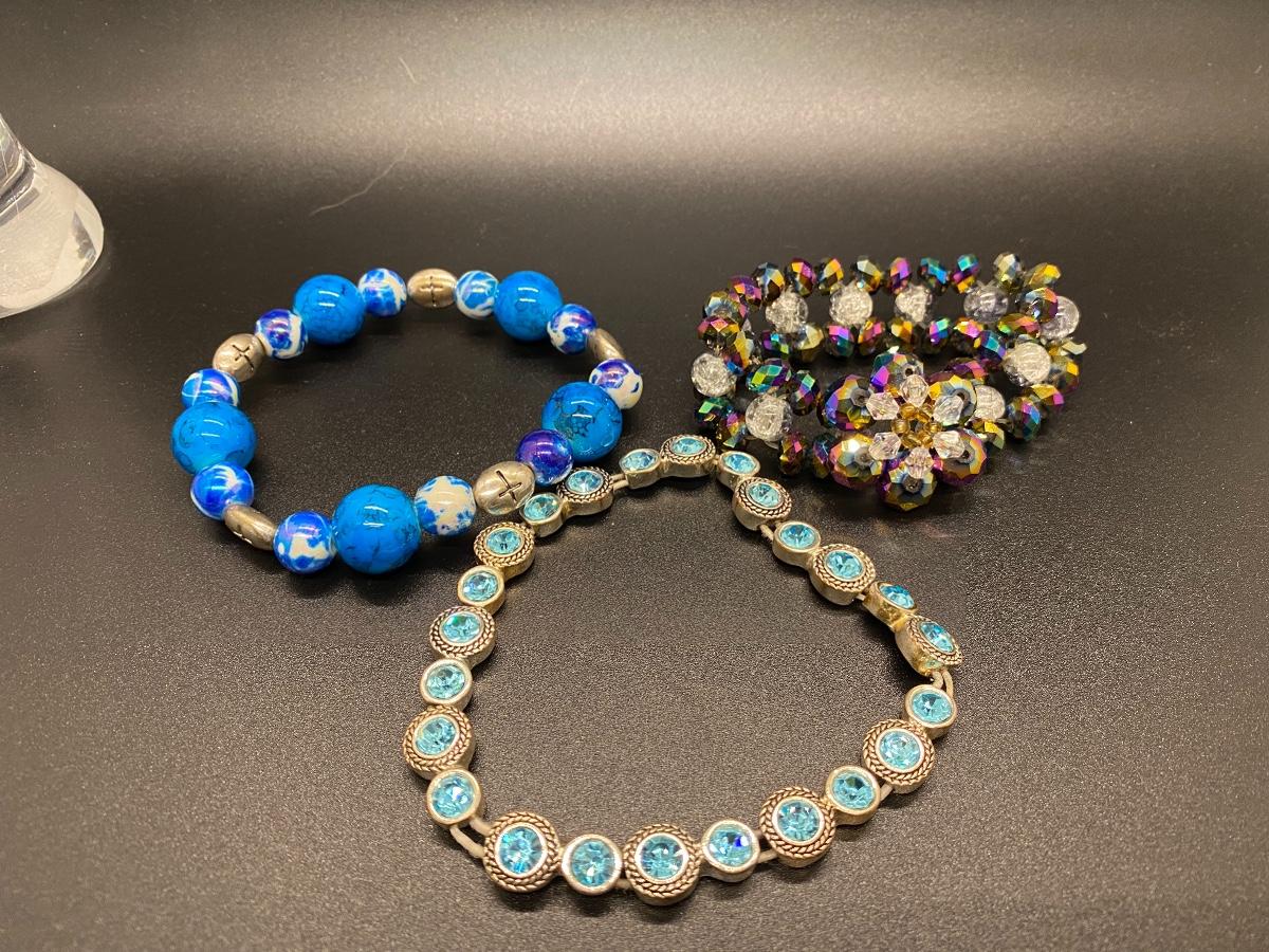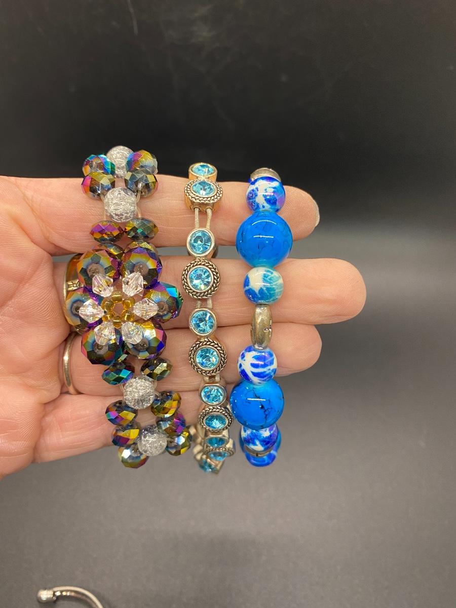 3 blue hue stretch bracelets. Bead and crystal style. The rhinestone bracelet is a bit over stretched, could be repurposed or fixed.