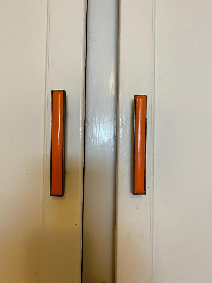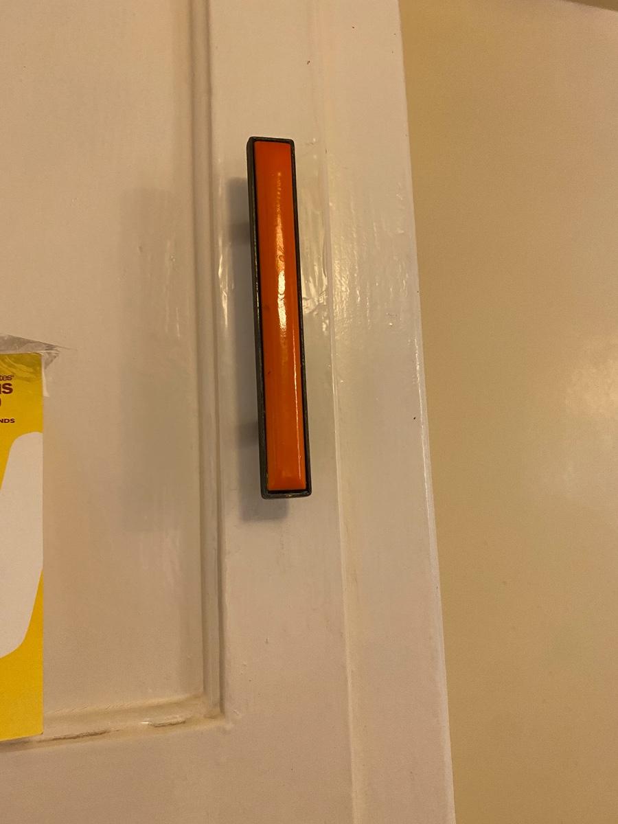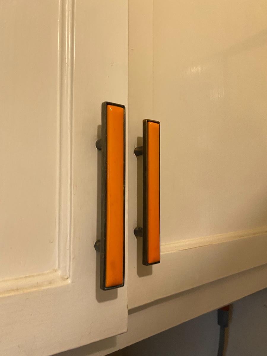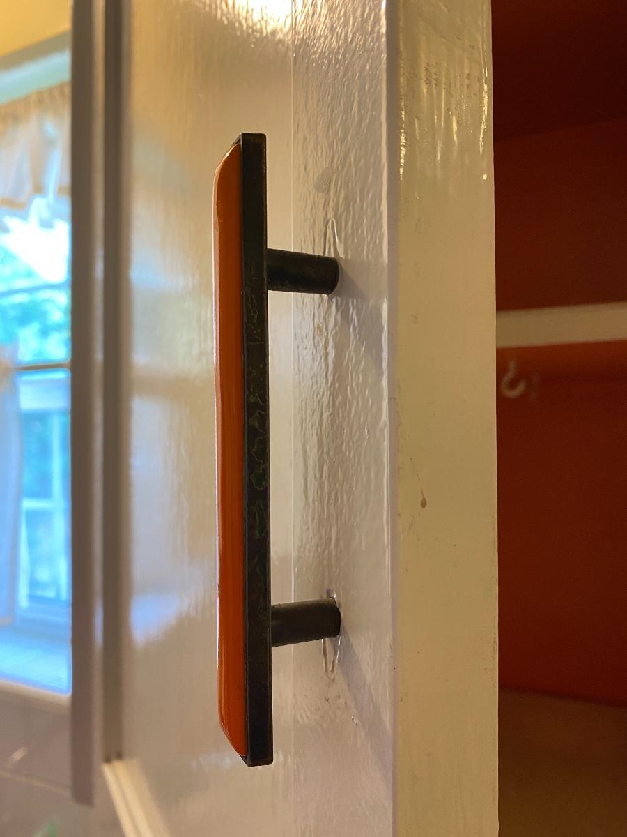 Vintage MId Century Door Cabinet Pulls Handles. Orange ceramic tile in metal. About 24 or so, maybe a couple more. One has the tile out but can be glued. You will have to remove if won.