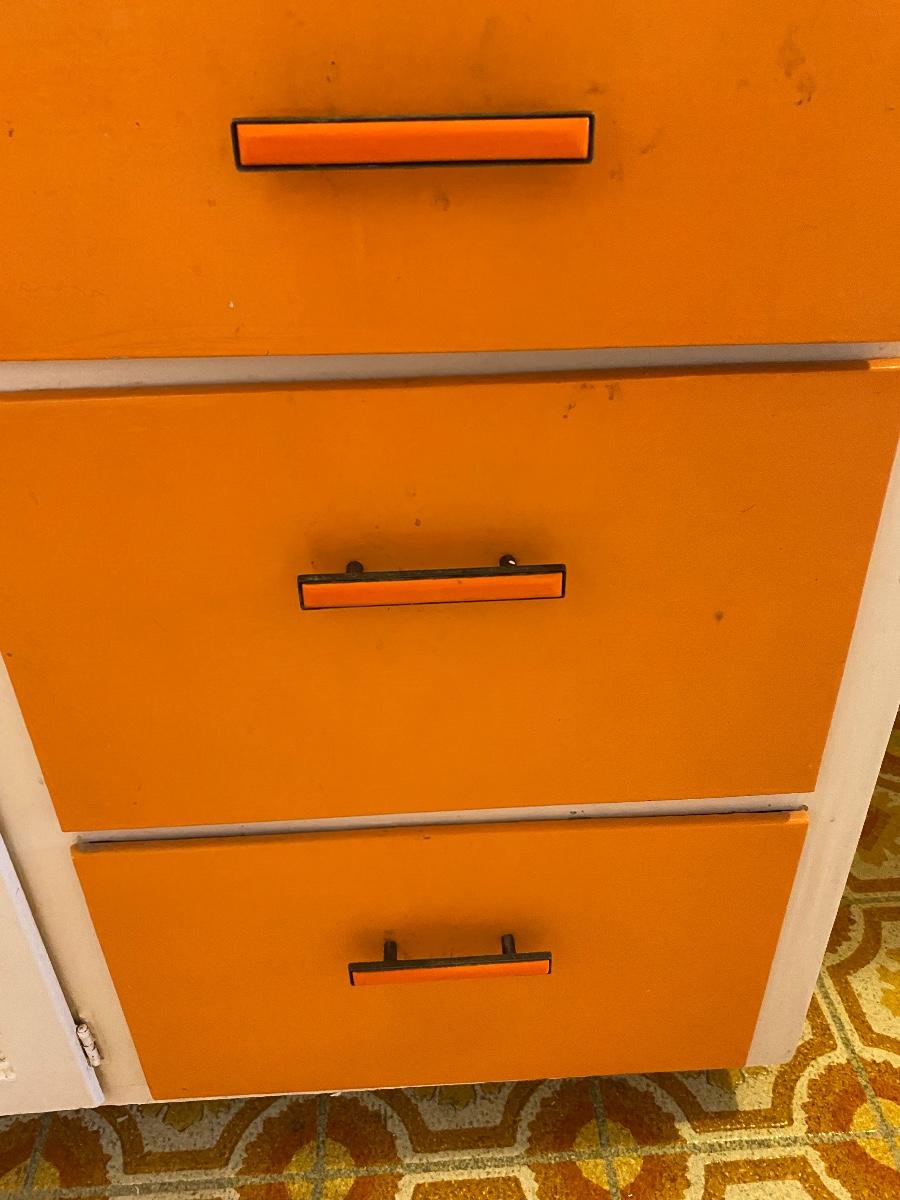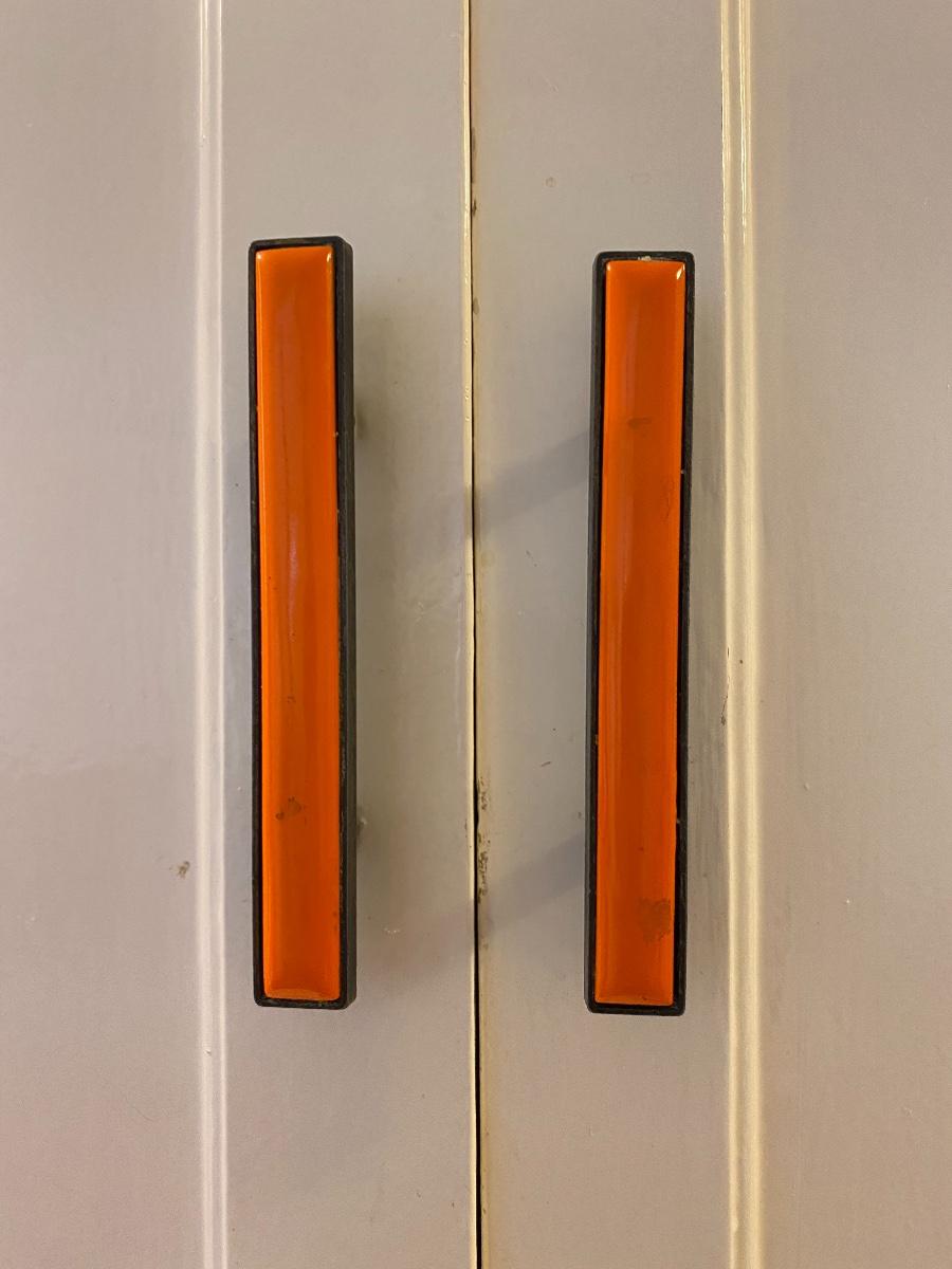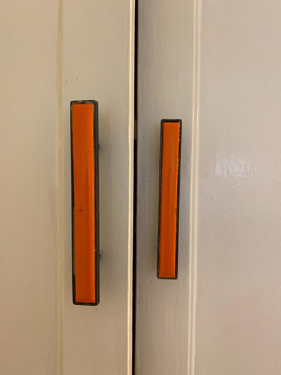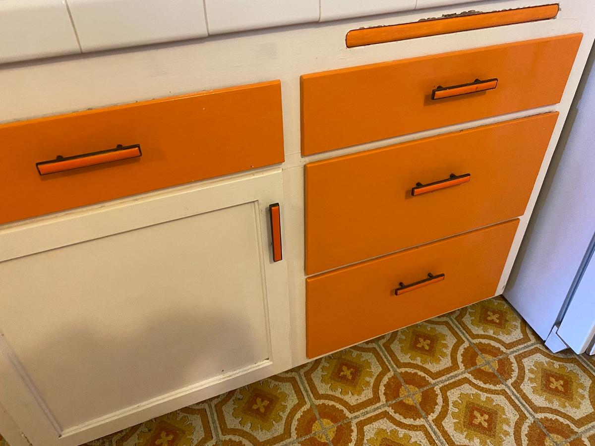 Vintage MId Century Door Cabinet Pulls Handles. Orange ceramic tile in metal. About 24 or so, maybe a couple more. One has the tile out but can be glued. You will have to remove if won.