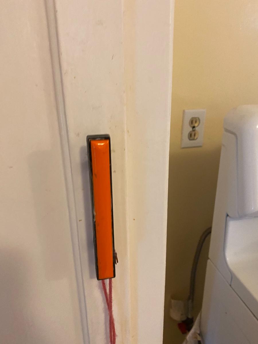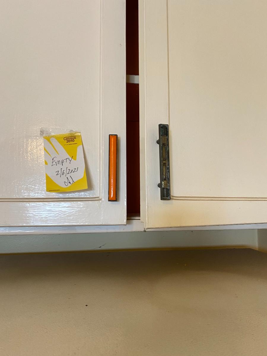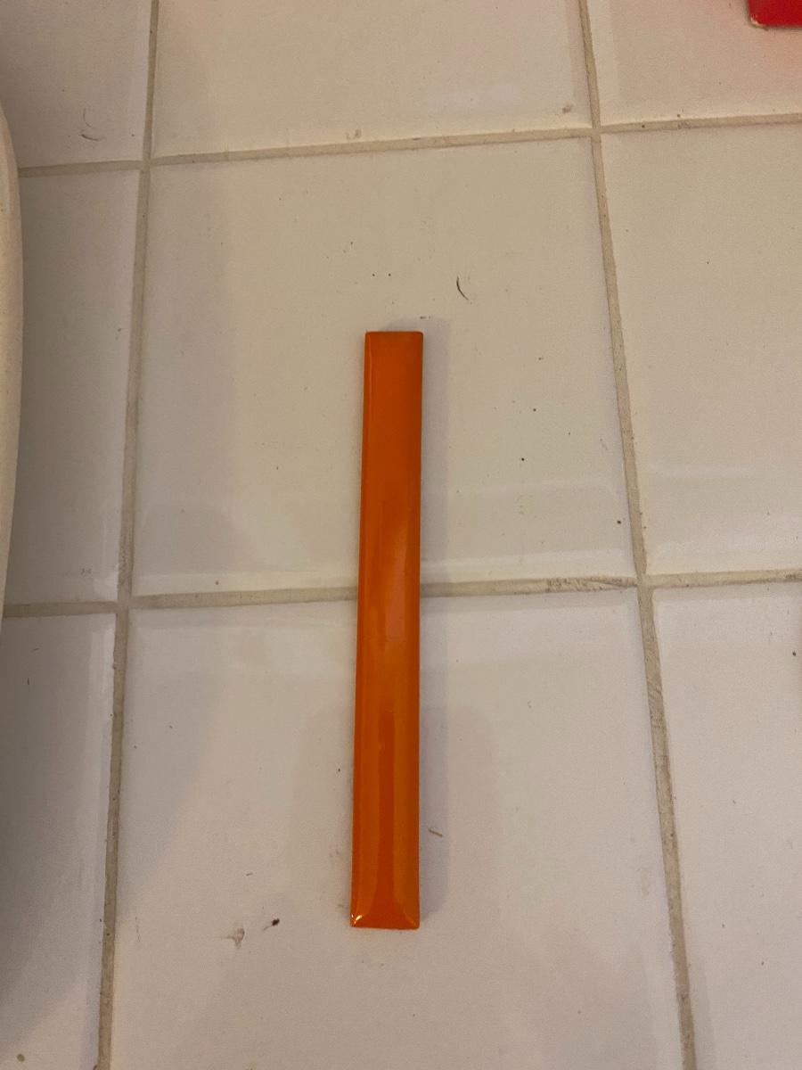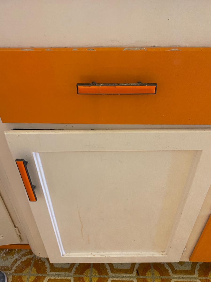 Vintage MId Century Door Cabinet Pulls Handles. Orange ceramic tile in metal. About 24 or so, maybe a couple more. One has the tile out but can be glued. You will have to remove if won.