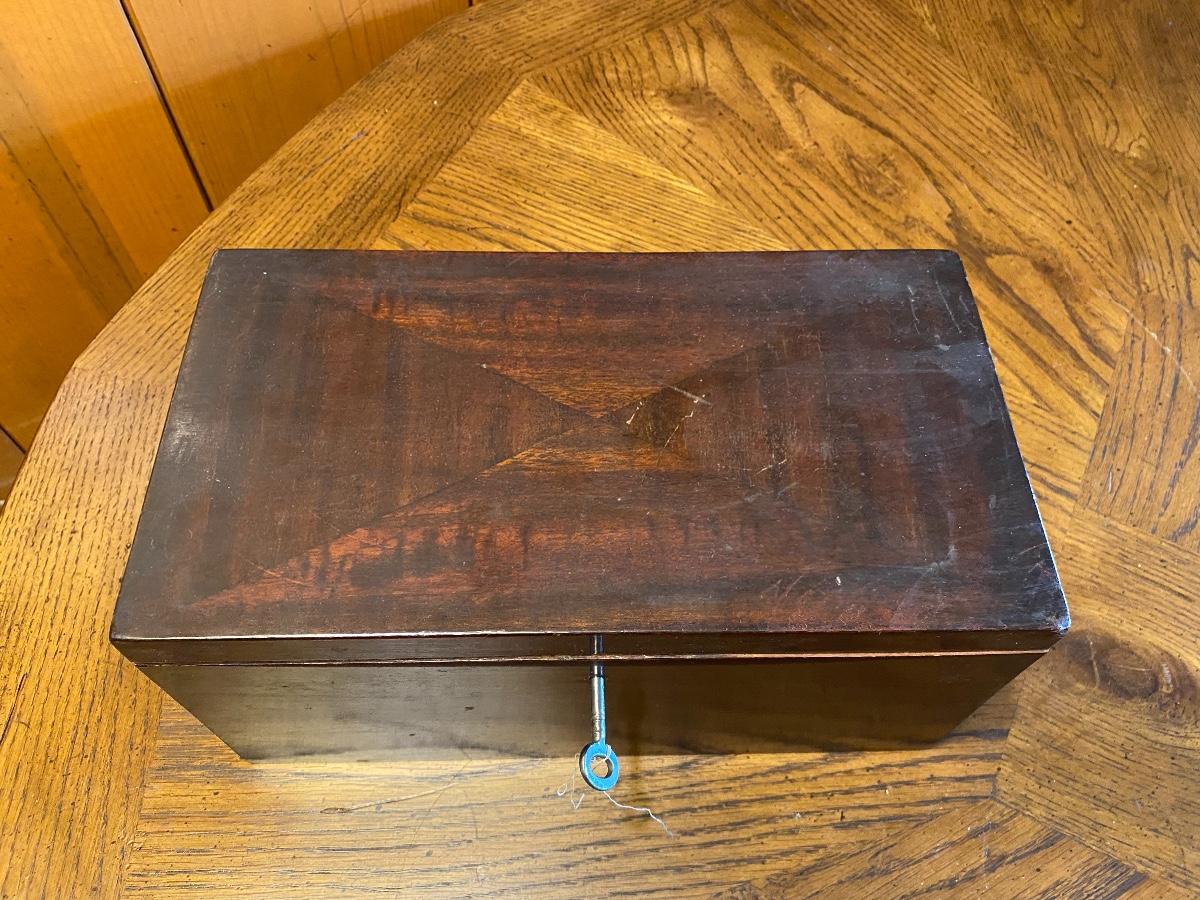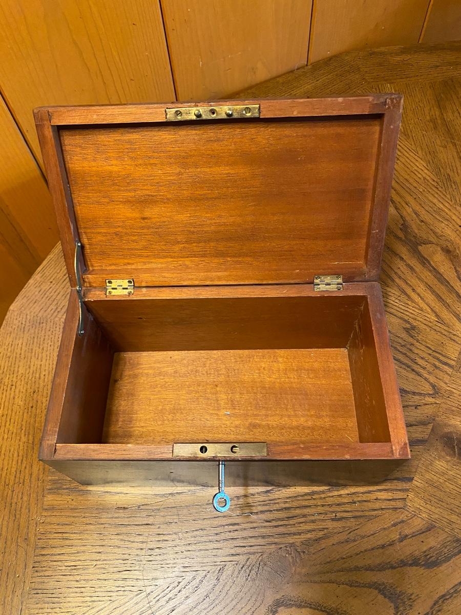 Vintage Wood Locking Box with Key. In good condition. About the size of a shoe box.