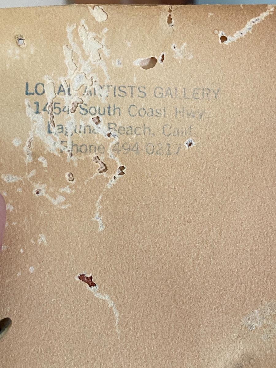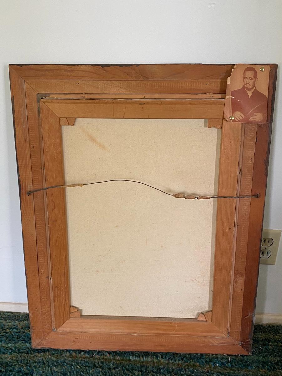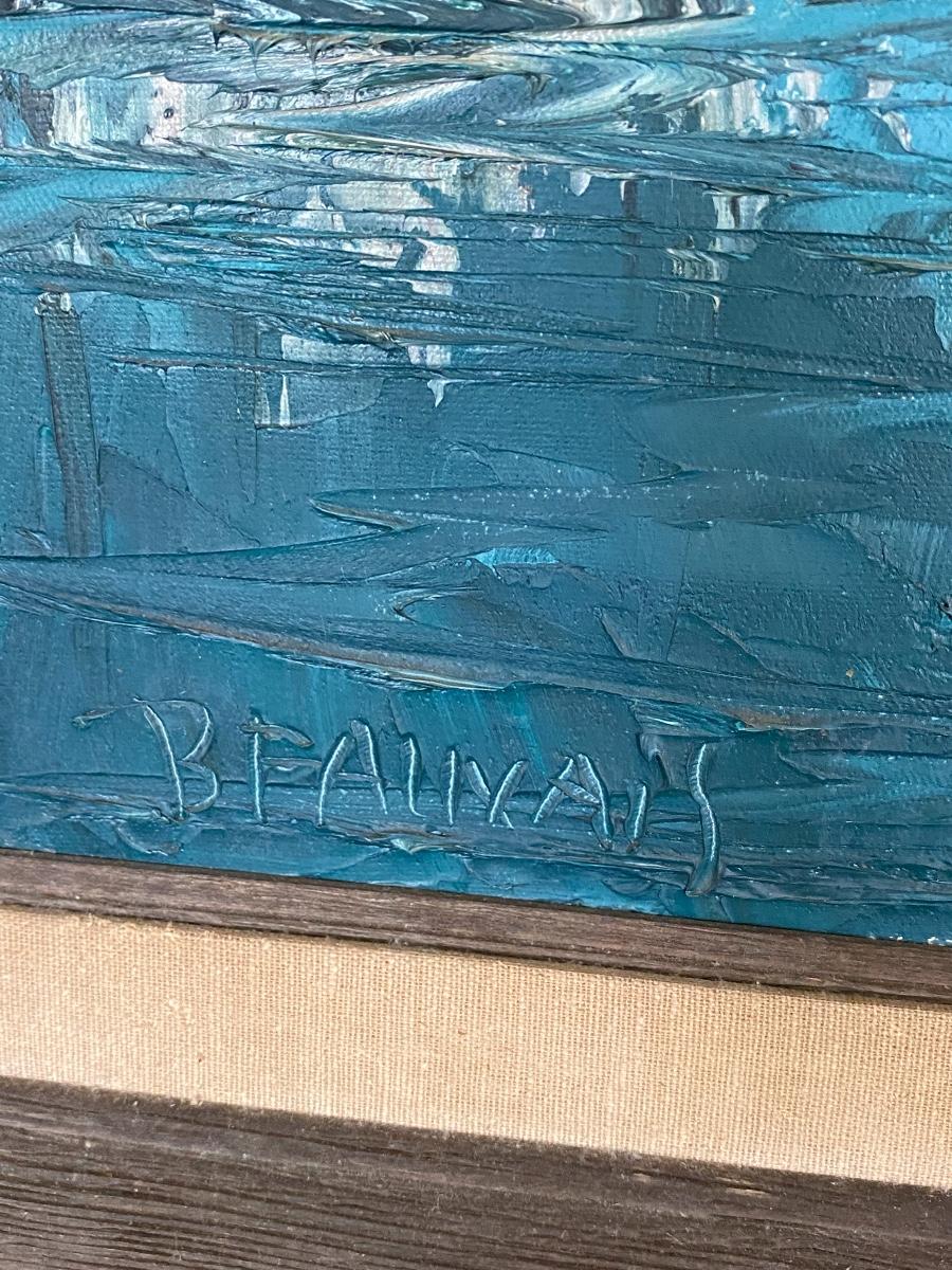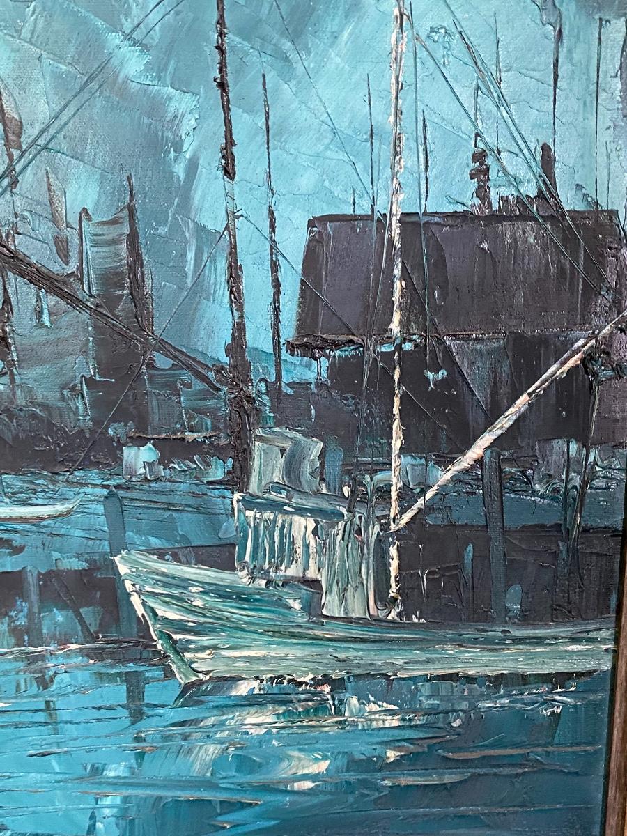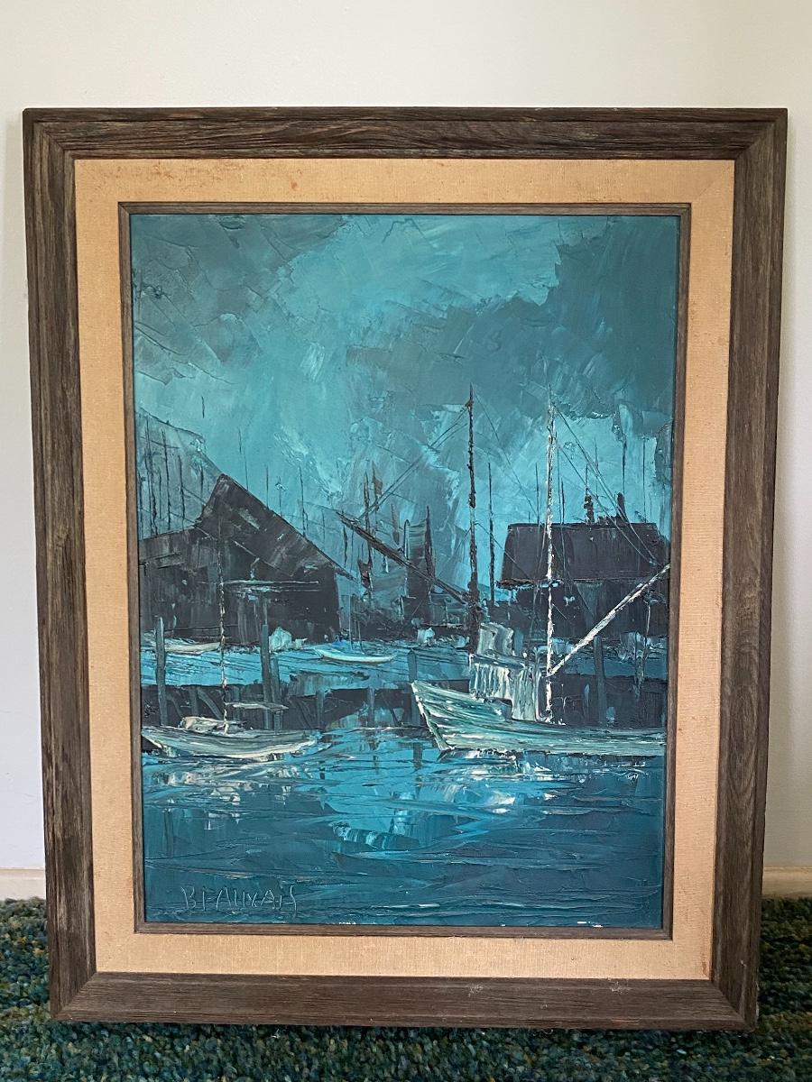 Vintage Mid Century Teal Blue Nautical Wharf Fishing Village Oil Painting by Charles Beauvais. Bought in Laguna Beach, there is a small flyer tacked to the back. Large about 18x24 kind of size.