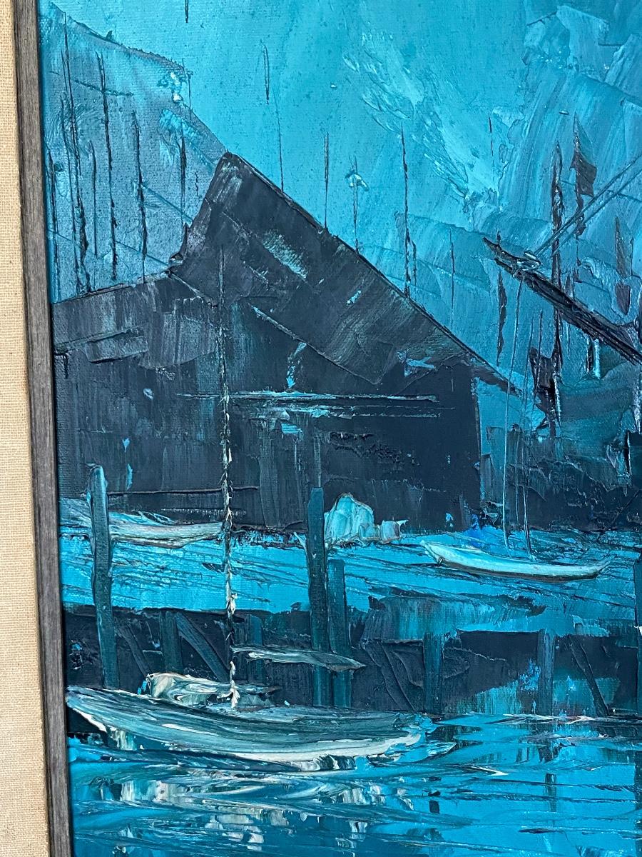 Vintage Mid Century Modern Teal Blue Nautical Wharf Fishing Village Oil Painting Charles Beauvais