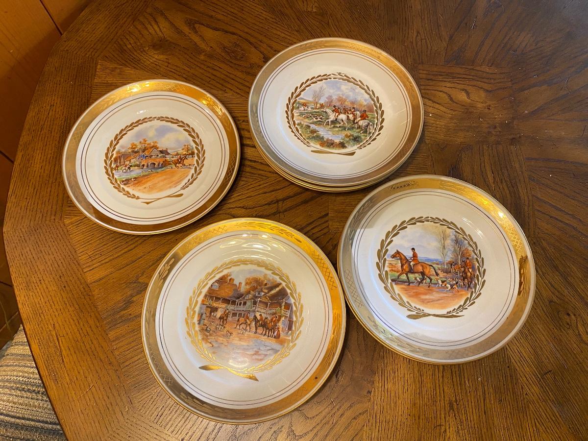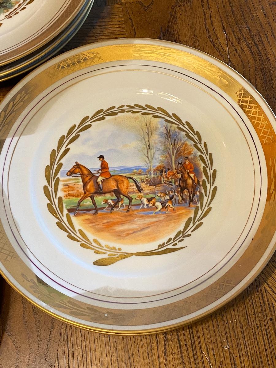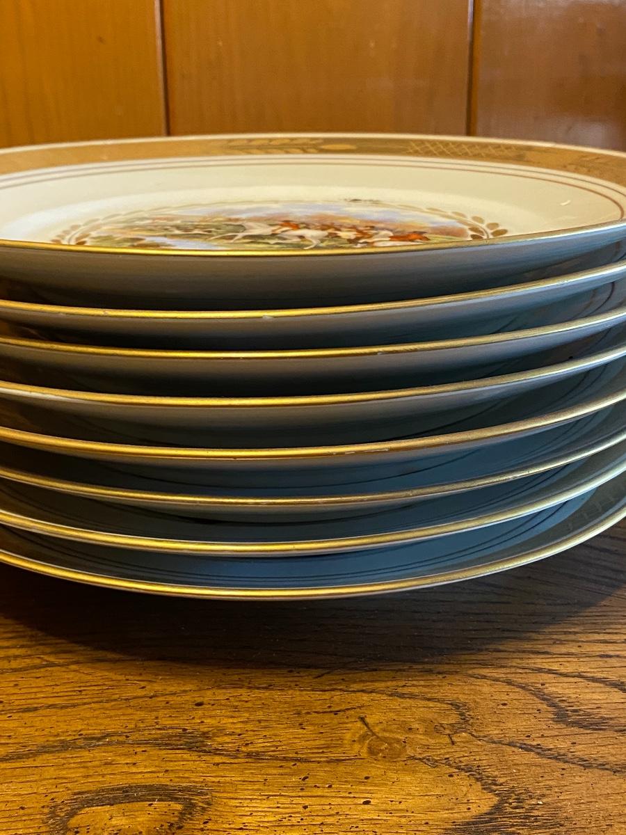 Royal Copenhagen Denmark Fox Hunt Dinner Plates set of 8, some are identical. Light wear to gold edge, no chips.