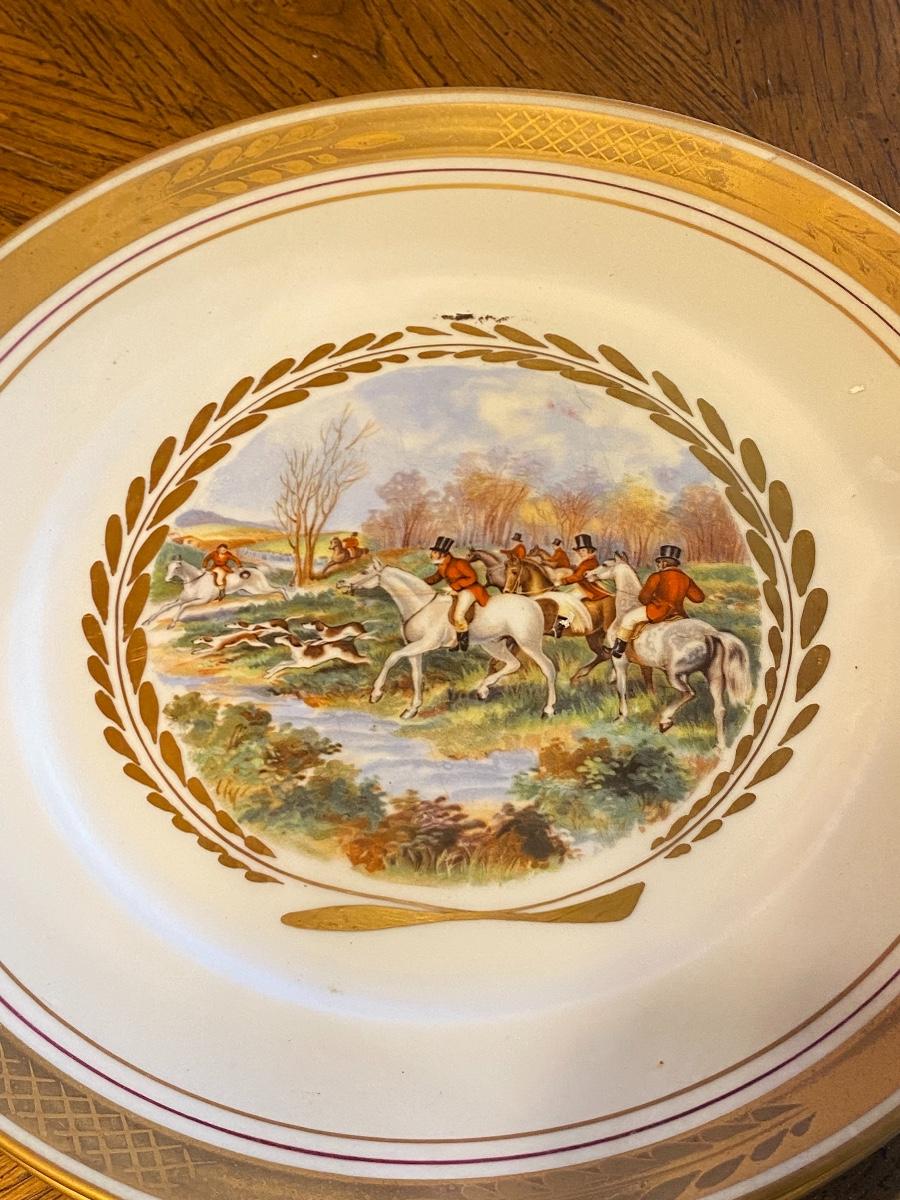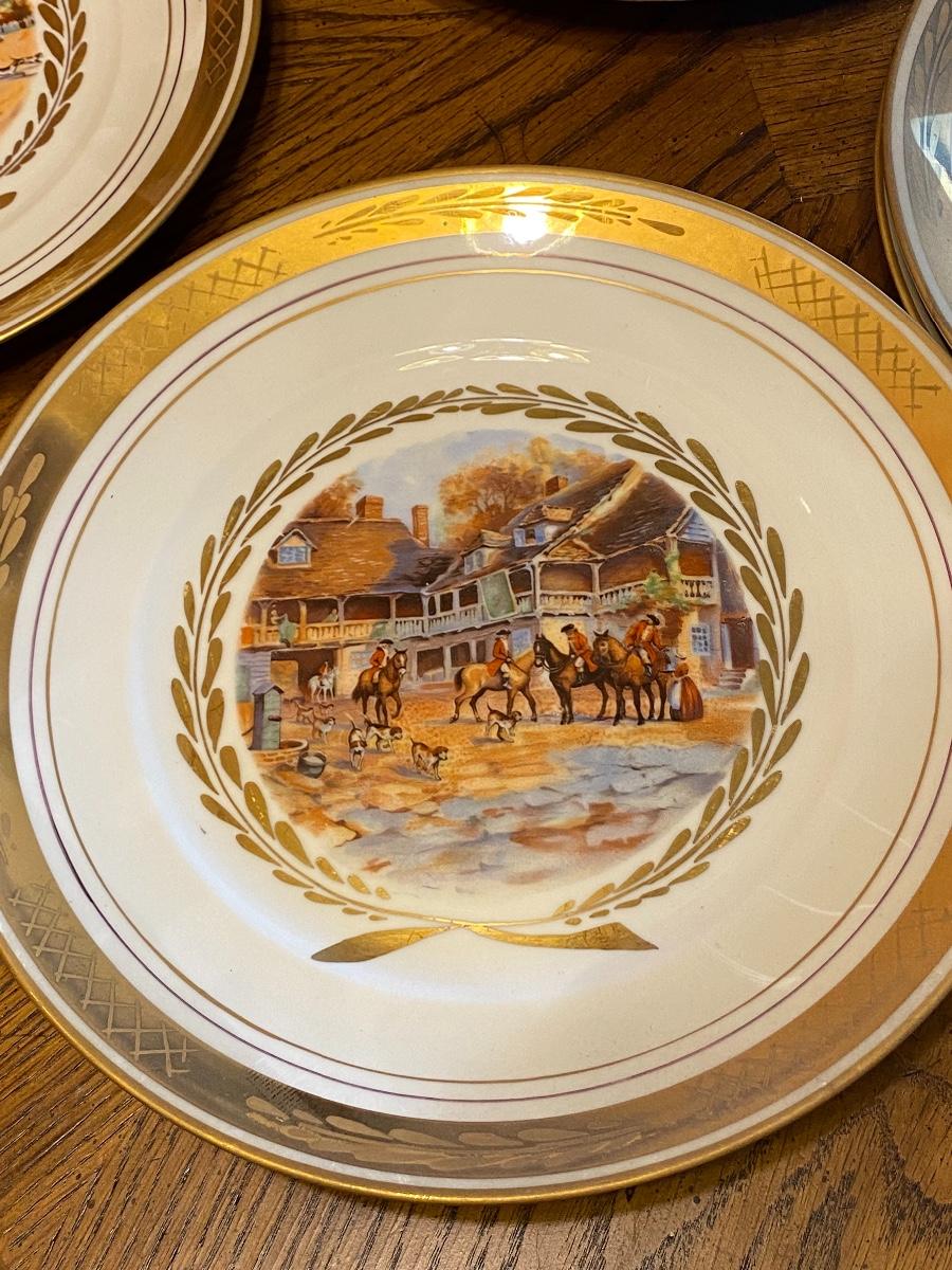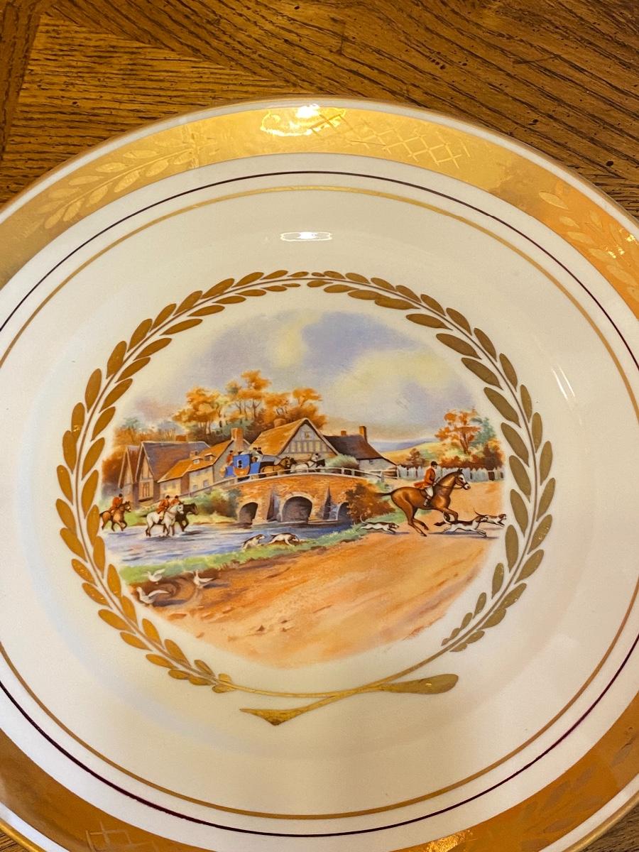 Royal Copenhagen Denmark Fox Hunt Dinner Plates set of 8, some are identical. Light wear to gold edge, no chips.