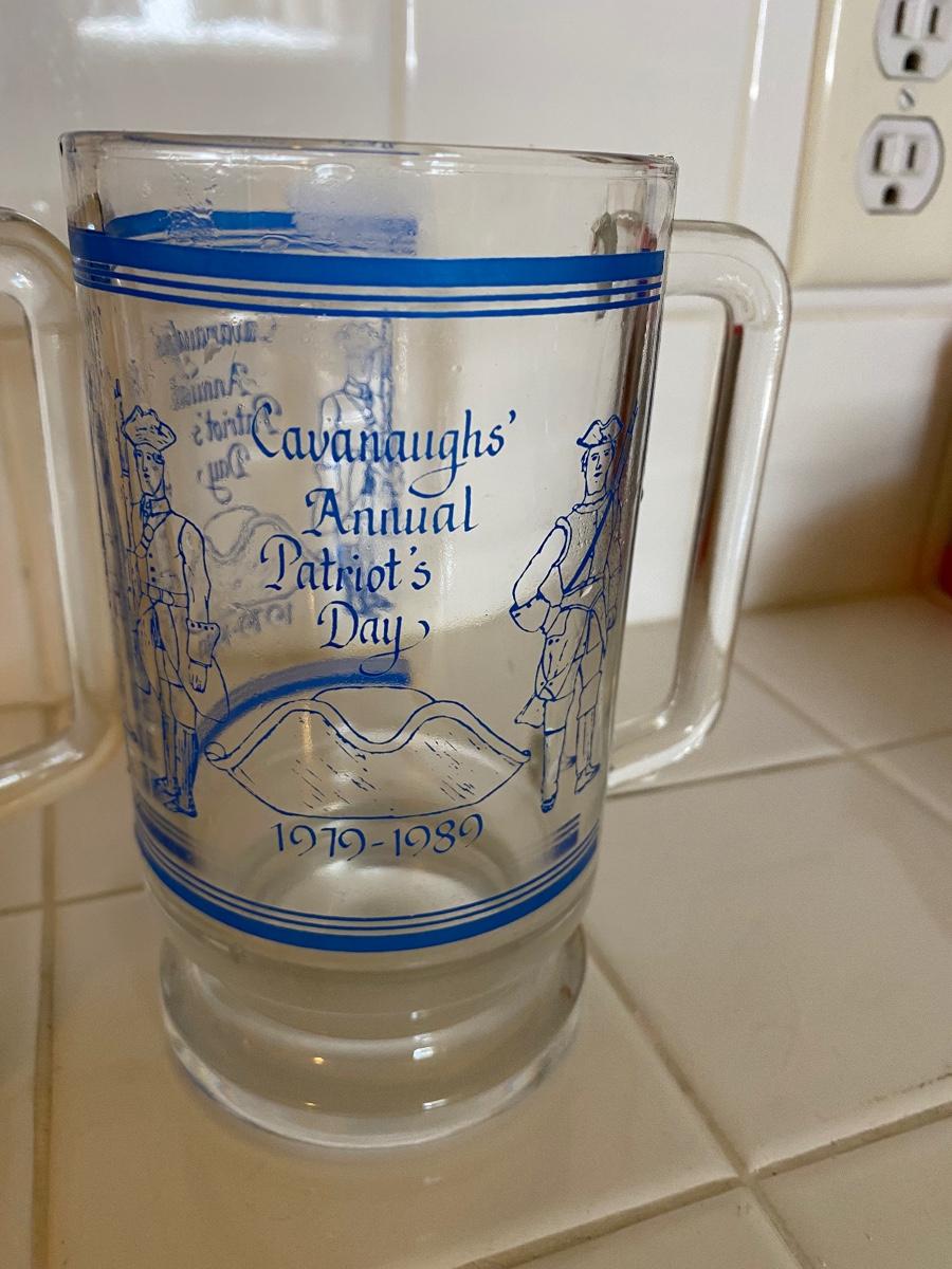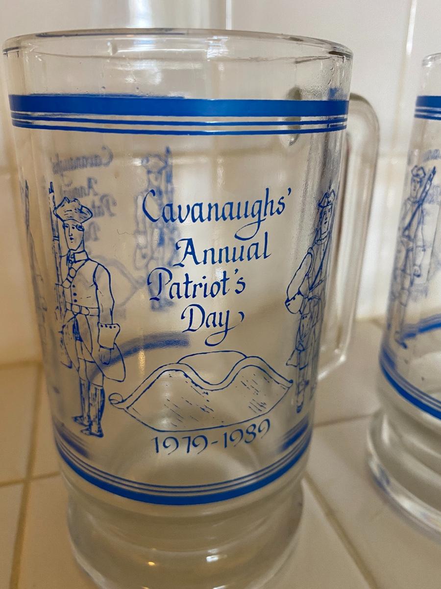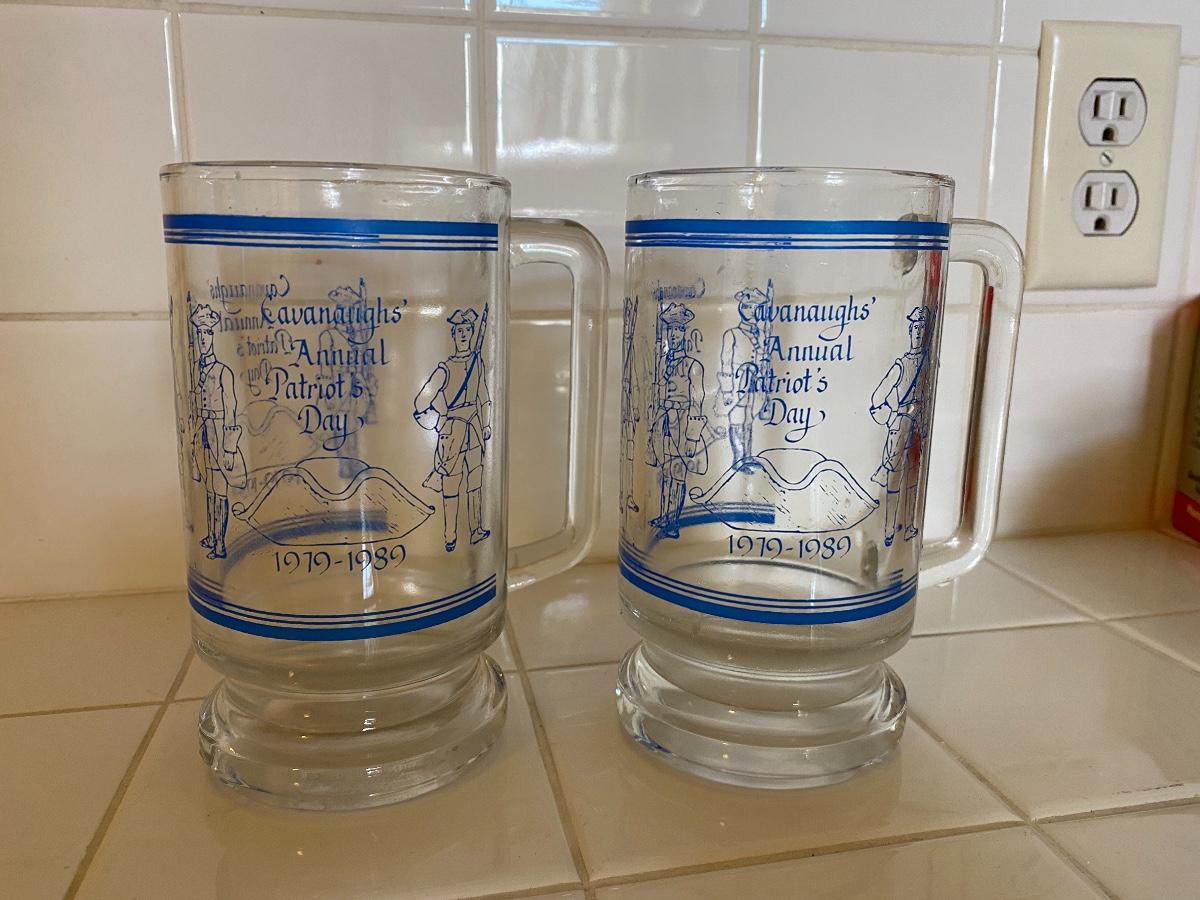 Pair of Vintage Cavanaugh's Patriots Day Glass Beer Stein Mugs 1989