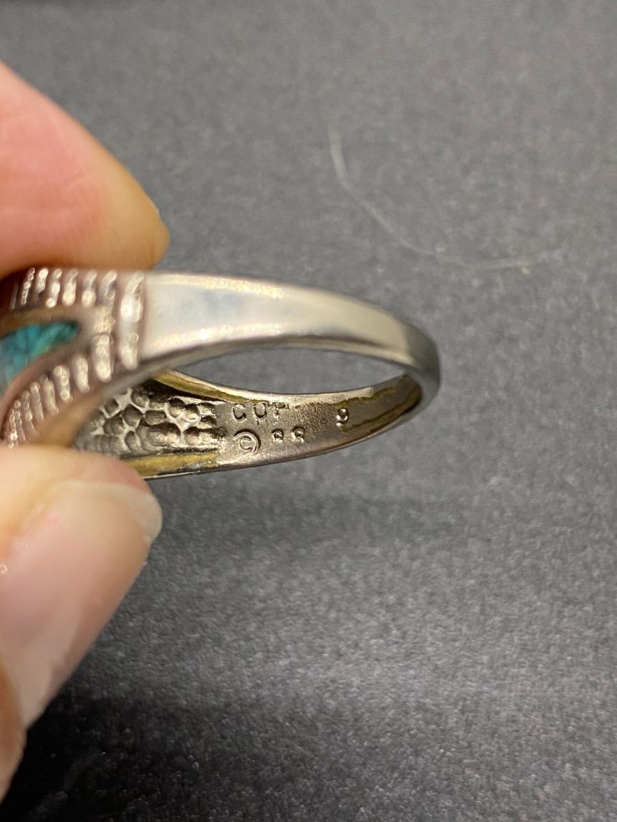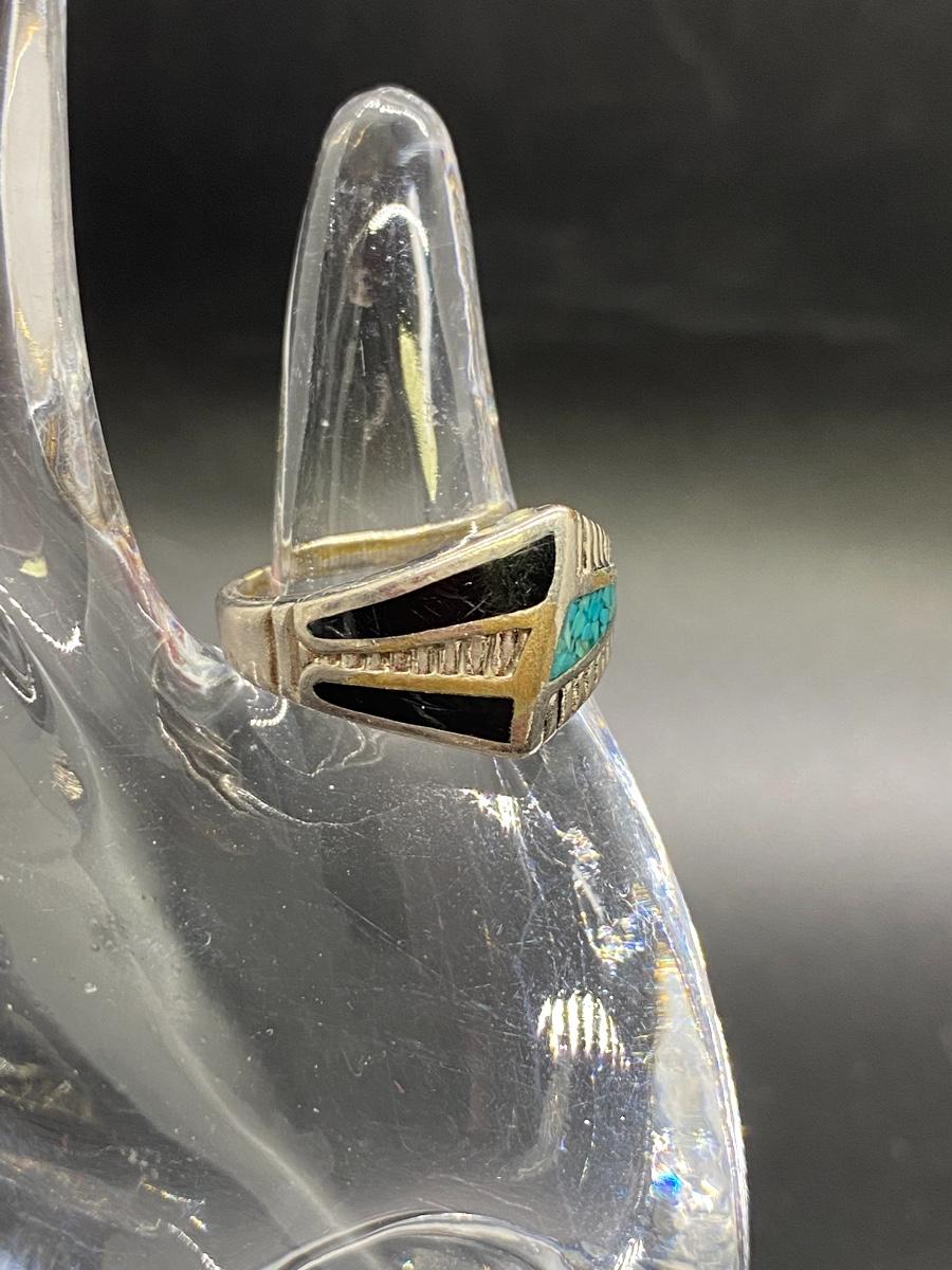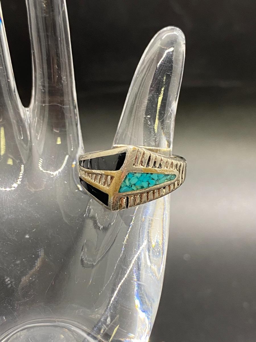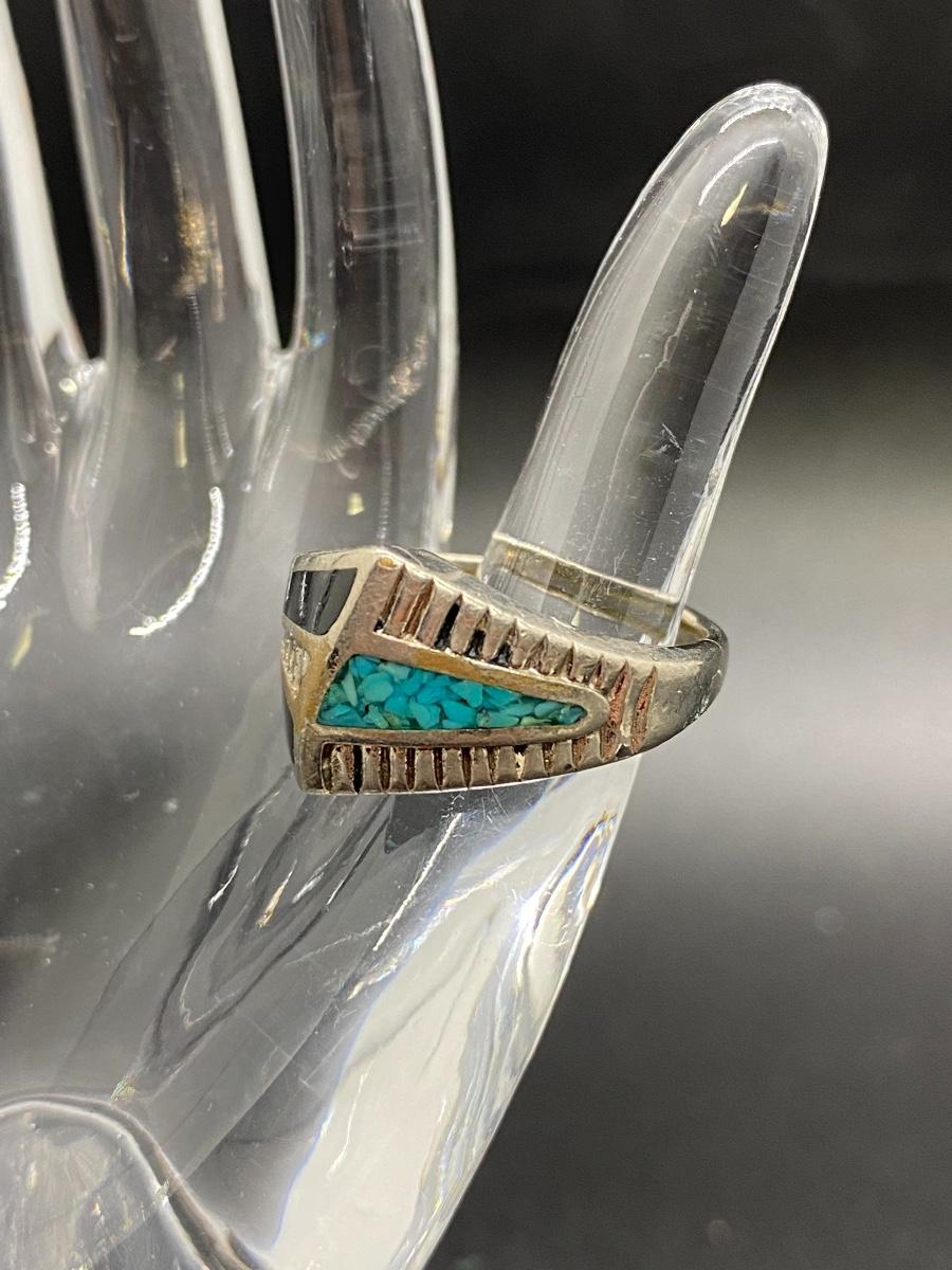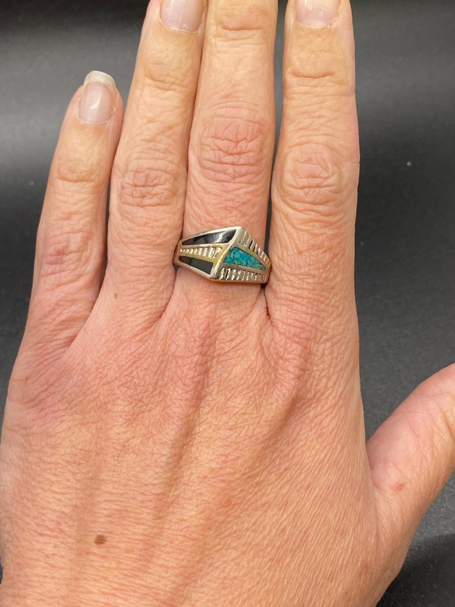 Vintage Southwestern Style Silvertone Turquoise Black Enamel Ring. It is marked inside but it is not sterling, there is wear to the metal. Fits like a 7 or 8.