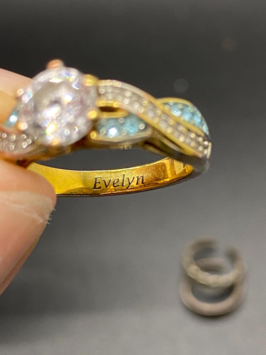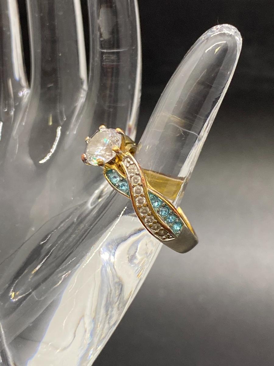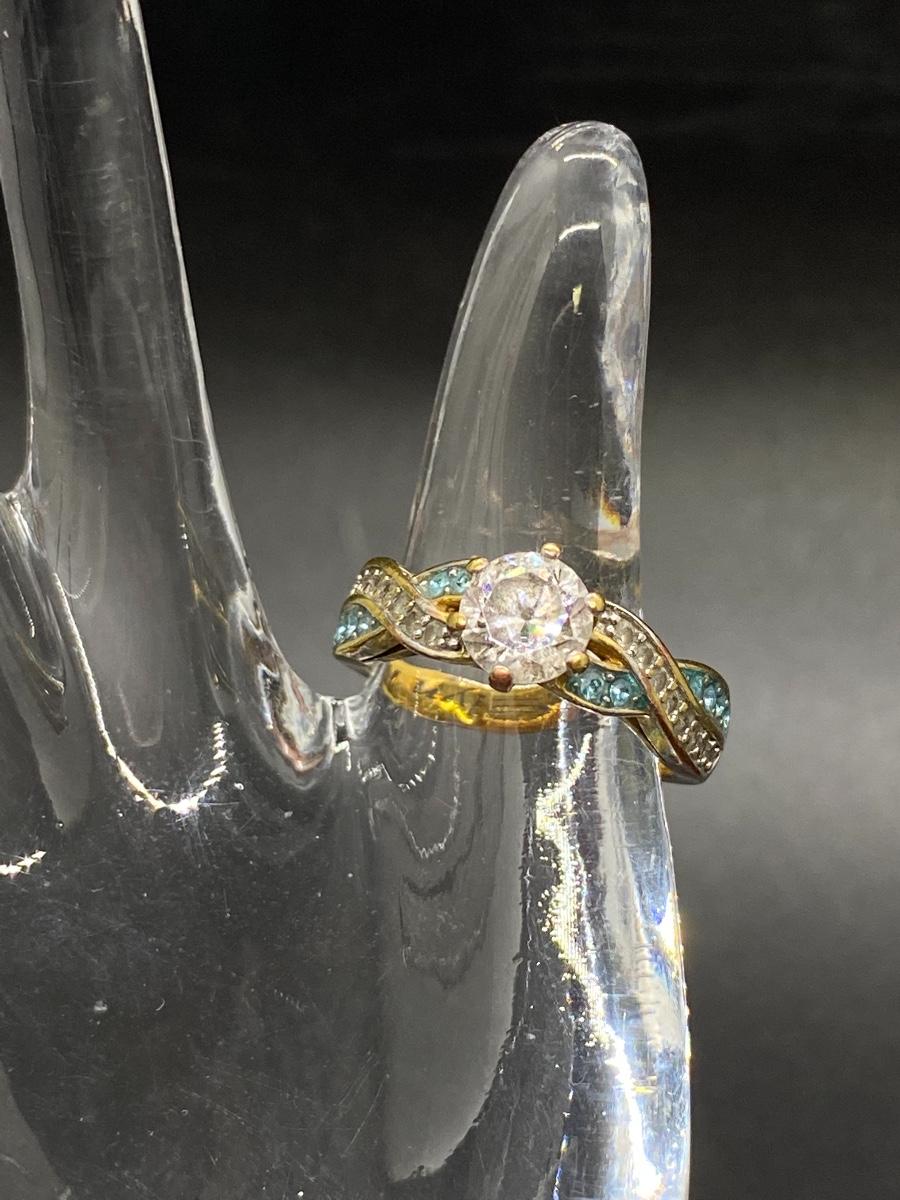 Goldtone Twisted Clear & Blue CZ Ring. Engraved inside "Evelyn". Gold plate has signs of wear. About a 6.5 size.