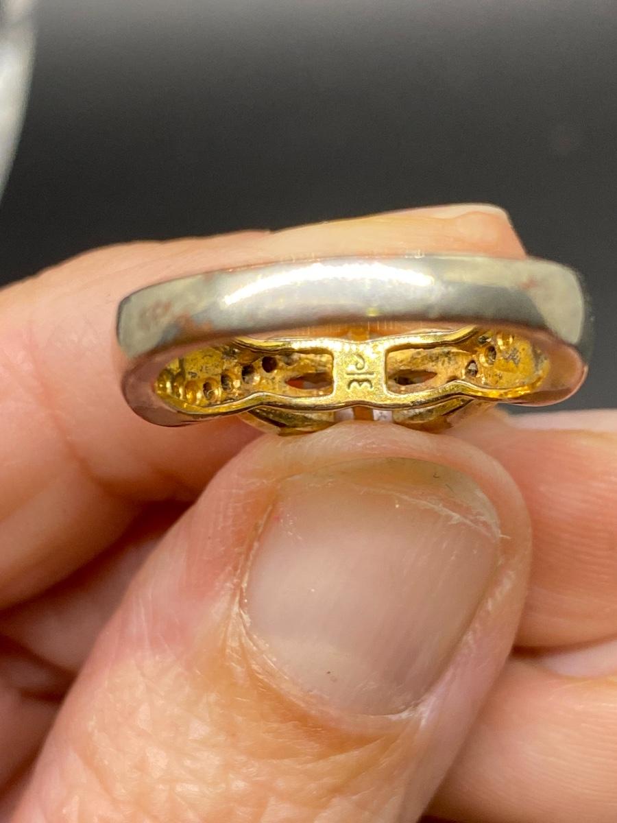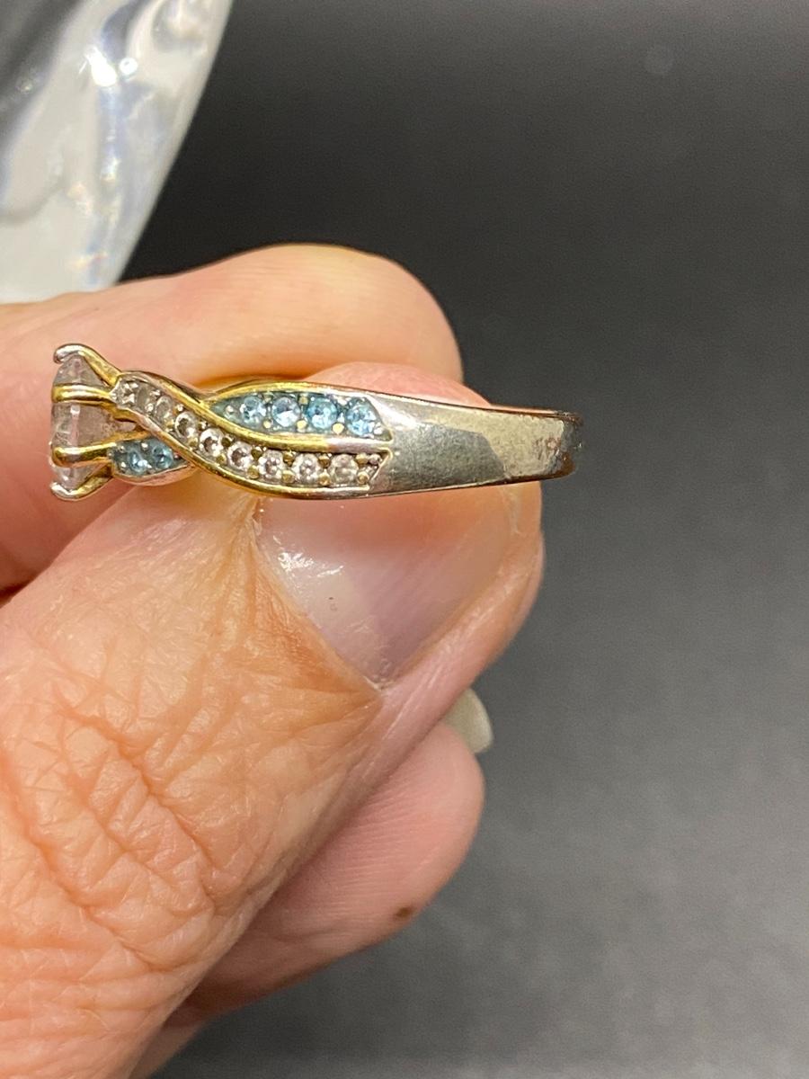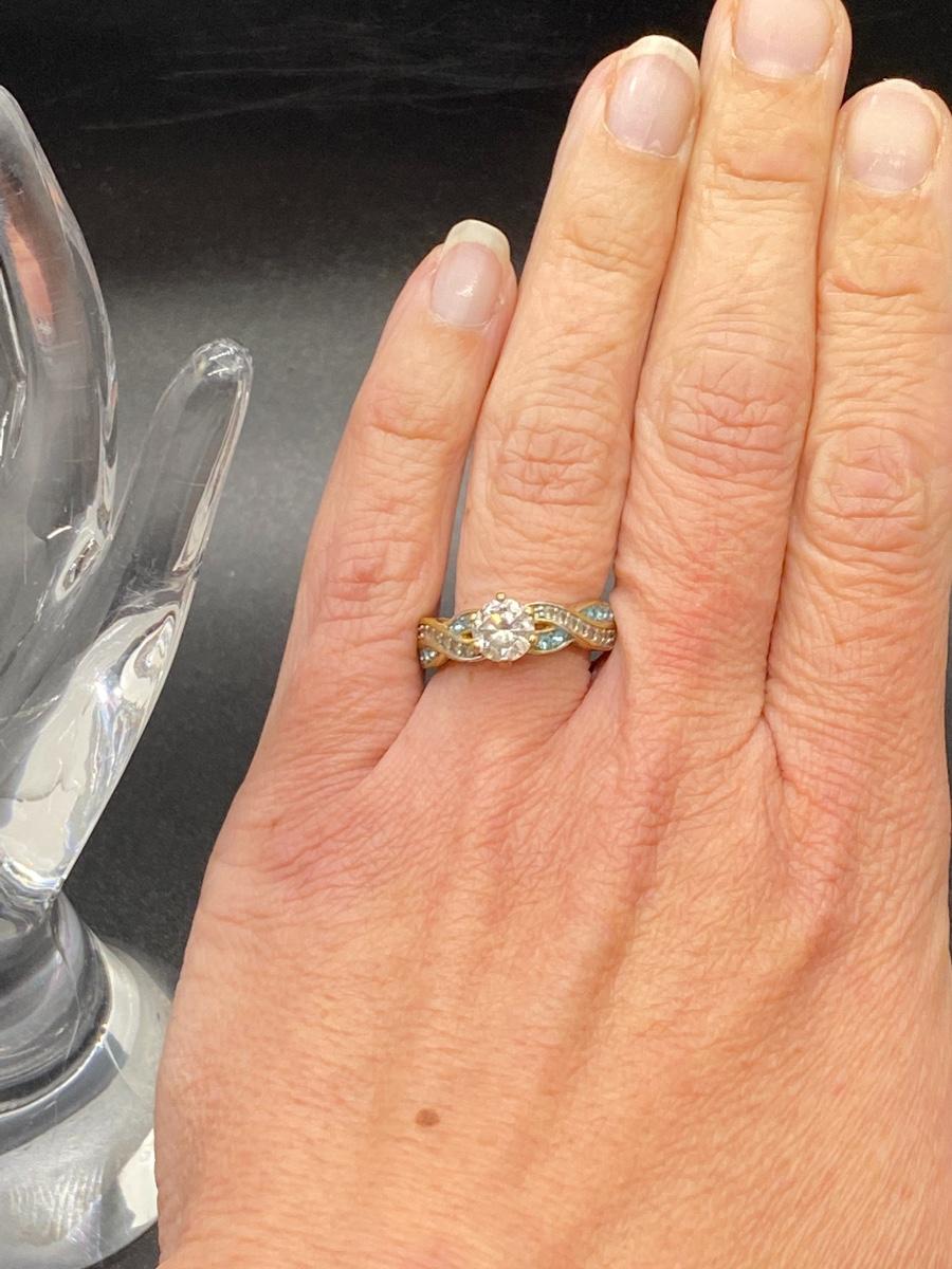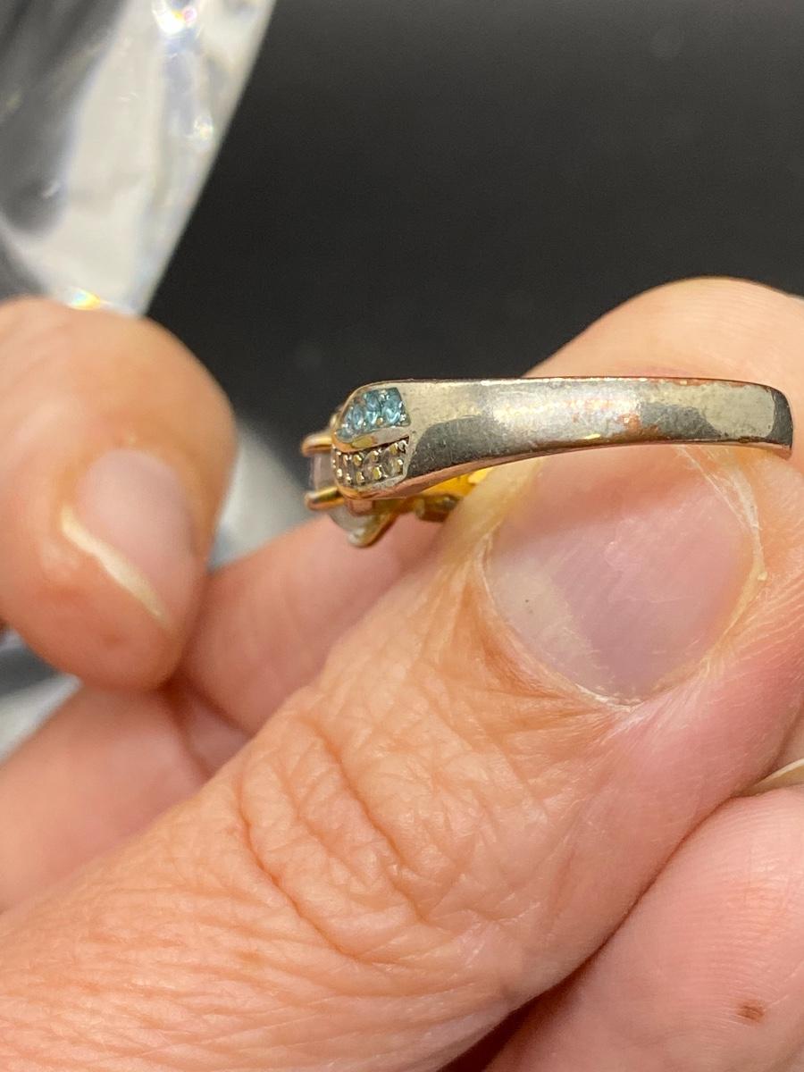 Goldtone Twisted Clear & Blue CZ Ring. Engraved inside "Evelyn". Gold plate has signs of wear. About a 6.5 size.