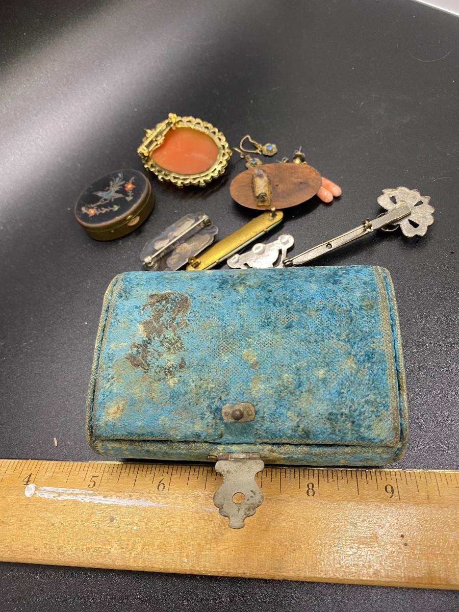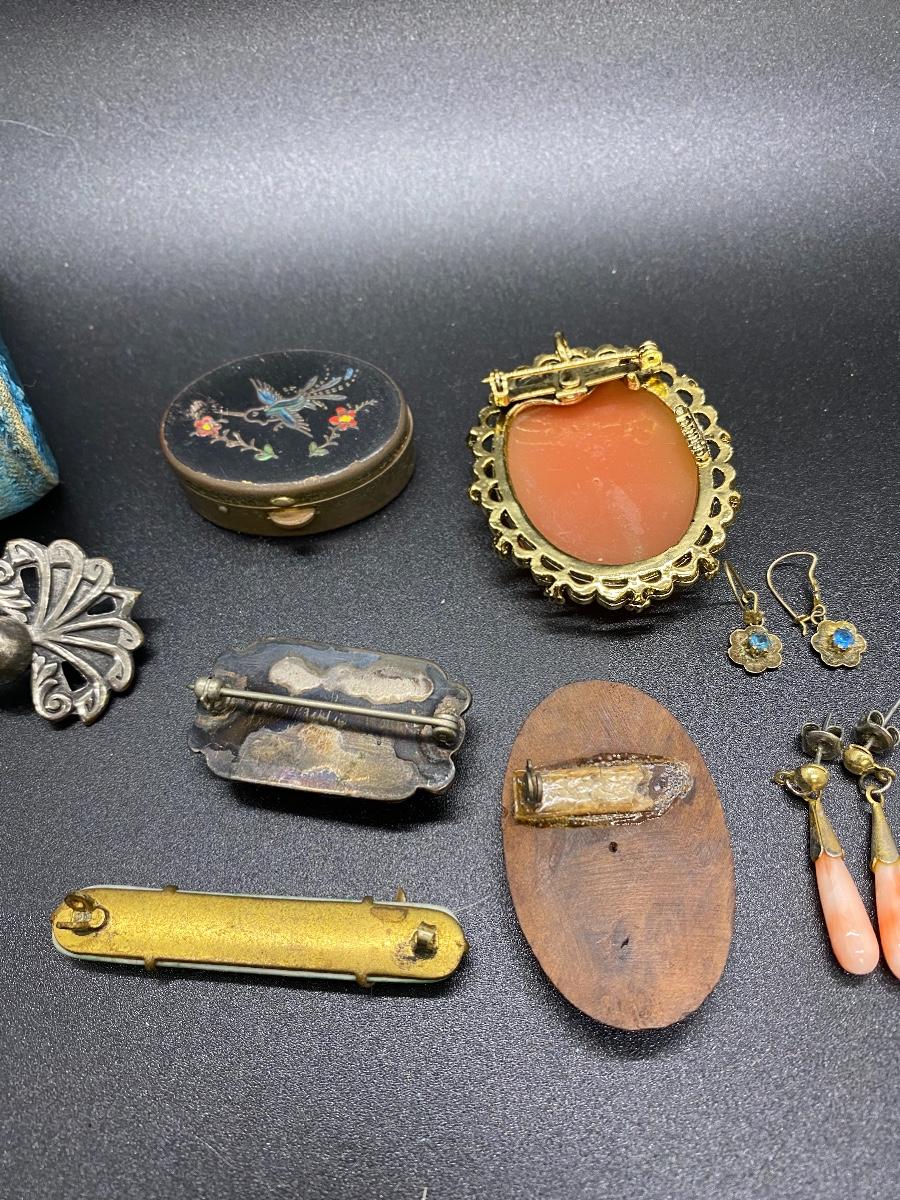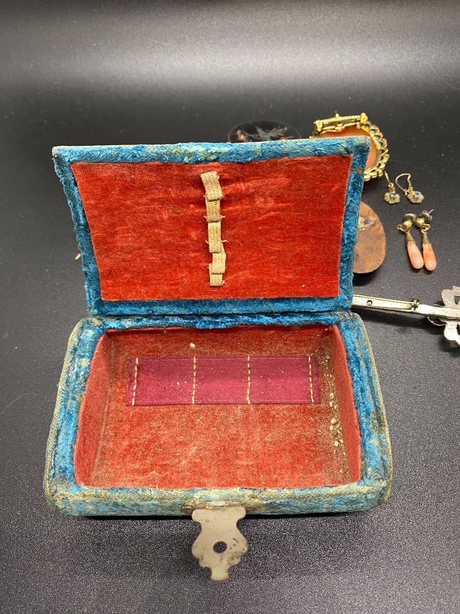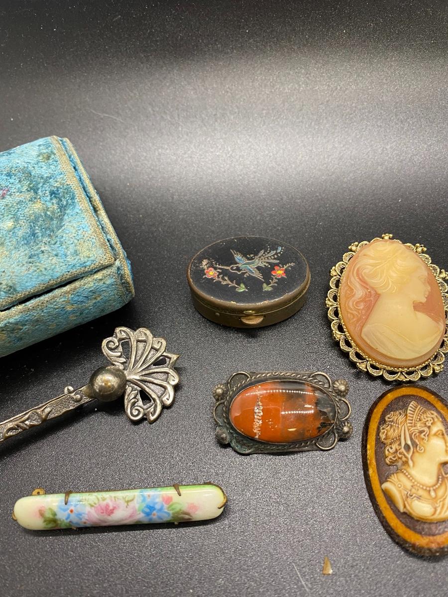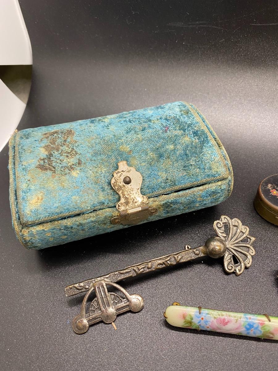 Antique & vintage Victorian Lot. Jewelry, trinket pill box, and a velvet box. Enamel on pill box is a little worn. The velvet box looks like a small size sewing box or manicure tool box. A couple pins are missing the backs, great for repurpose.