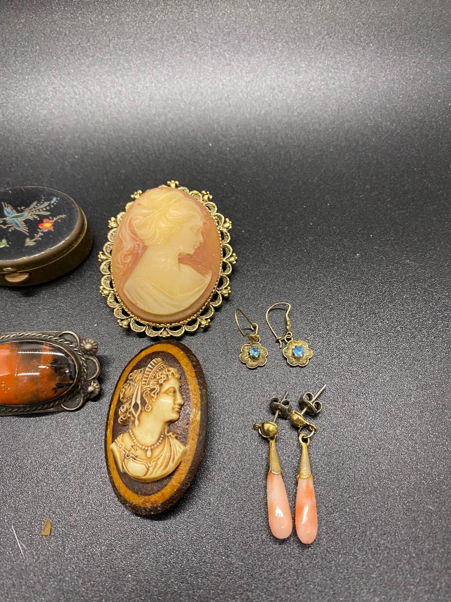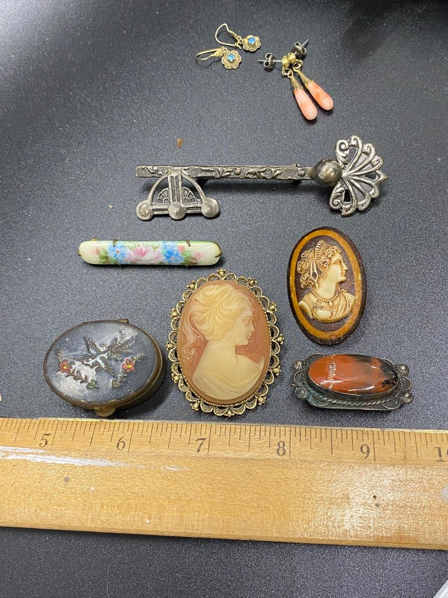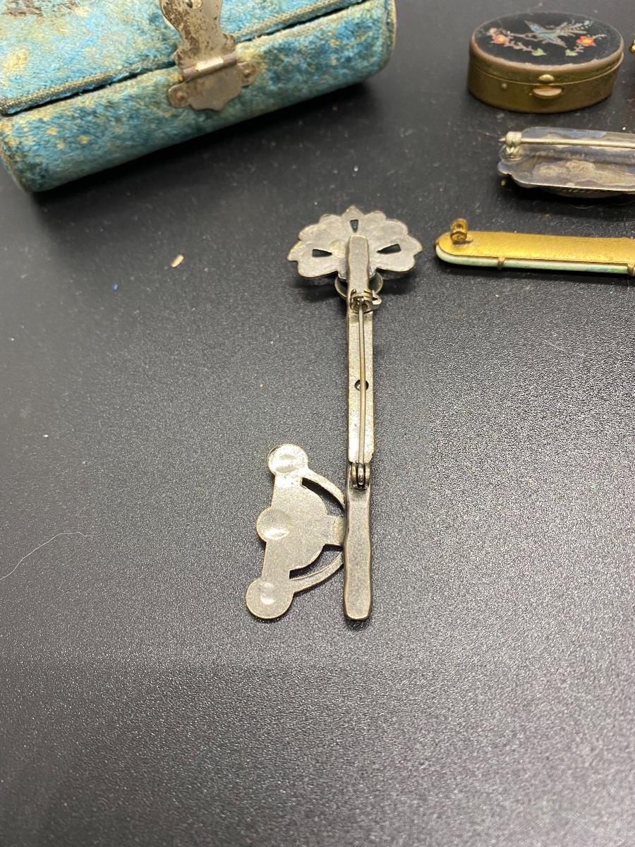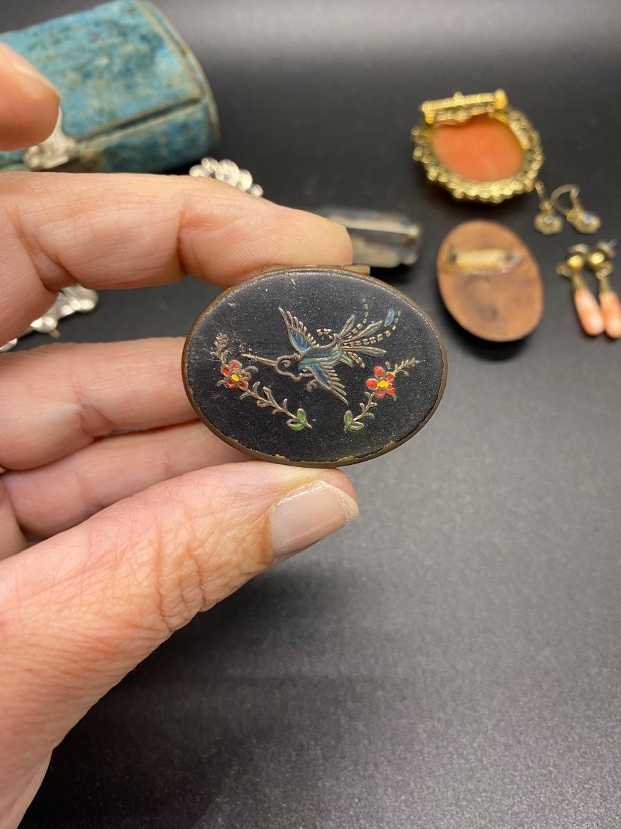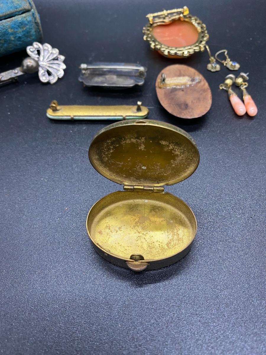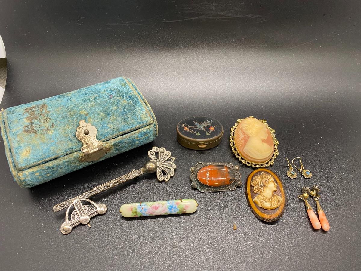 Antique & vintage Victorian Lot. Jewelry, trinket pill box, and a velvet box. Enamel on pill box is a little worn. The velvet box looks like a small size sewing box or manicure tool box. A couple pins are missing the backs, great for repurpose.