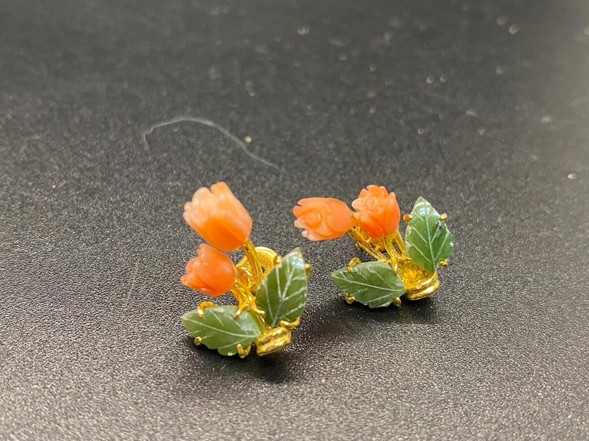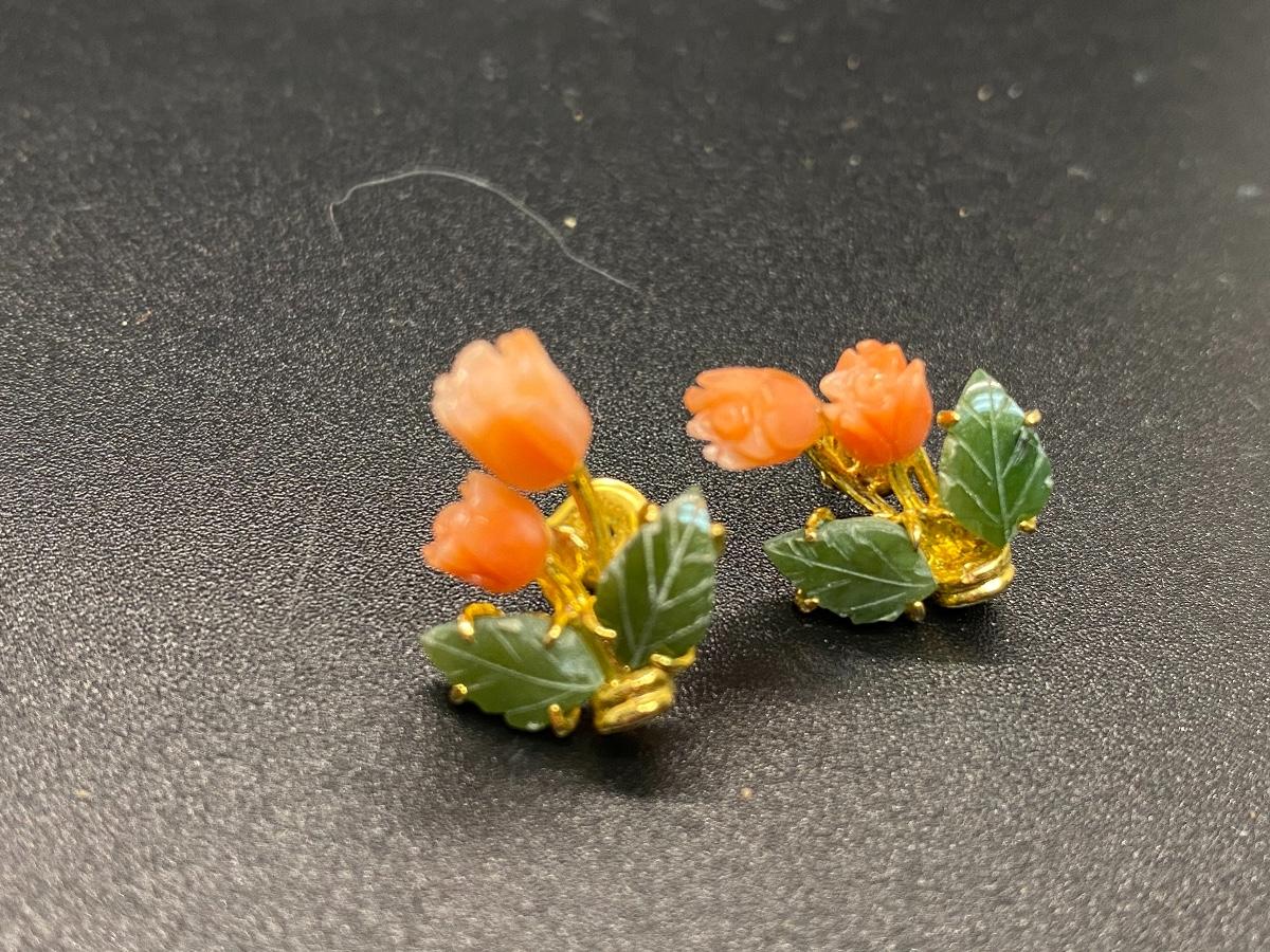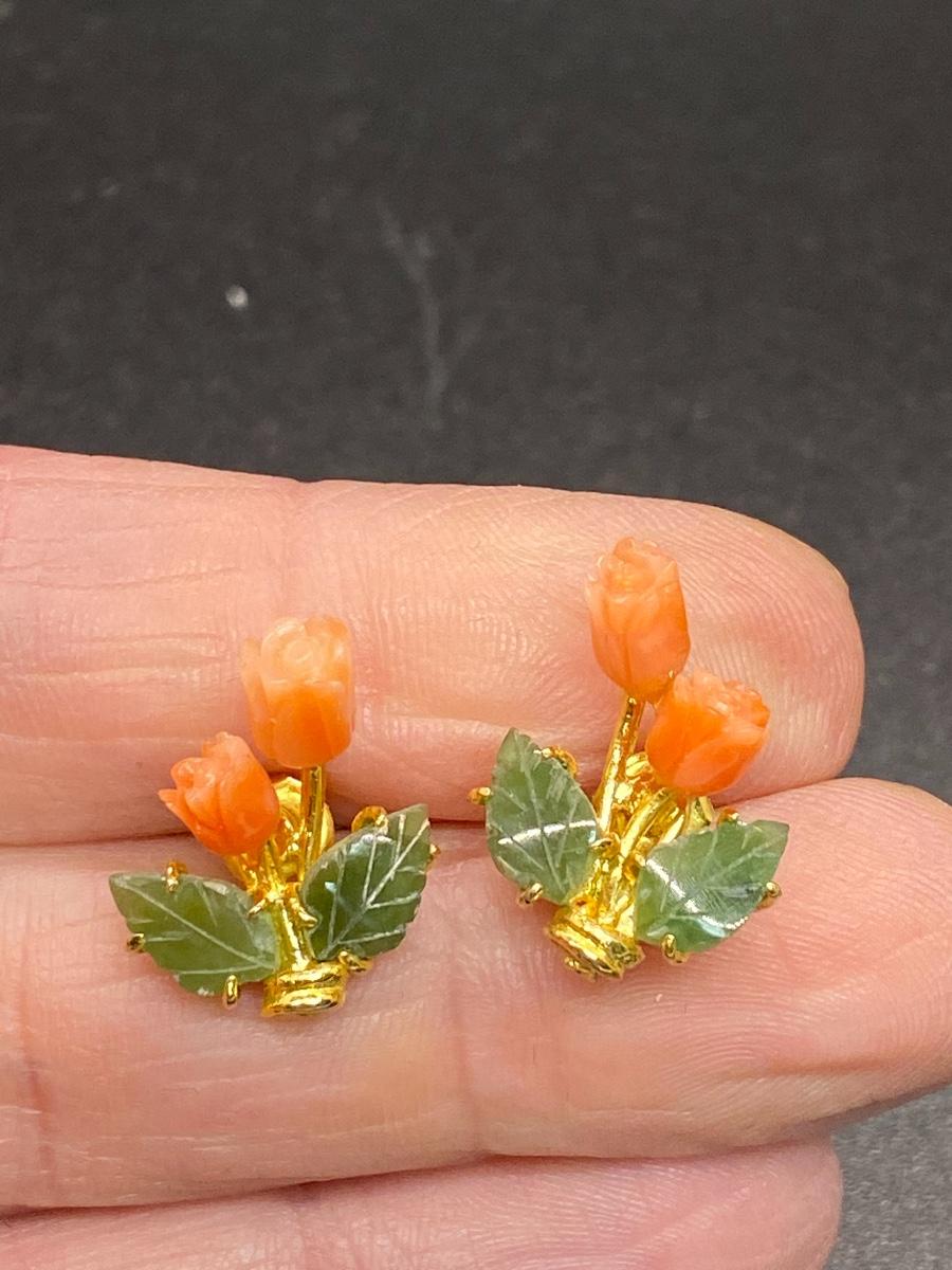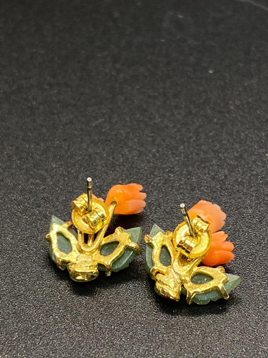 Goldtone Coral & Jade Floral Earrings. For pierced ears, about 1/2" size.