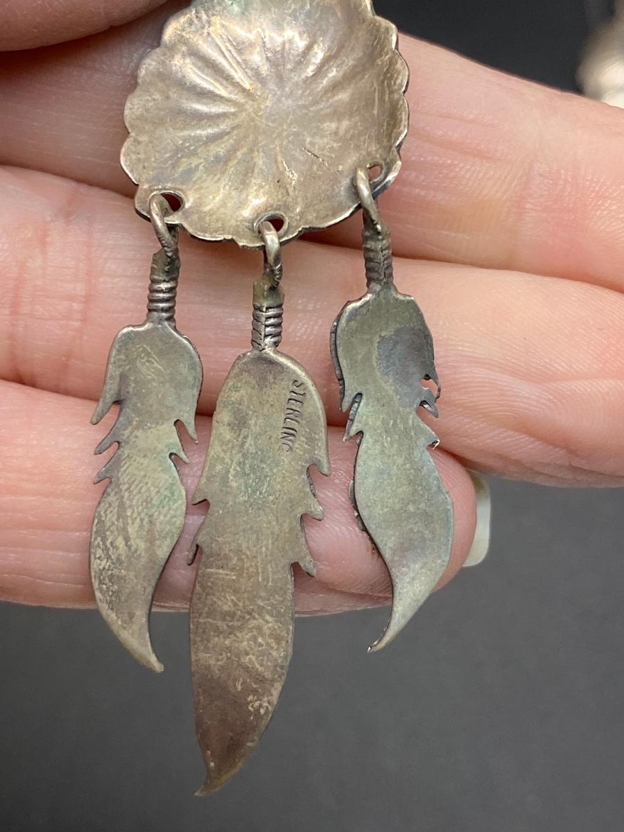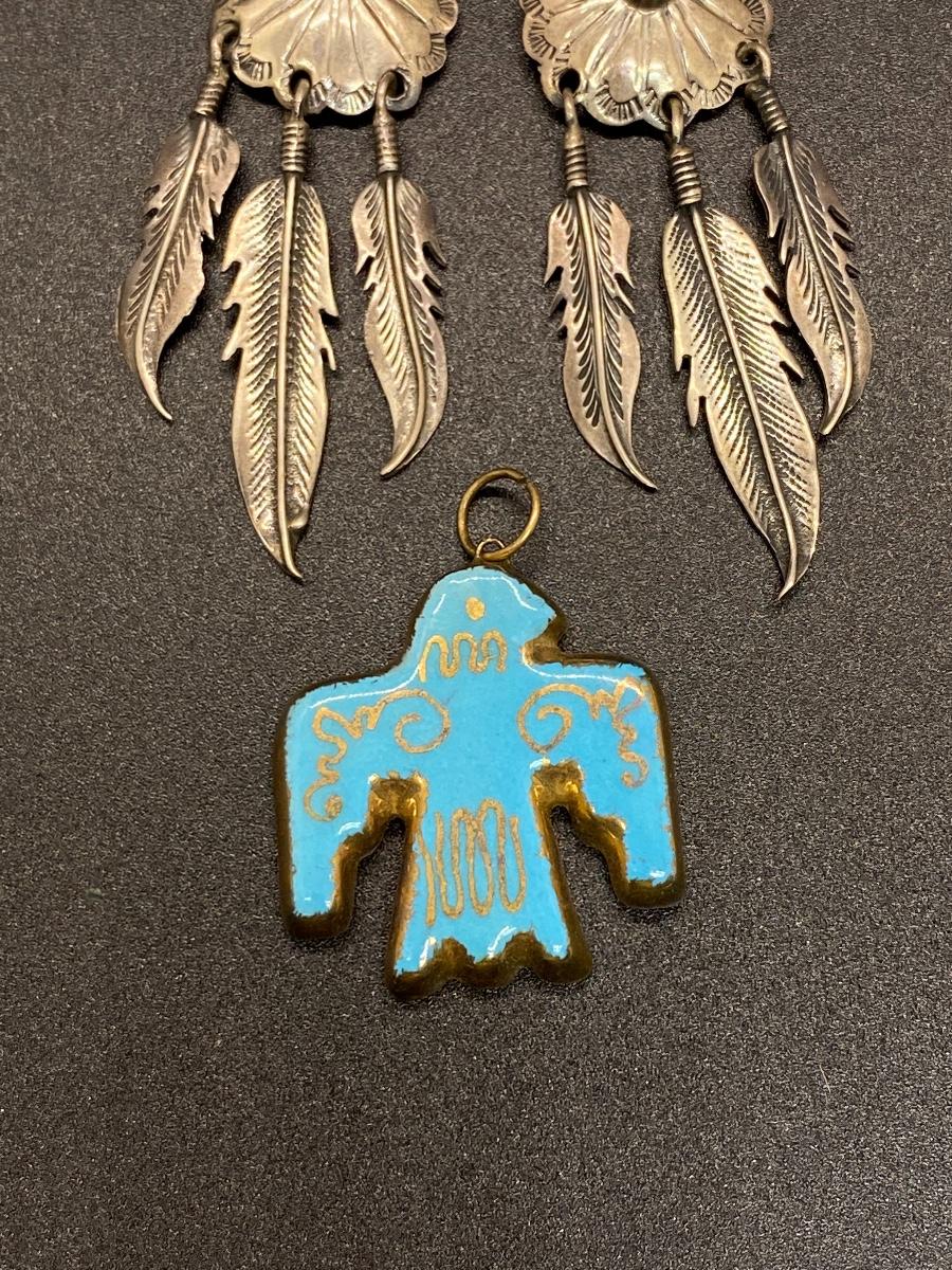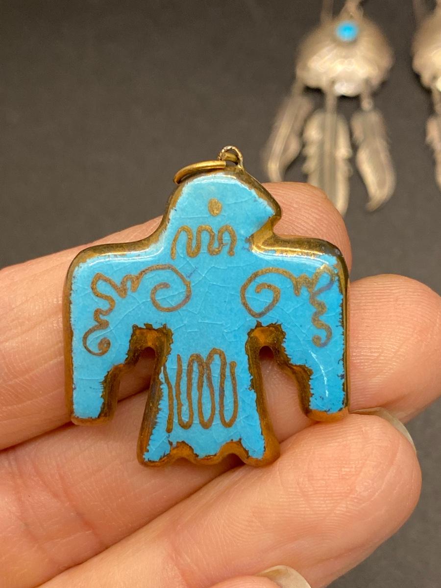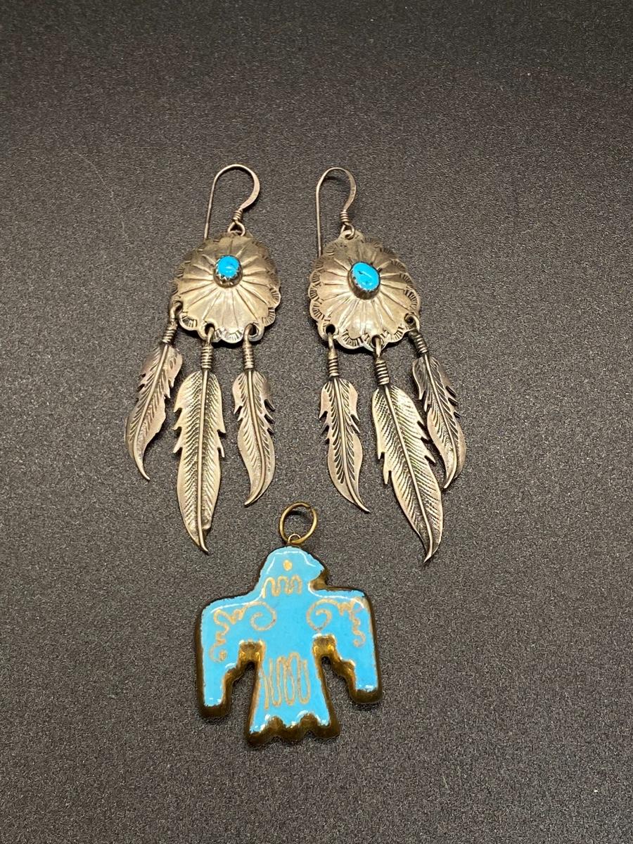 Sterling Silver Turquoise Southwestern Medallion Feather Earrings & Ceramic Bird Pendant. The earring are marked sterling on a feather. There is crazing in the ceramic bird.