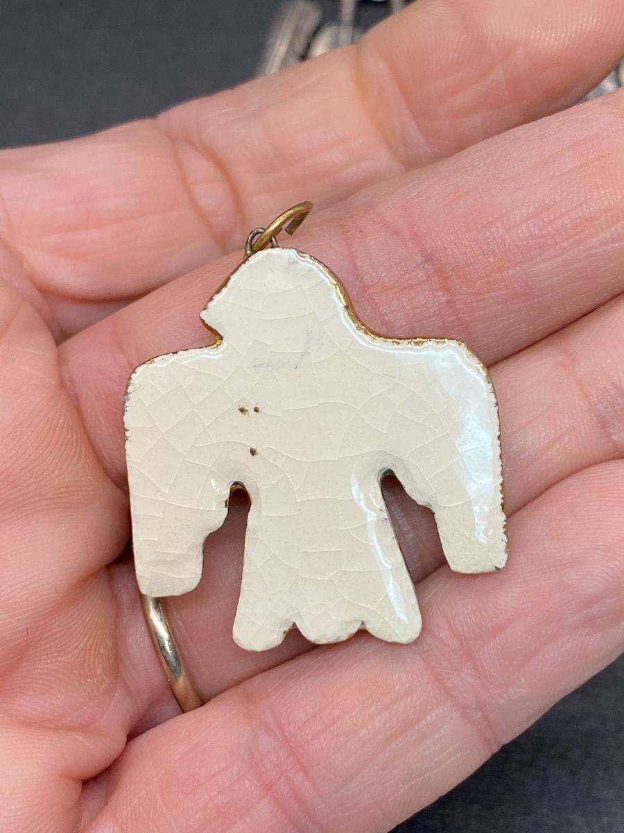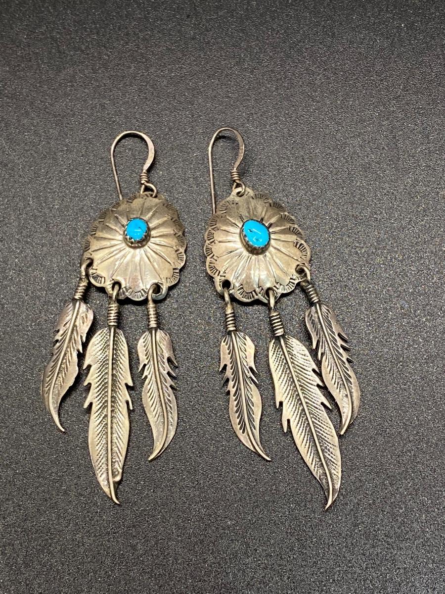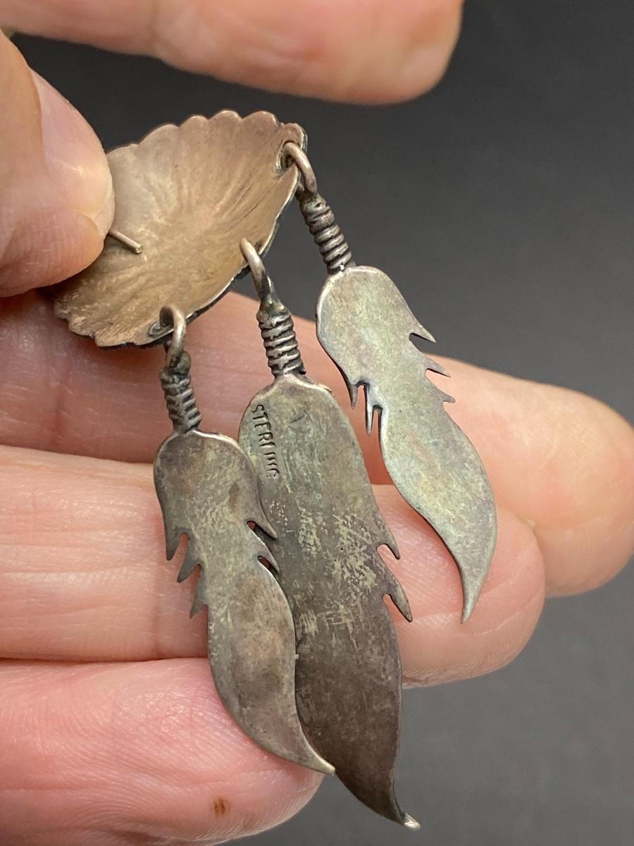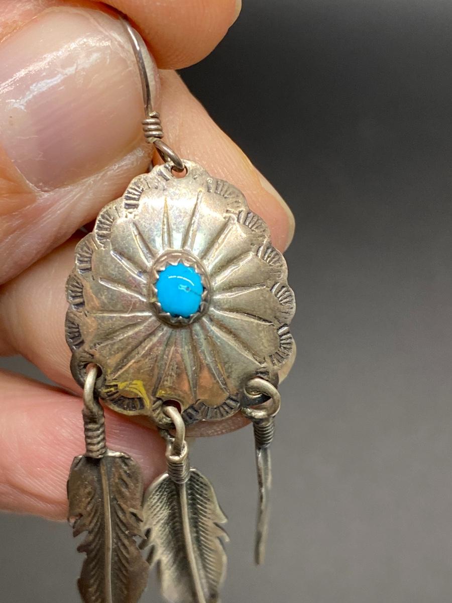 Sterling Silver Turquoise Southwestern Medallion Feather Earrings & Ceramic Bird Pendant. The earring are marked sterling on a feather. There is crazing in the ceramic bird.