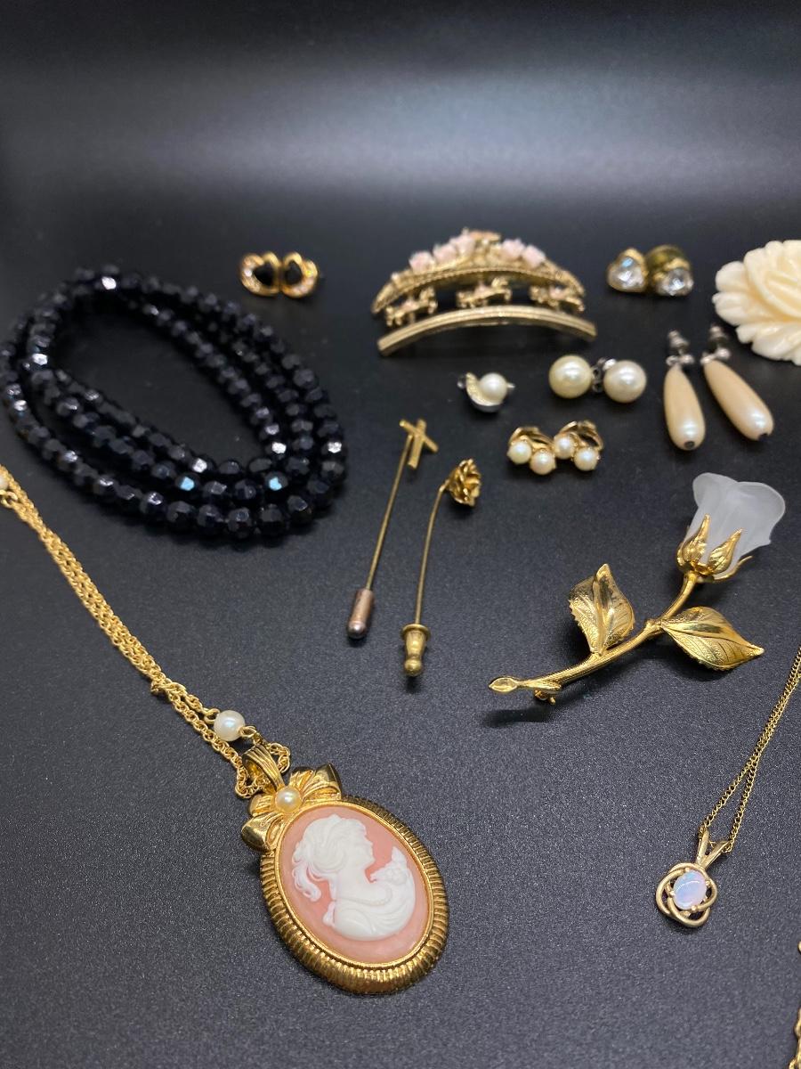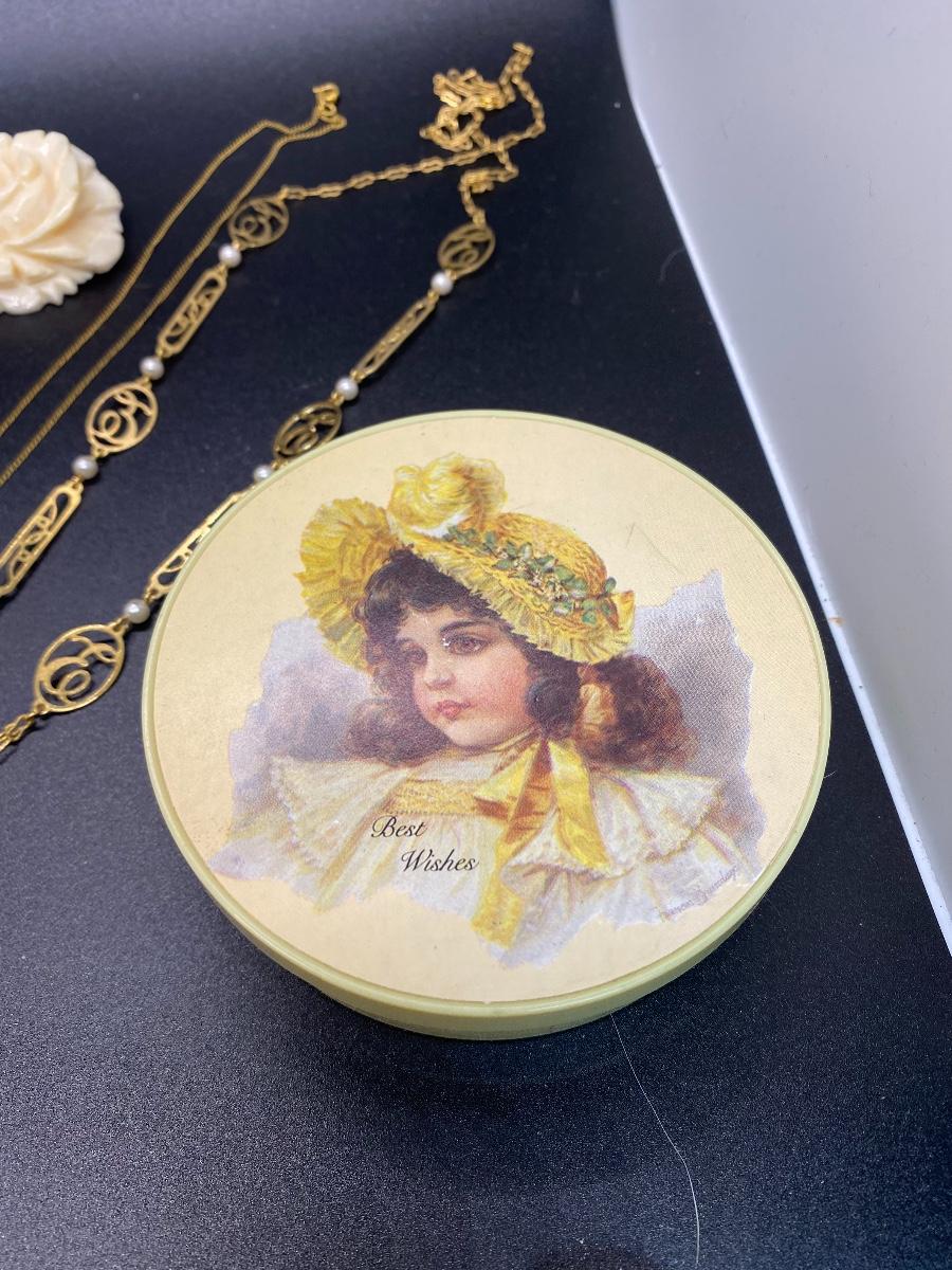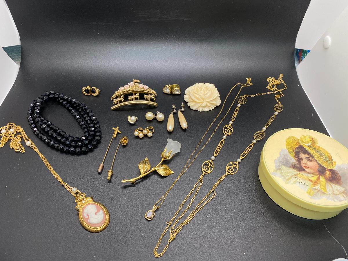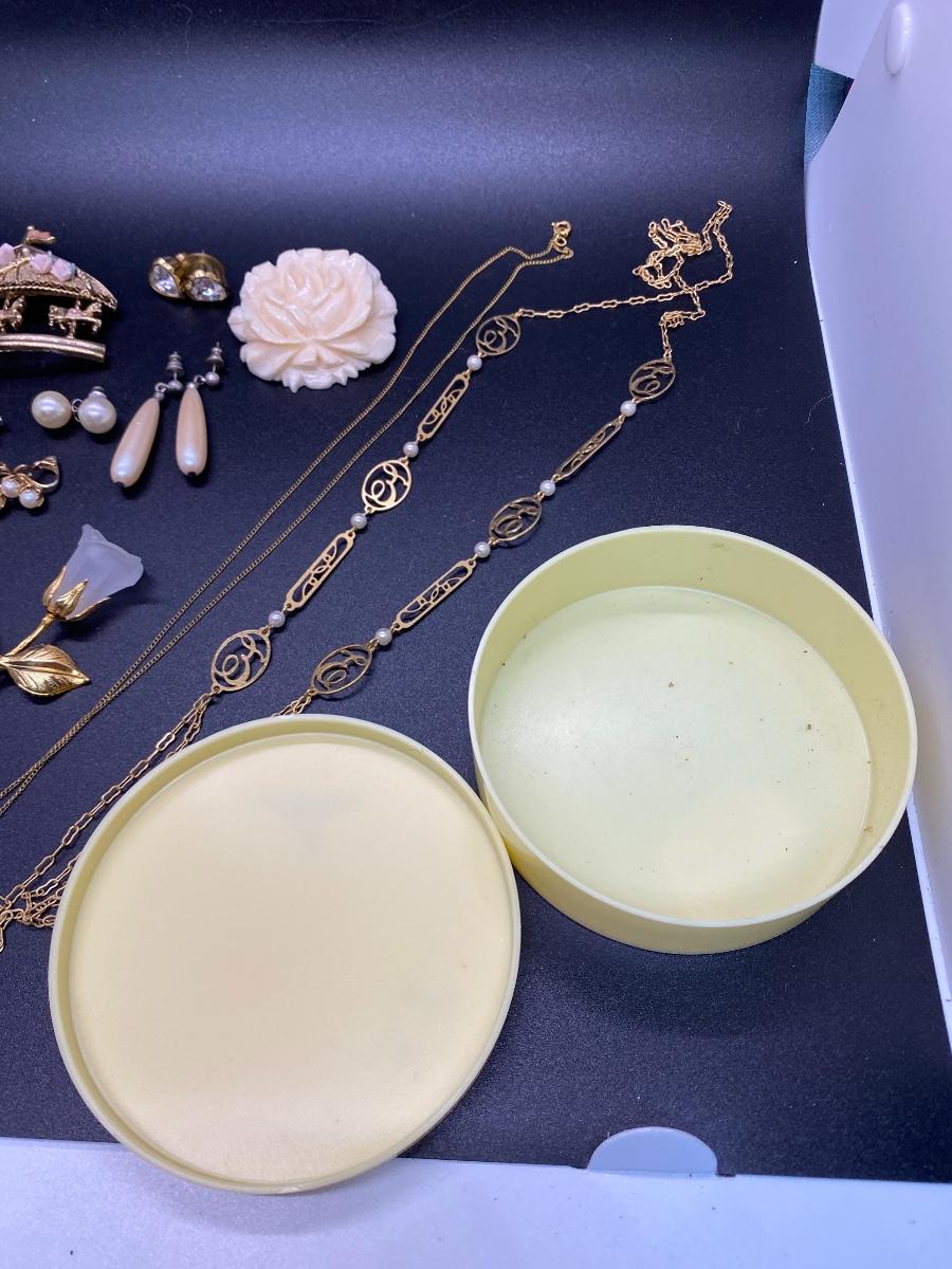 Goldtone Victorian Romance Style Jewelry Lot. Included is the plastic powder/trinket box.