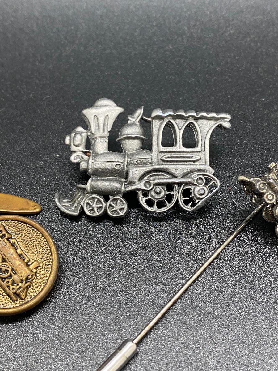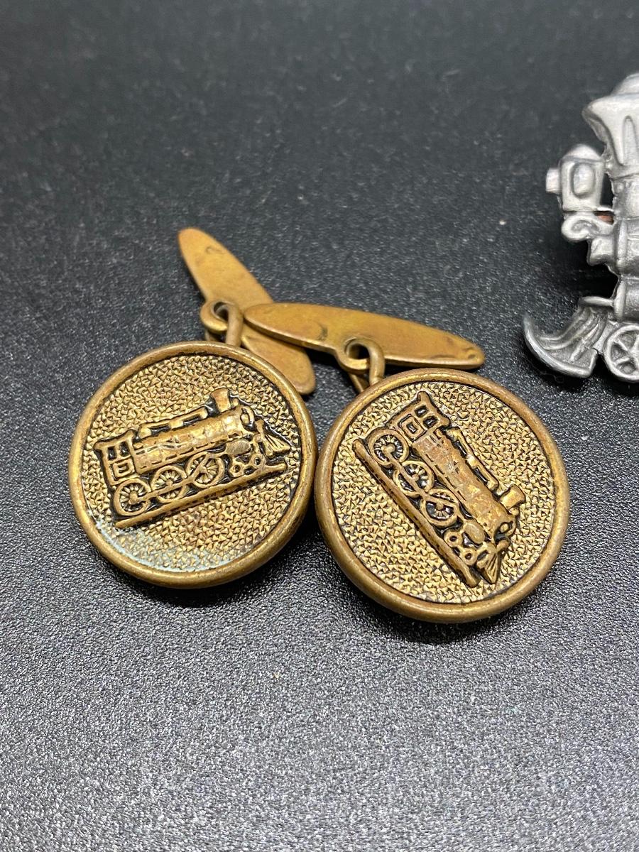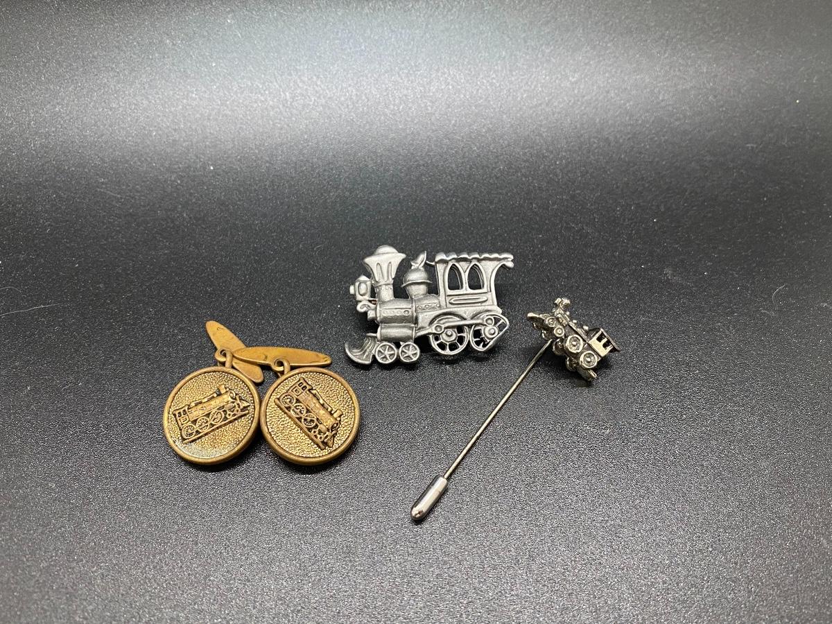 Three piece jewelry lot locomotive train themed. Cufflinks, pin and stick pin.