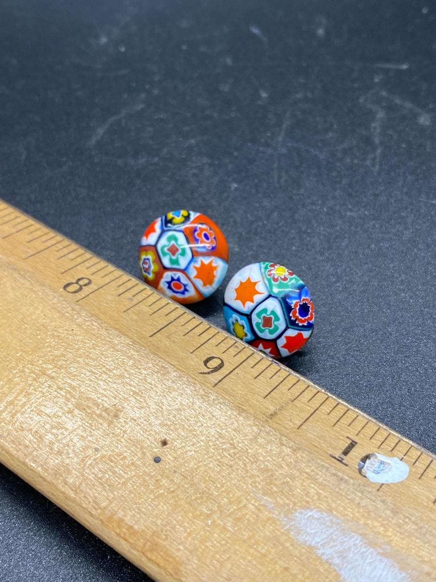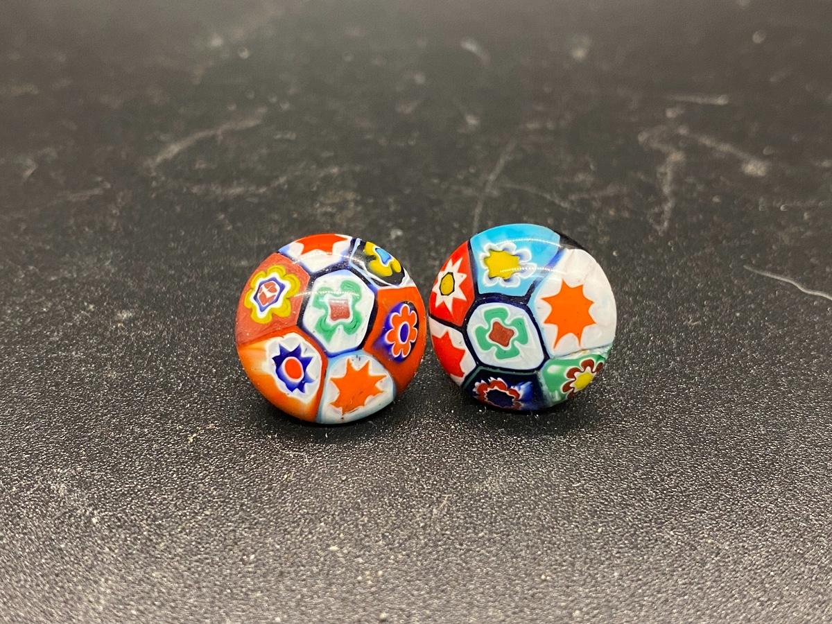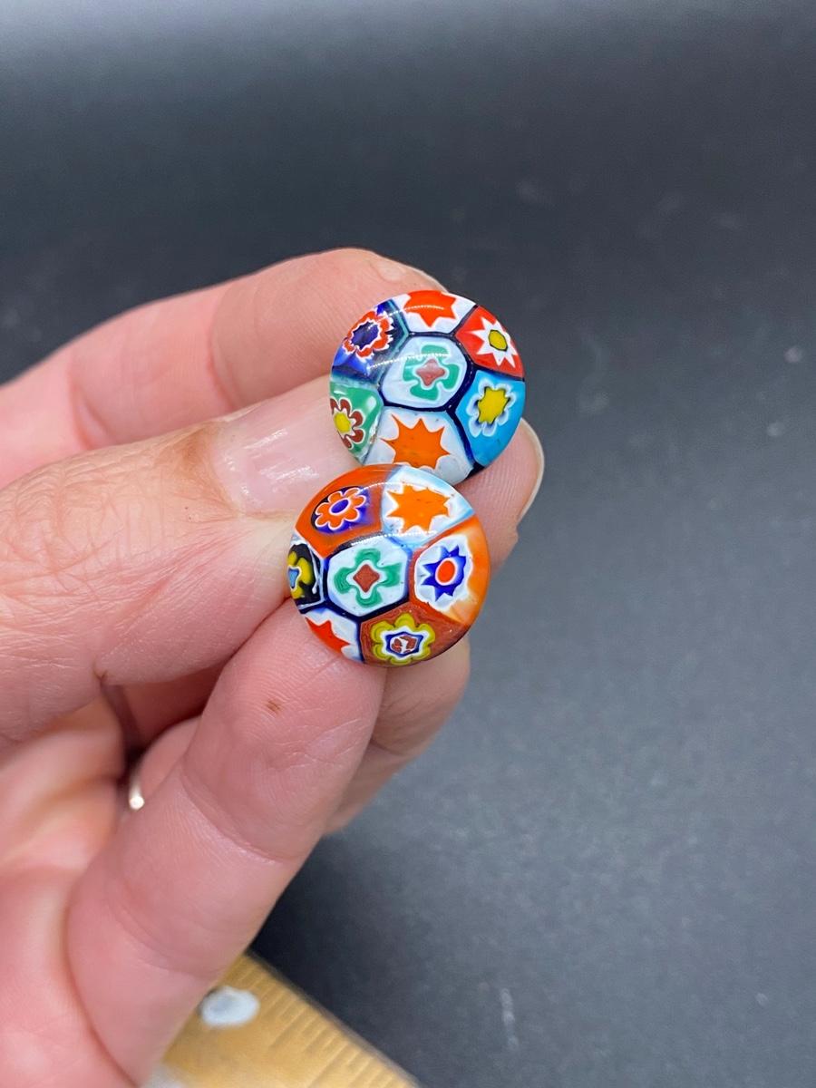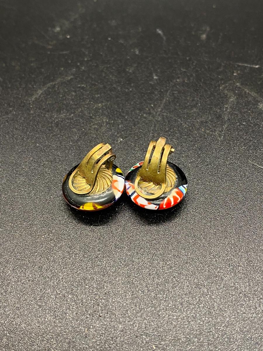 Pair of vintage millefiori button earrings. Clip style backs. Bright colorful designs.