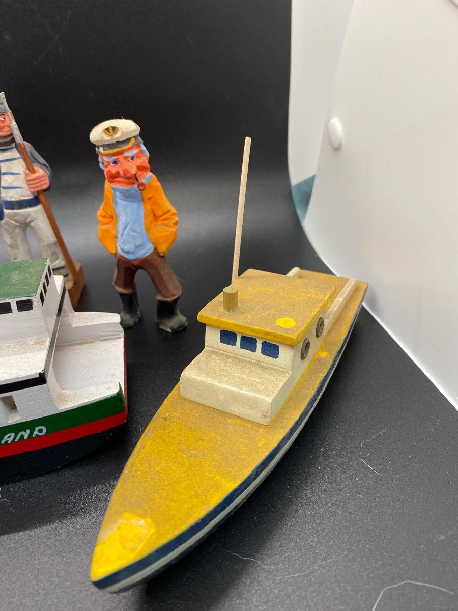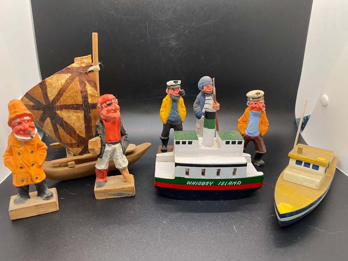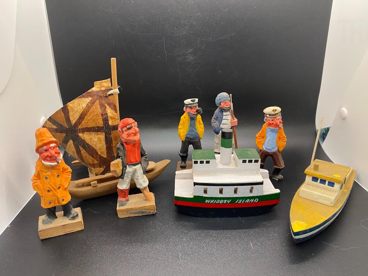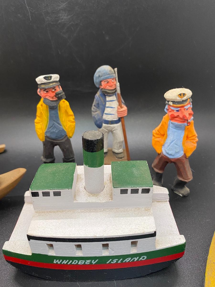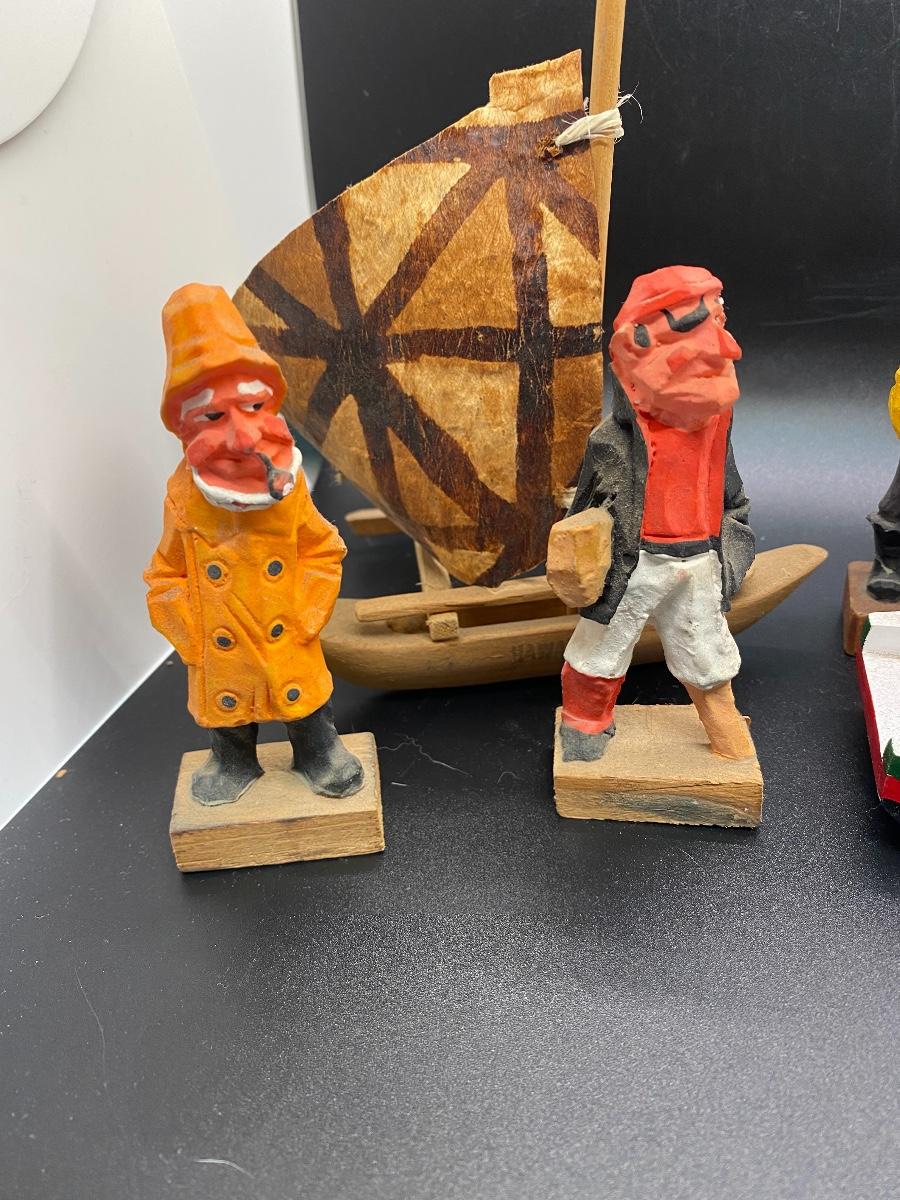 Set of 5 wood boat captain figurines and 3 boats. Look like the figurines might be handmade, unsure by who but previous owner was crafty. A little over 4" tall.
