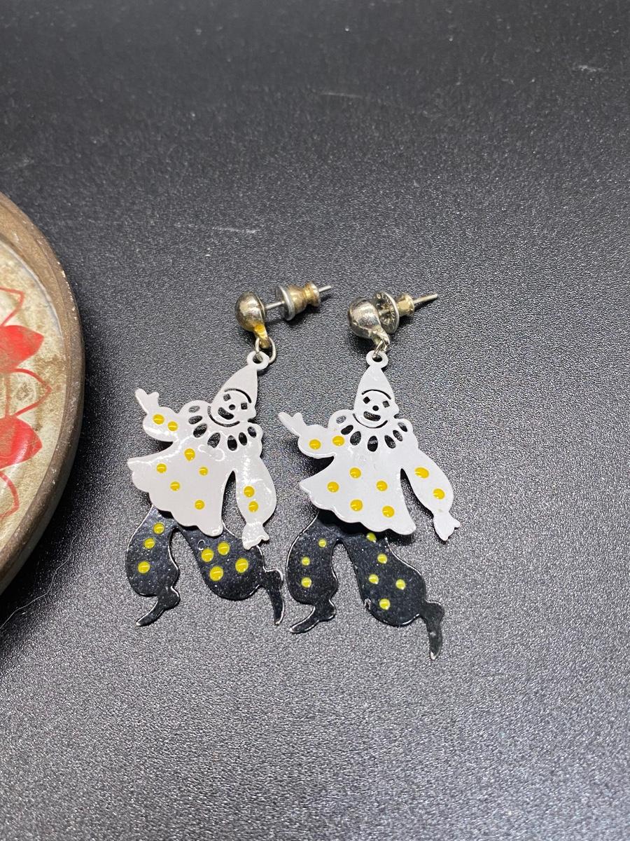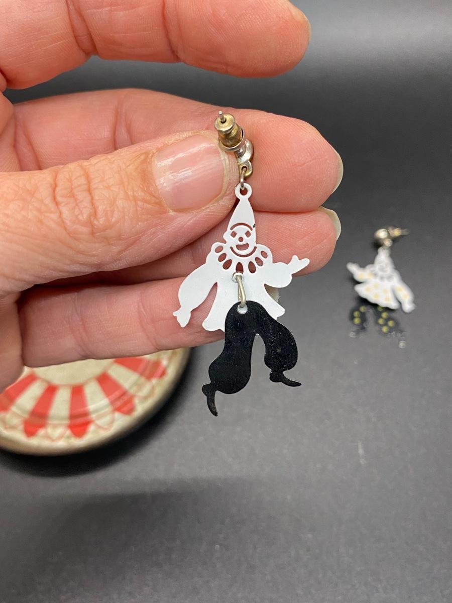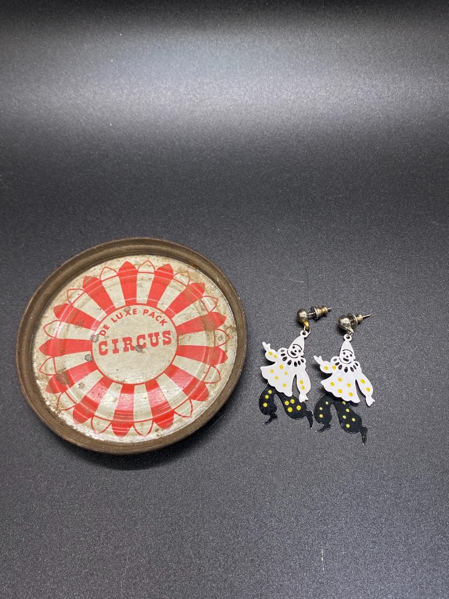 Pair of dangling circus clown earrings and a vintage circus themed tin piece. Earrings are for pierced ears, black and white with yellow spots, they are articulated so the legs move separate from the top. The Circus tin piece looks like it may have been a lid to a tin. Works great for a shallow trinket dish or drink coaster.