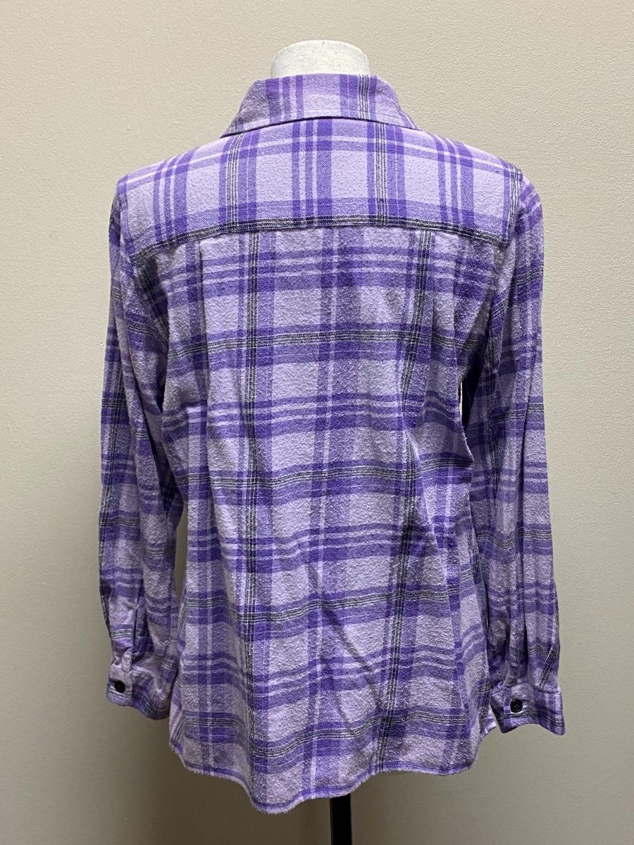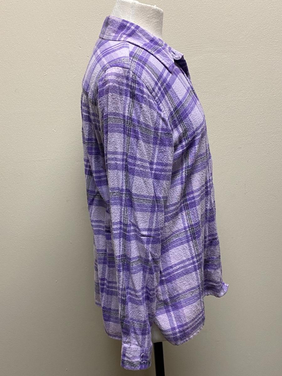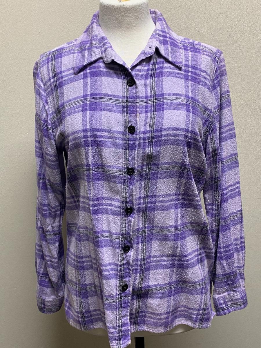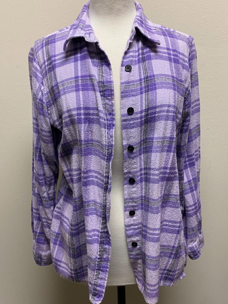 Purple and black plaid flannel shirt. Slightly worn but soft. No holes. Small spot near buttonhole. Size large but looks like it runs small.