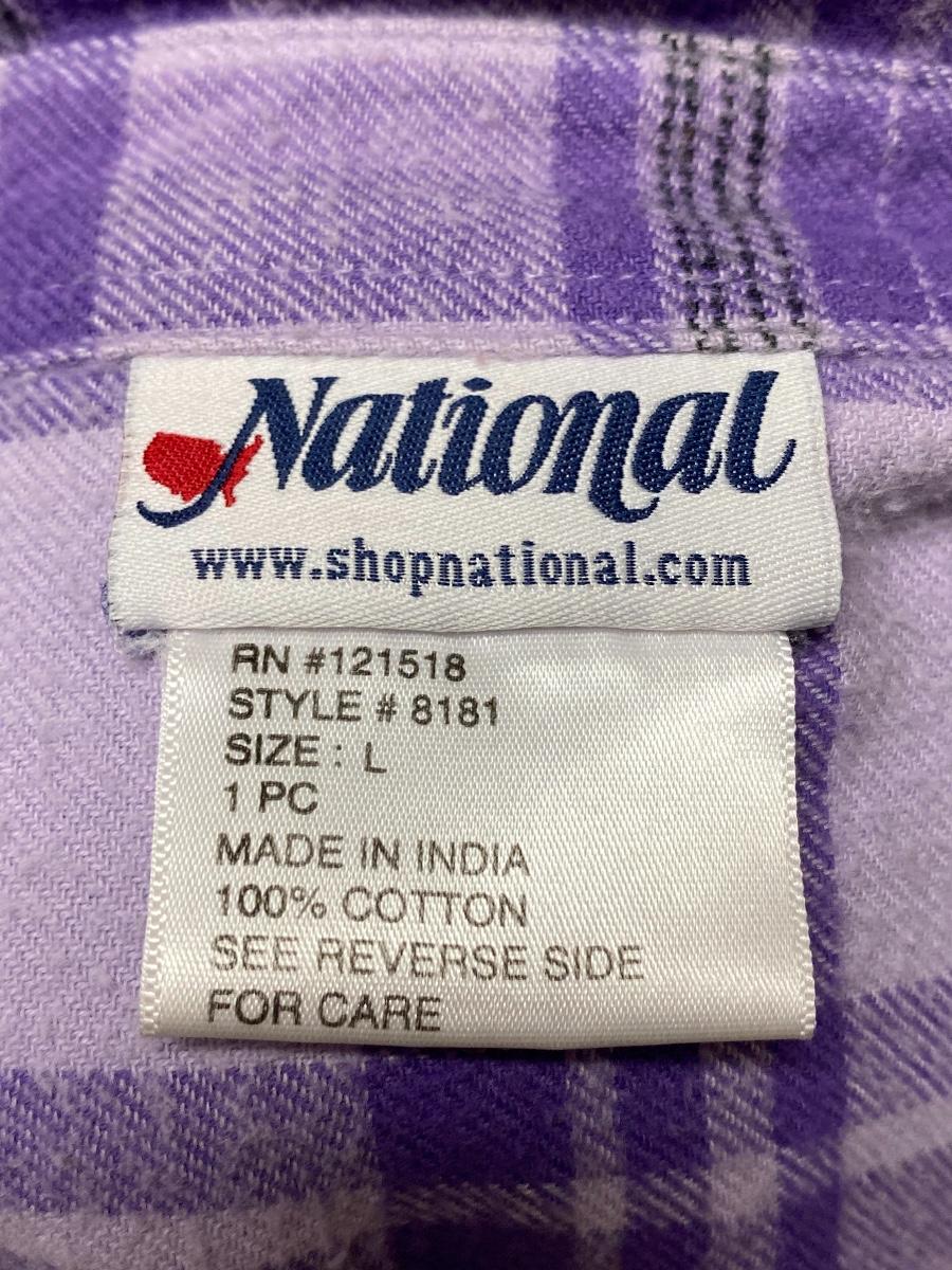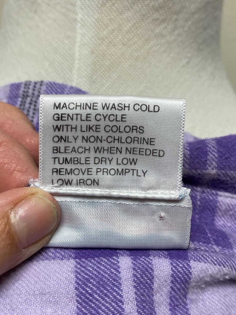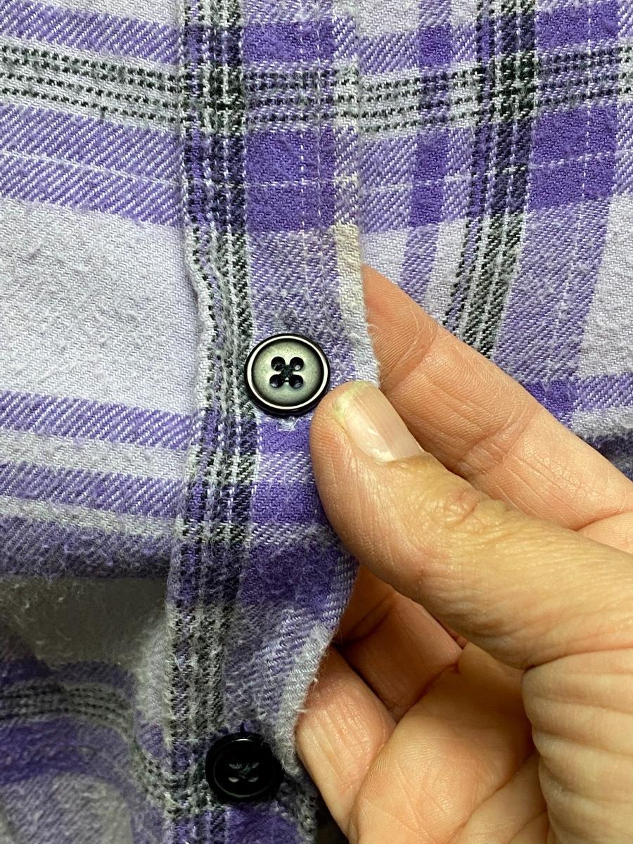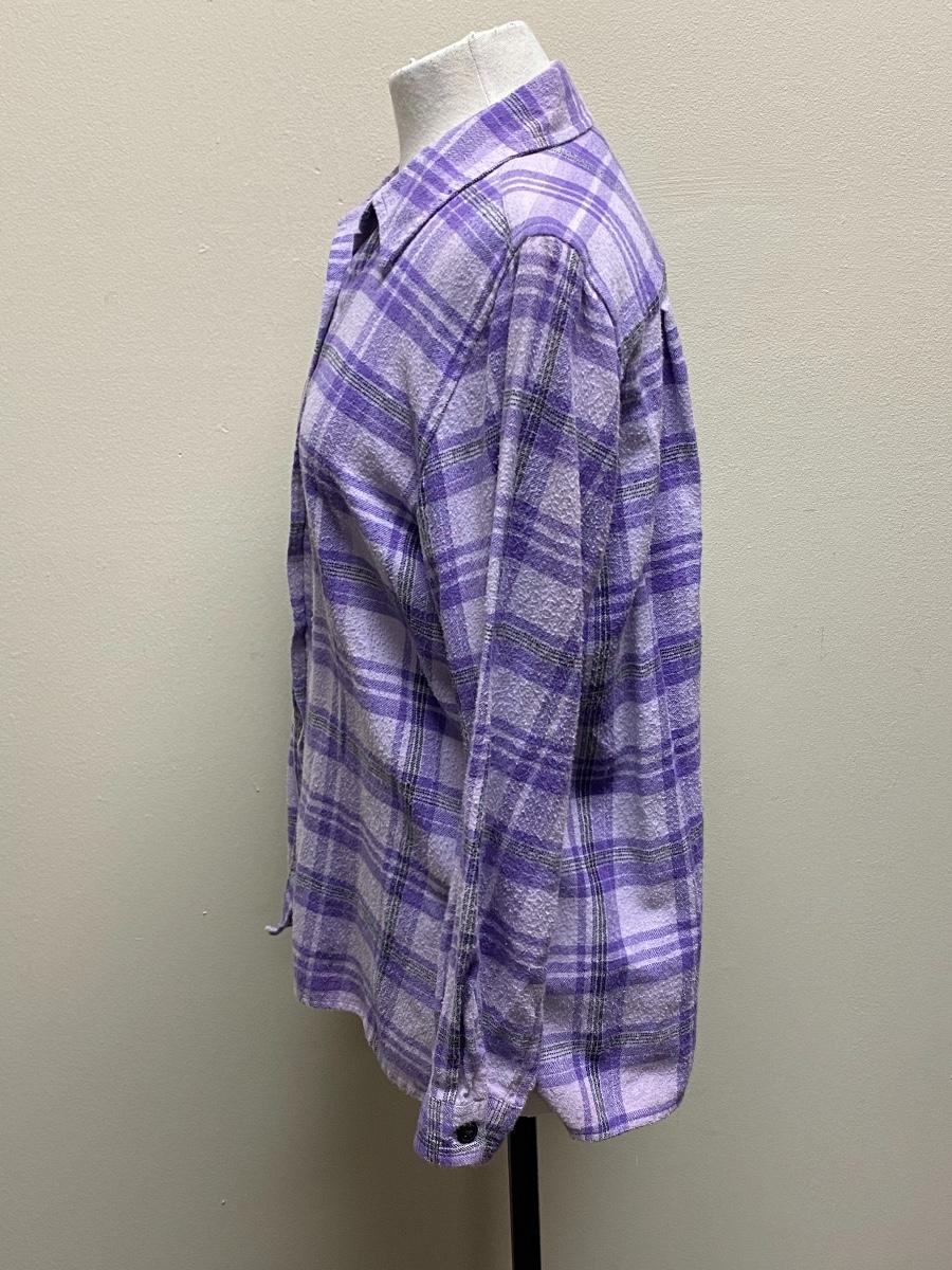 Purple and black plaid flannel shirt. Slightly worn but soft. No holes. Small spot near buttonhole. Size large but looks like it runs small.