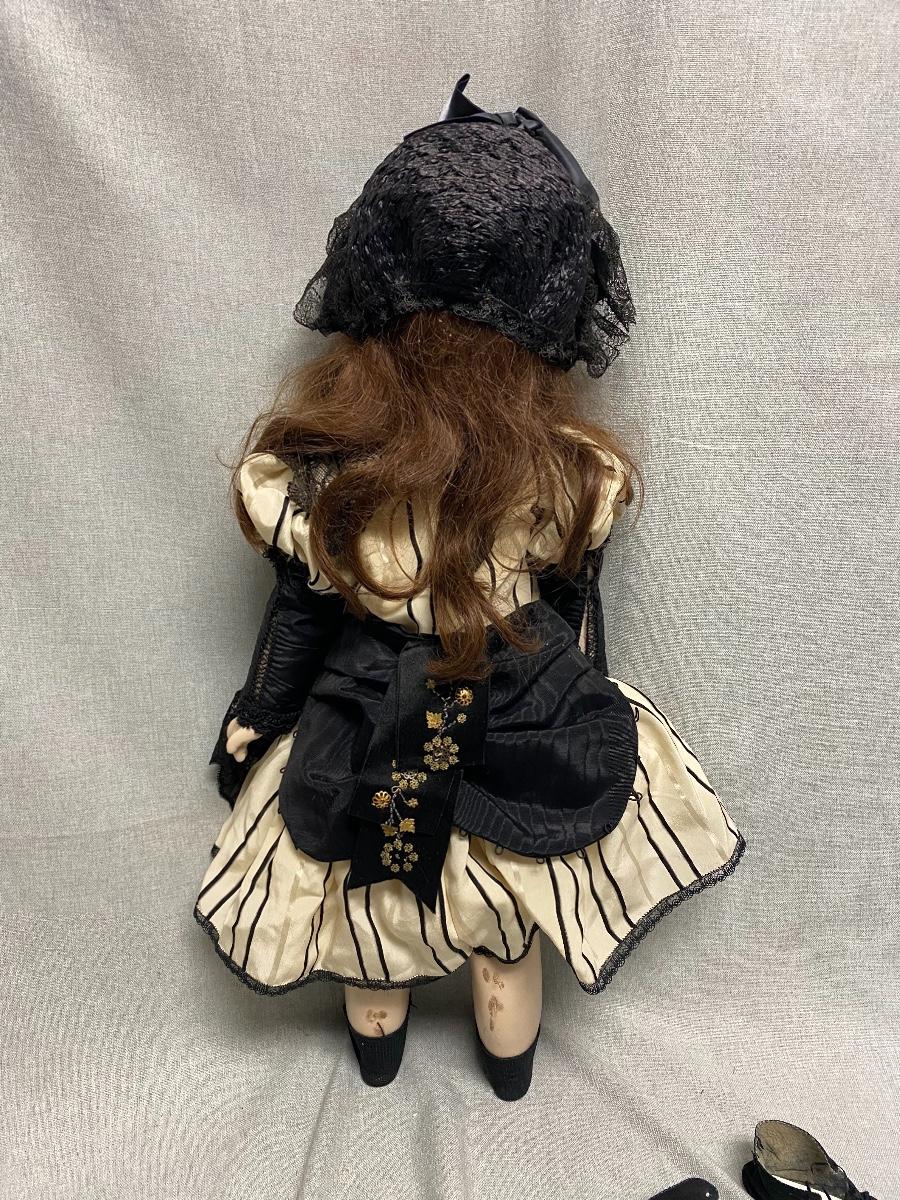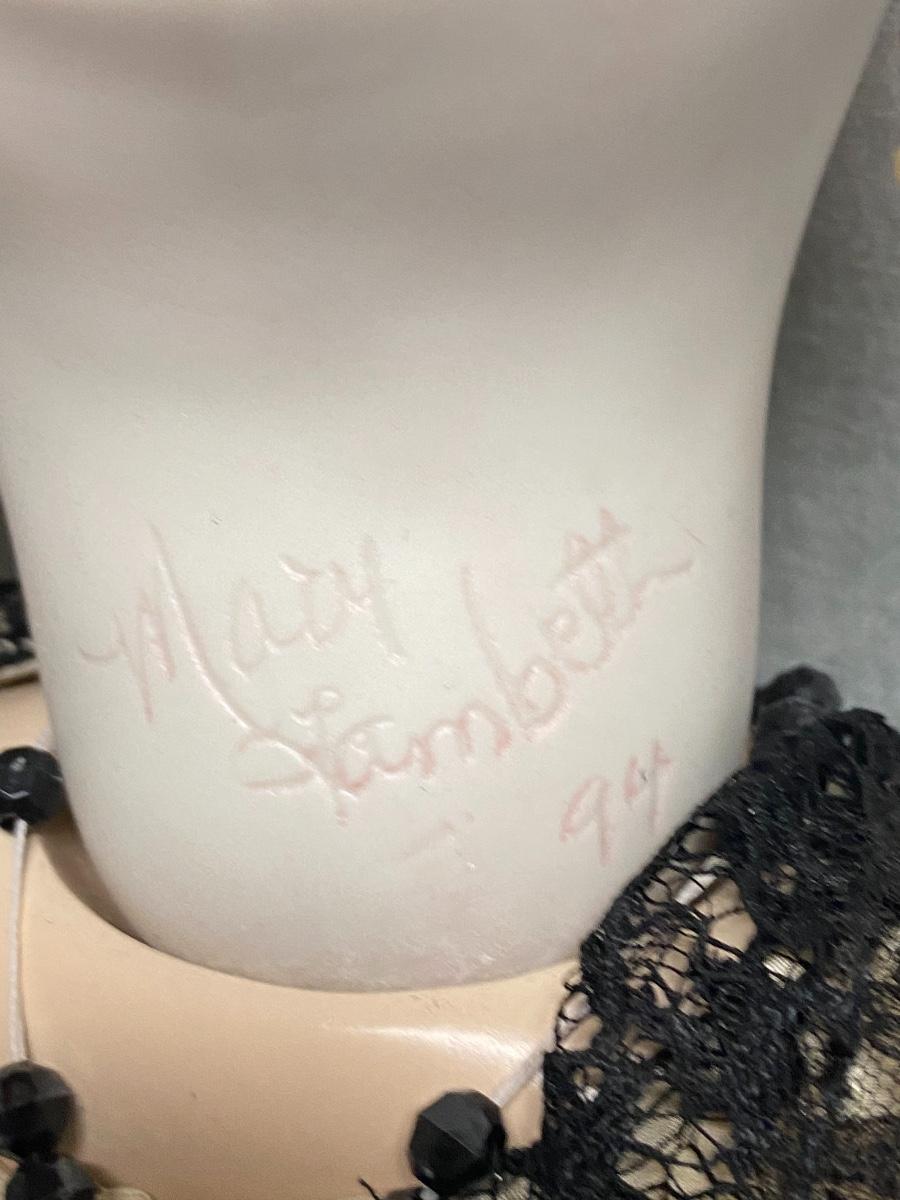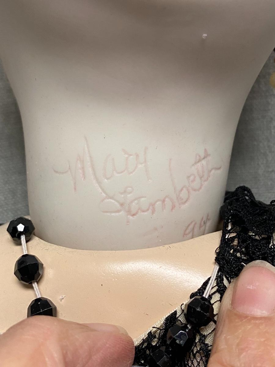 Pale face bisque and composite doll from Mary Lambeth. Dated 1994. Pale face with fixed blue eyes and rosy cheeks. Black lace dress. About 24" size. In good condition, there is some smudges on legs.