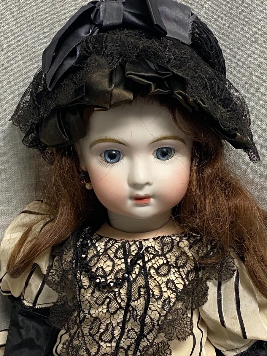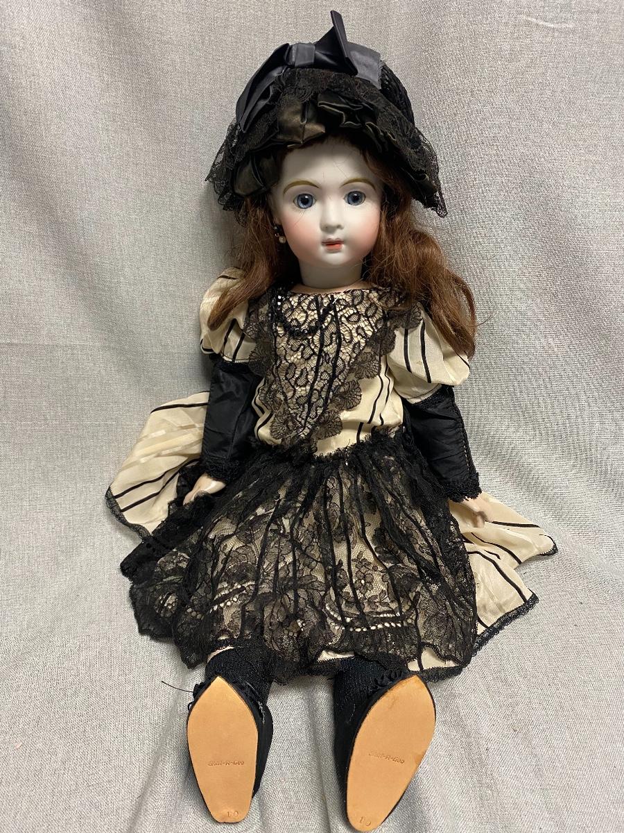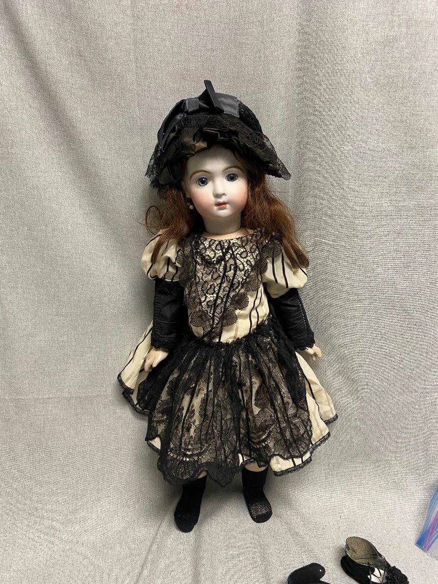 Pale face bisque and composite doll from Mary Lambeth. Dated 1994. Pale face with fixed blue eyes and rosy cheeks. Black lace dress. About 24" size. In good condition, there is some smudges on legs.