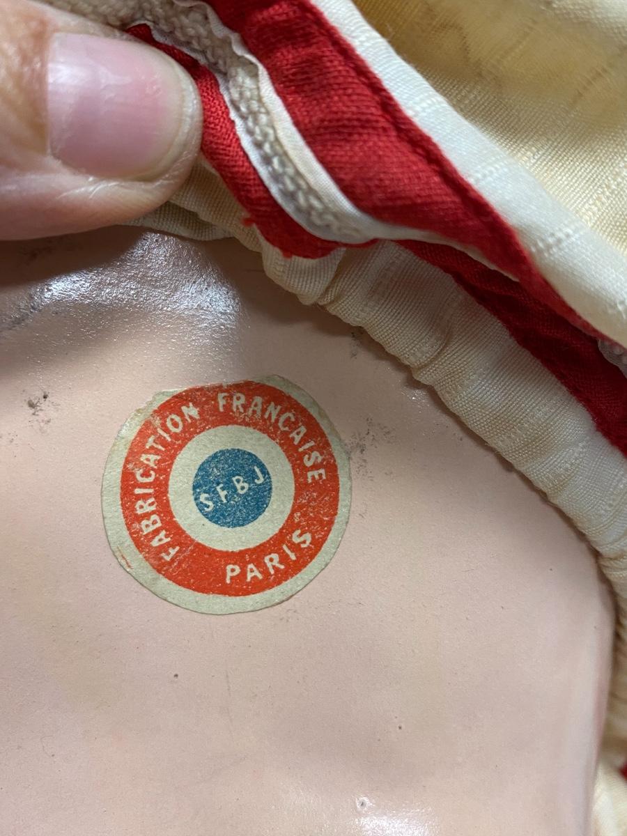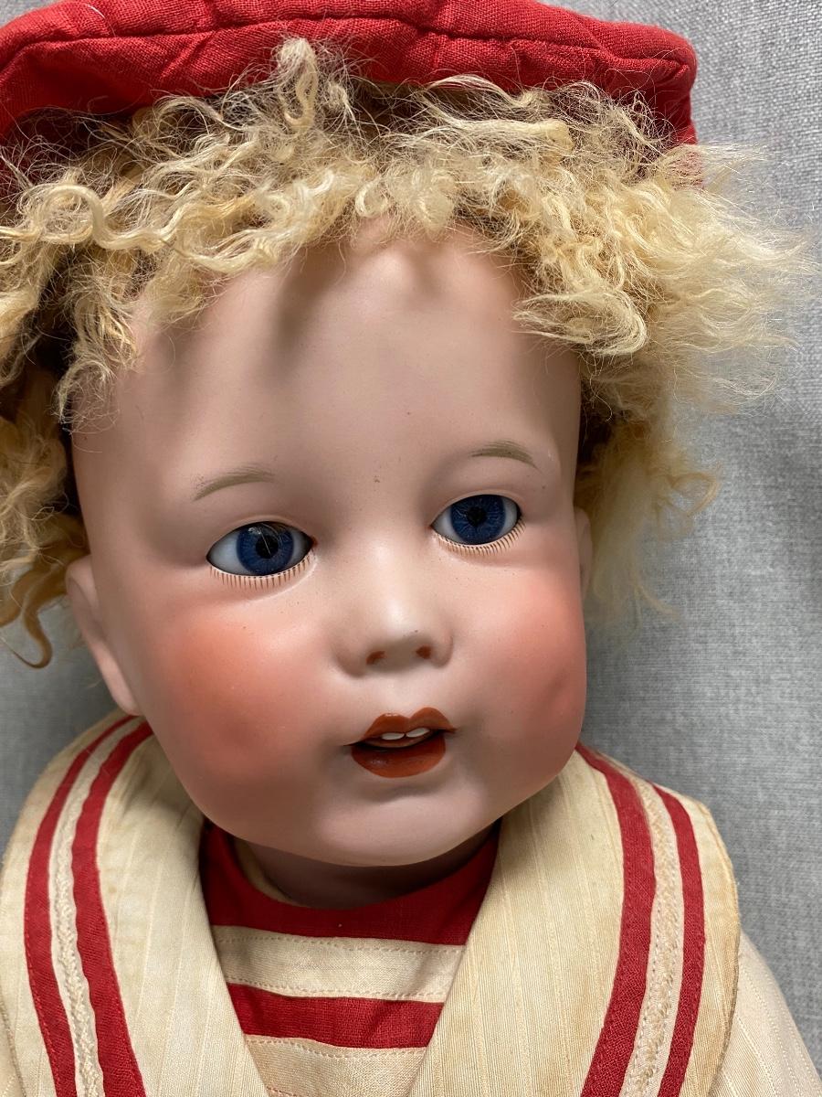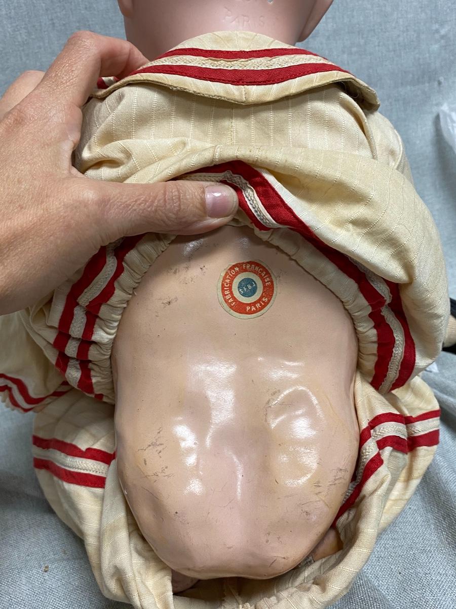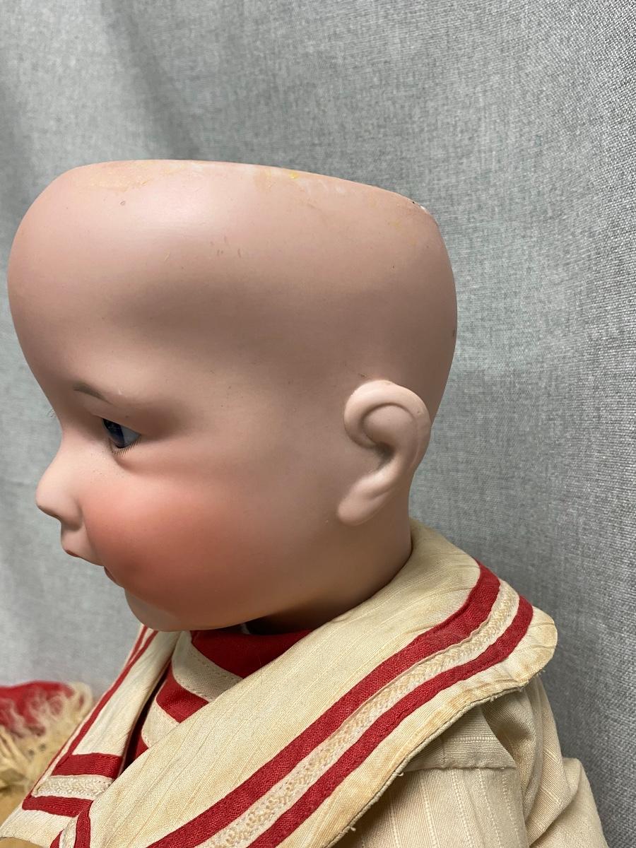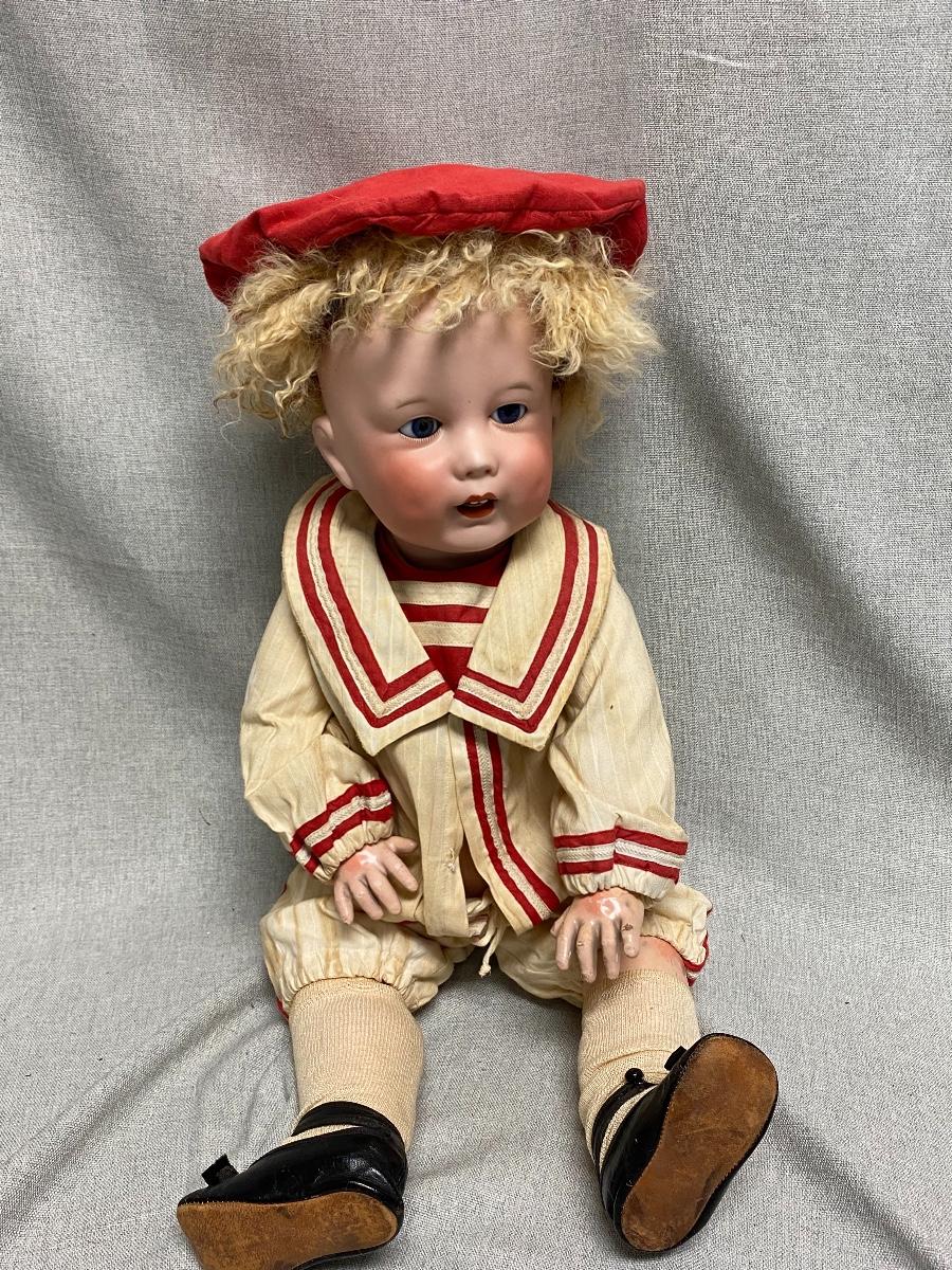 Antique SFBJ bisque and composite boy doll. Head is marked 21 SFBJ 251 Paris 11. Sleepy eyed, moving tongue in open mouth with teeth. Composite body is original SFBJ body, there is a worn logo sticker on the back. Mohair wig is in not great condition and the Red and white sailor outfit is discolored. In overall good condition with wear in the composite that would be normal for the age. About 24" size.