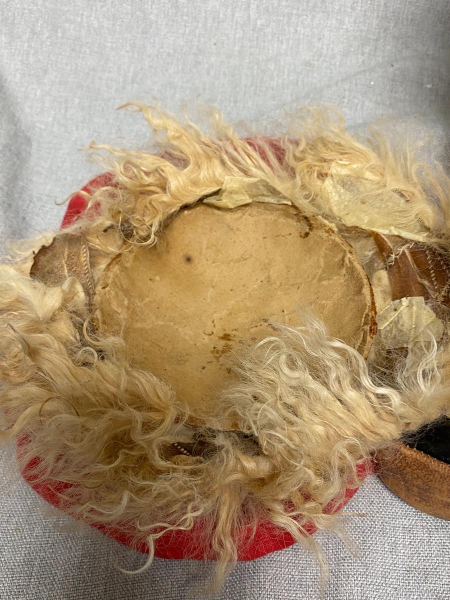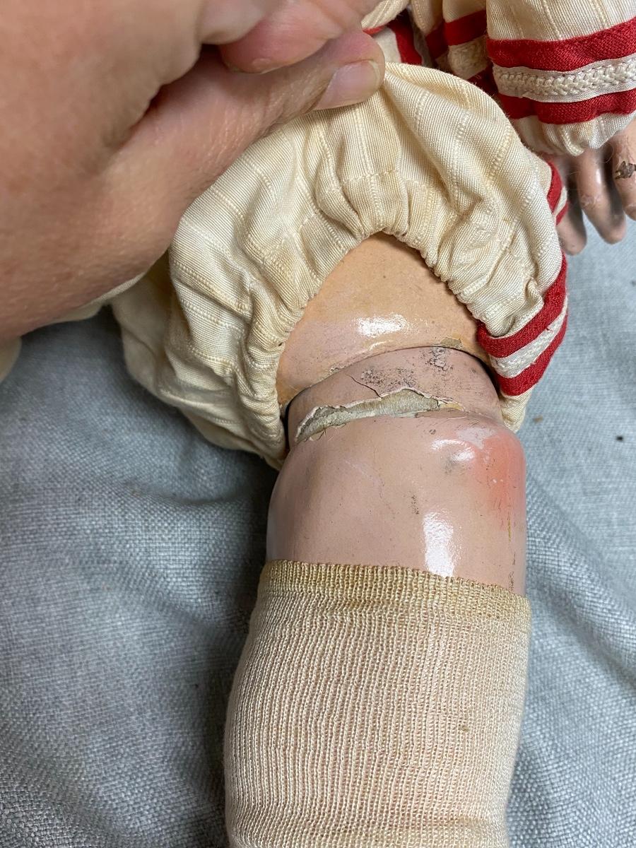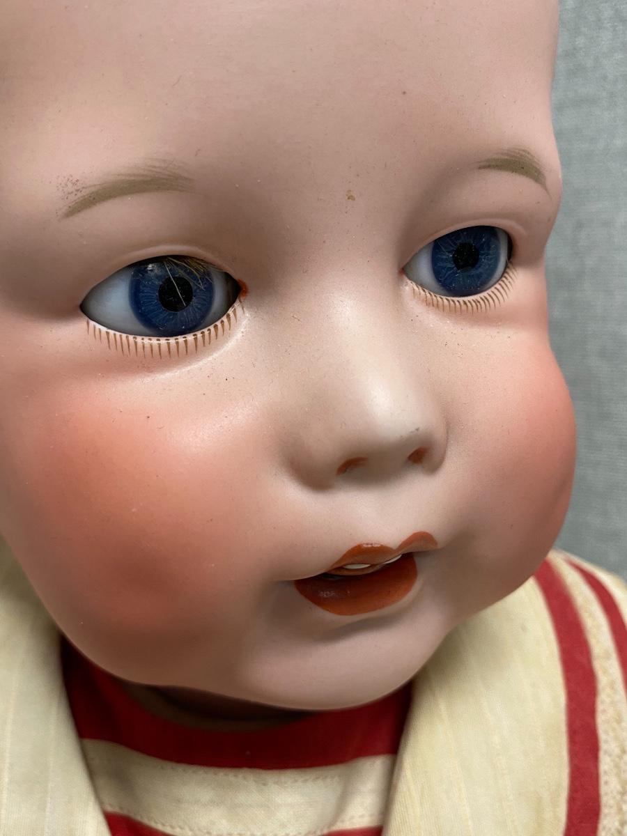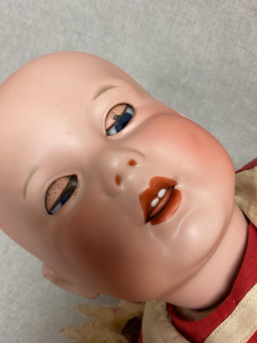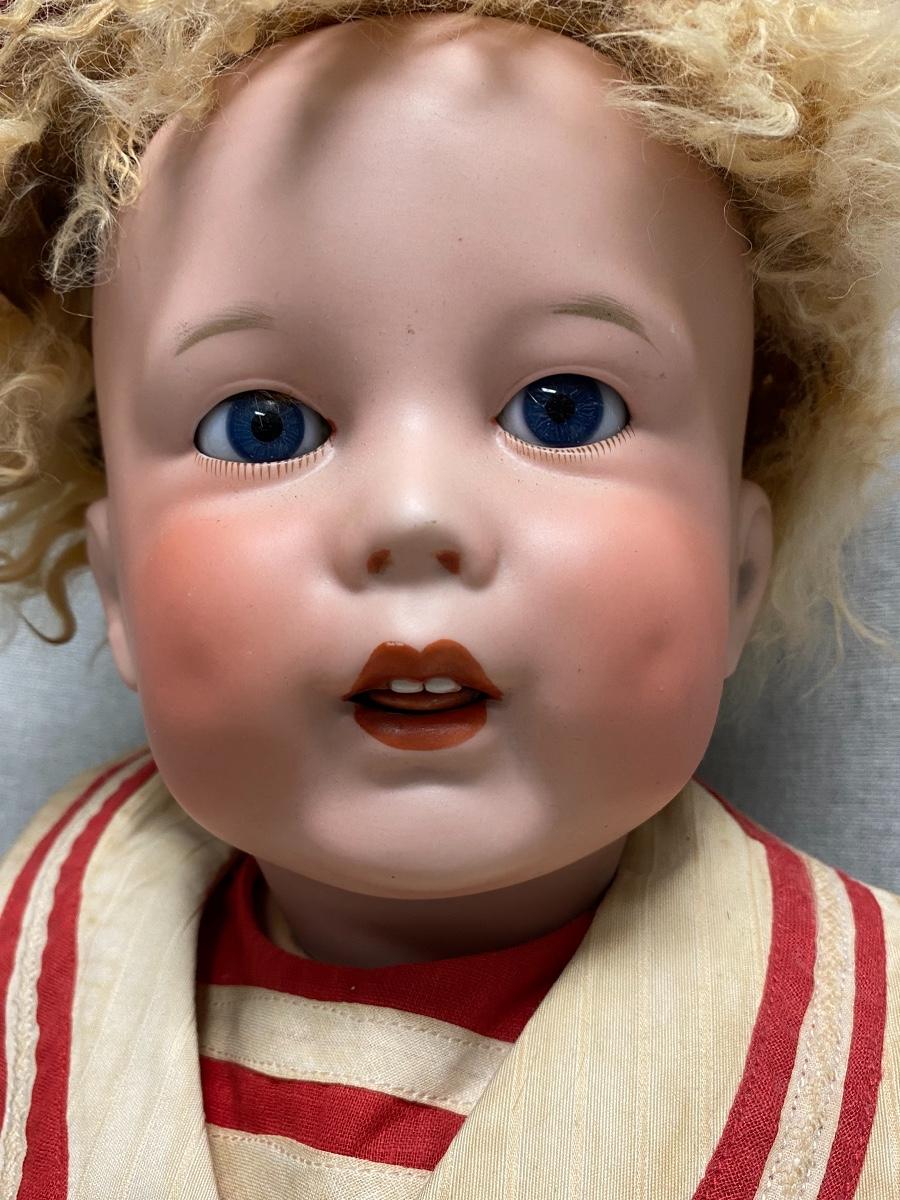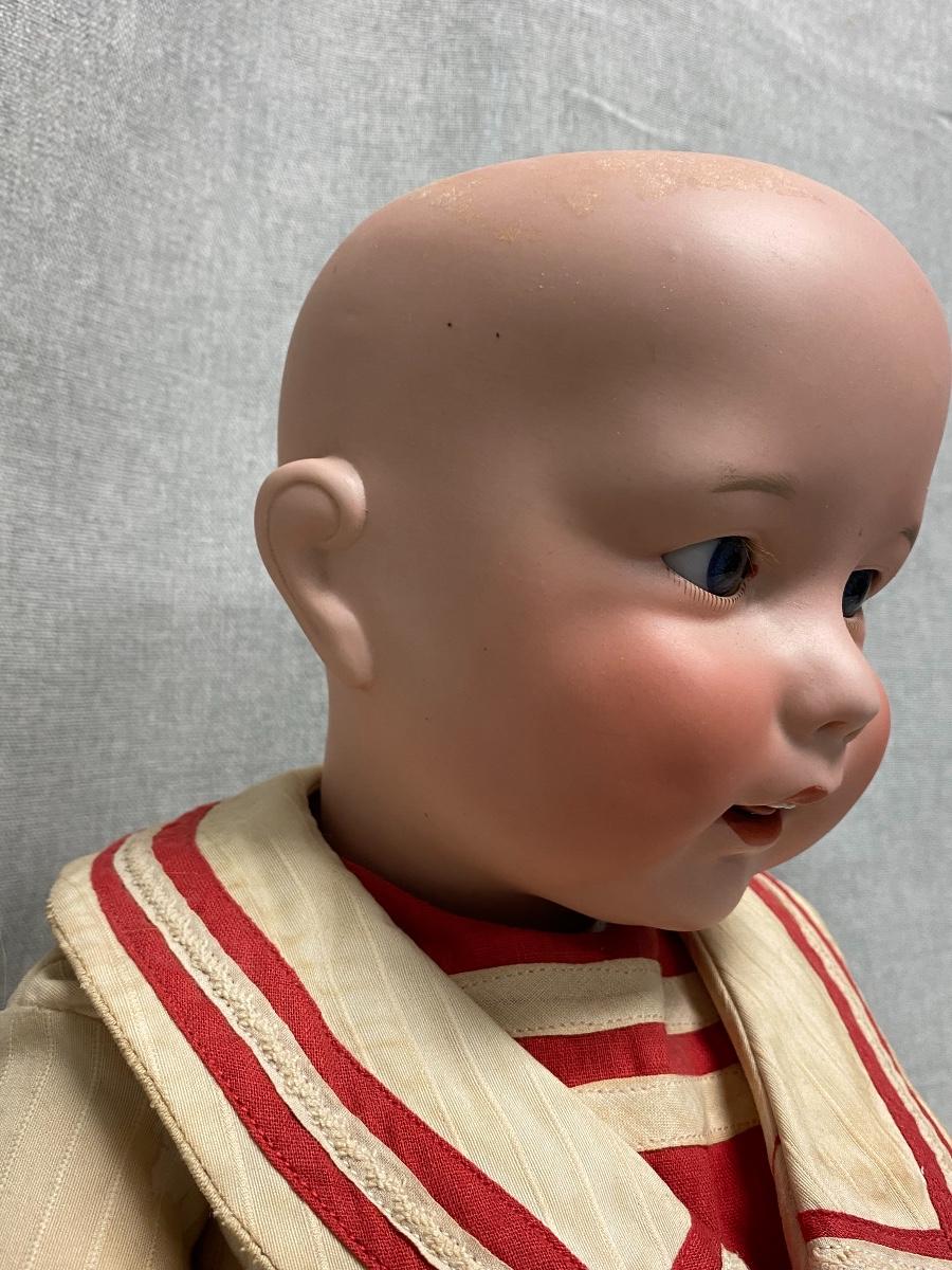 Antique SFBJ bisque and composite boy doll. Head is marked 21 SFBJ 251 Paris 11. Sleepy eyed, moving tongue in open mouth with teeth. Composite body is original SFBJ body, there is a worn logo sticker on the back. Mohair wig is in not great condition and the Red and white sailor outfit is discolored. In overall good condition with wear in the composite that would be normal for the age. About 24" size.