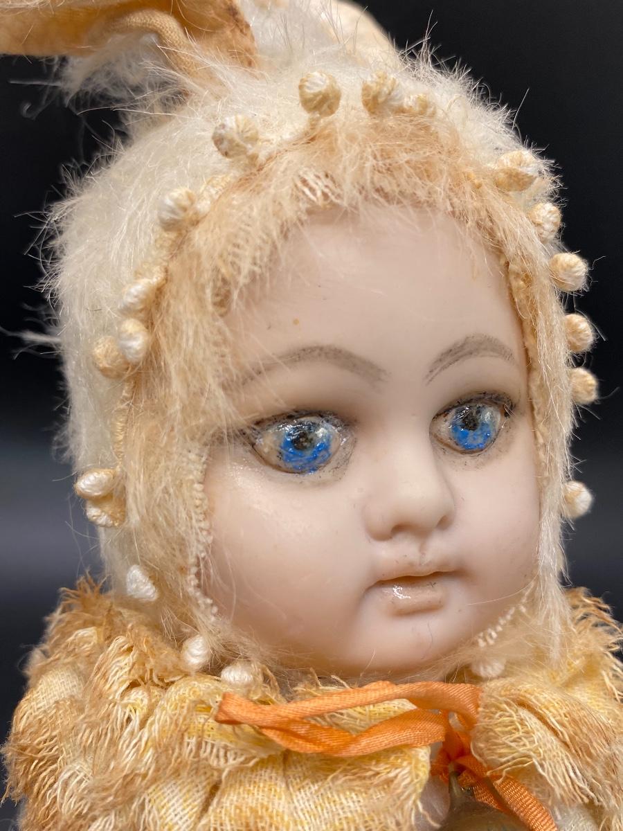 Rabbit costume art doll. Jointed at the shoulders and hips. Rabbit outfit does not come off it is the body. Vinyl face looks to be repainted. About 9" size. No tags or marks.