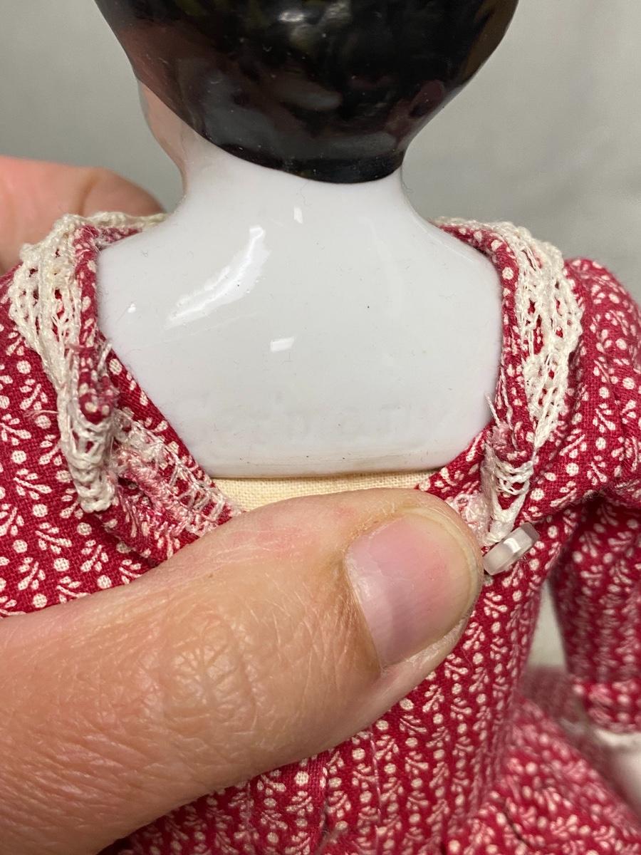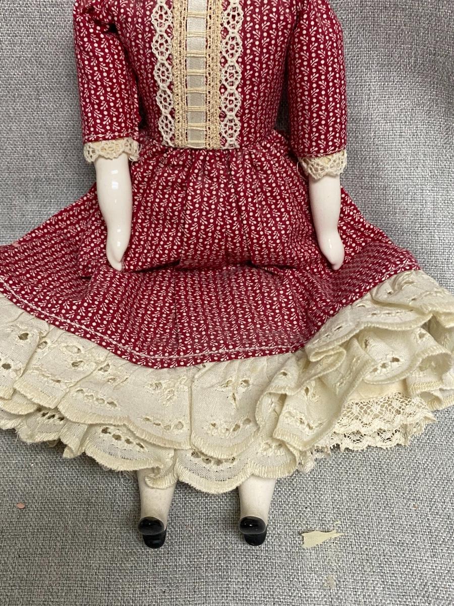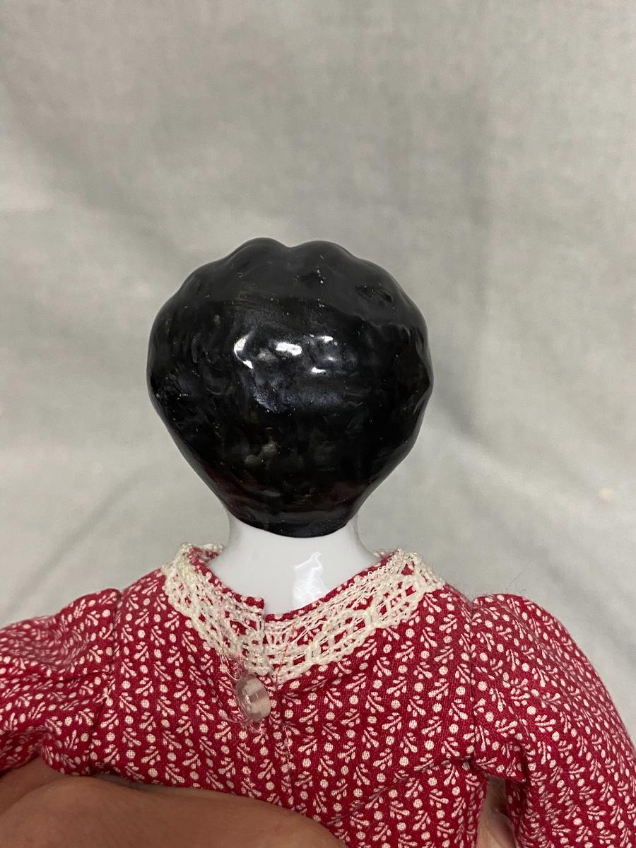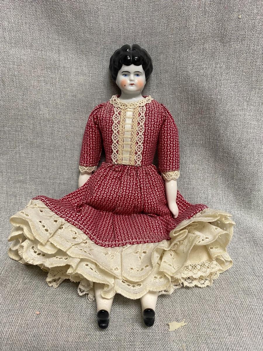 Vintage china head doll in red gingham dress. Porcelain limbs, Minimal paint wear. There is a tag inside dress for Marlene Patterson, but I believe she is a doll clothes maker. About 12" size.