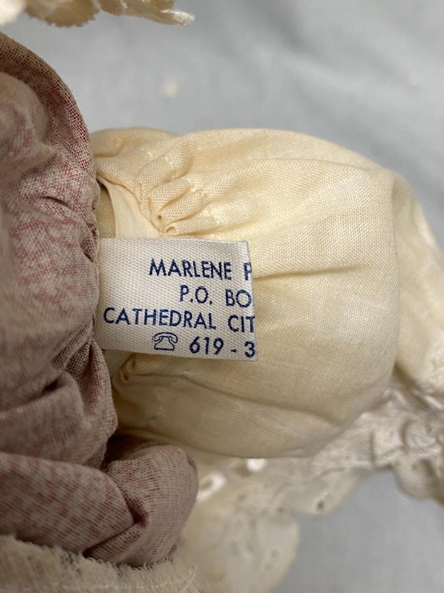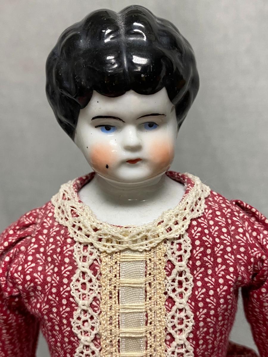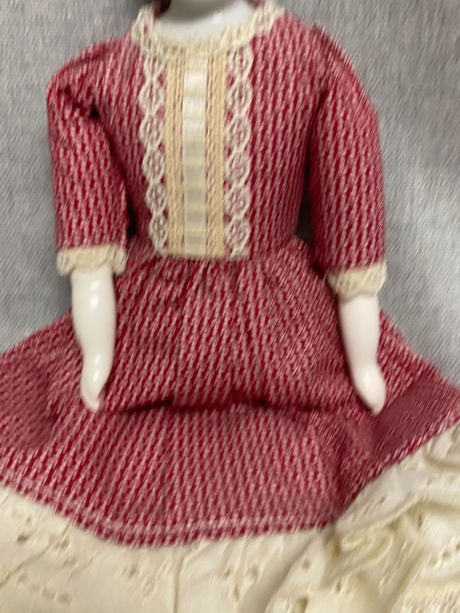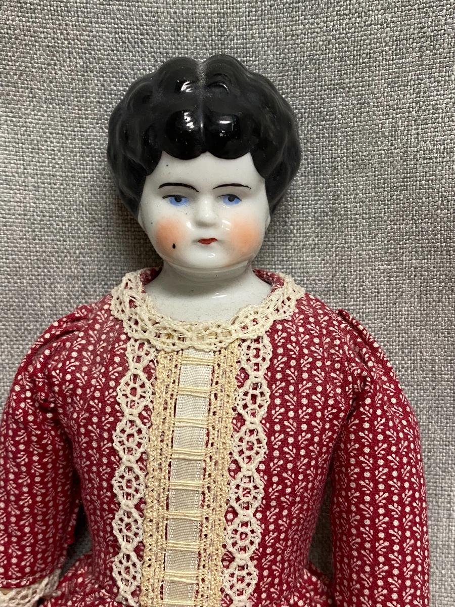 Vintage china head doll in red gingham dress. Porcelain limbs, Minimal paint wear. There is a tag inside dress for Marlene Patterson, but I believe she is a doll clothes maker. About 12" size.